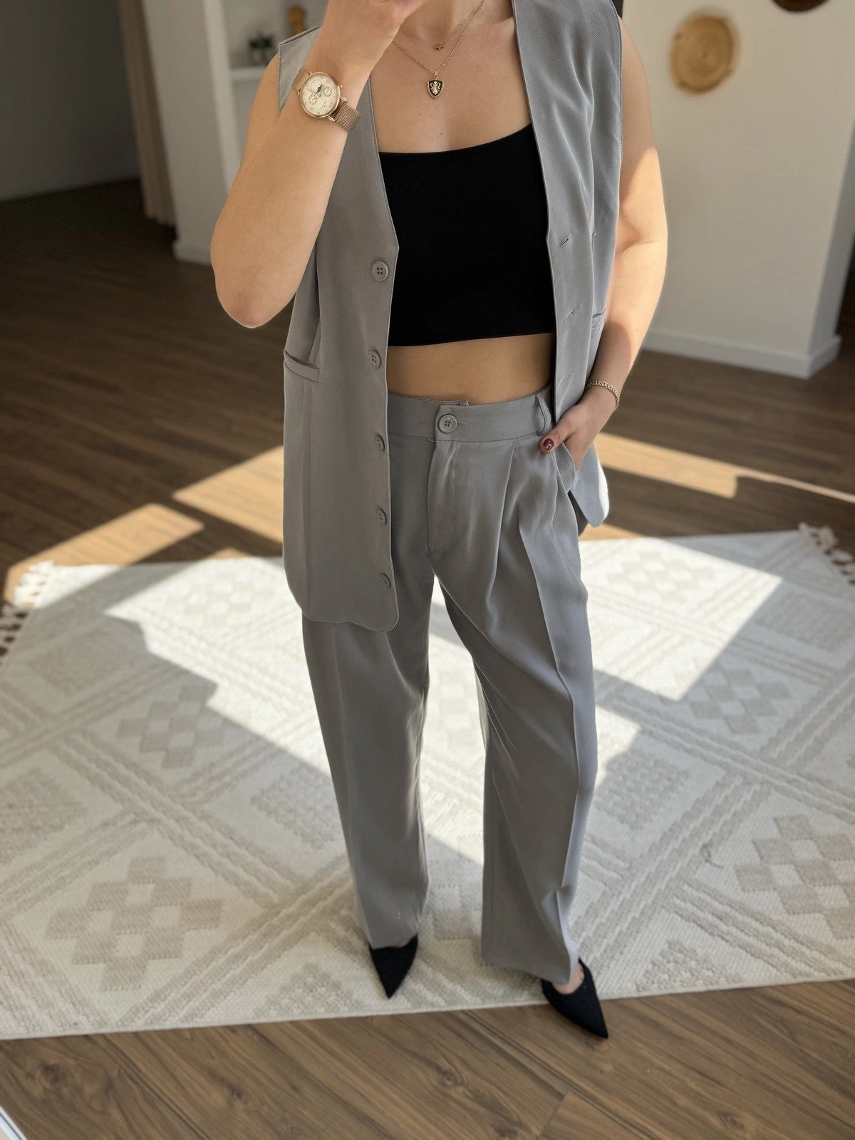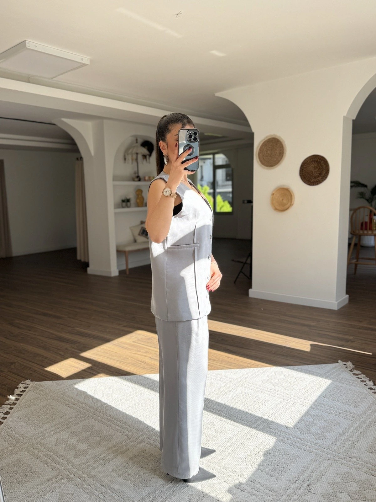 UZUN YELEK PALAZZO PANTOLON PAMUK TAKIM – GRİ