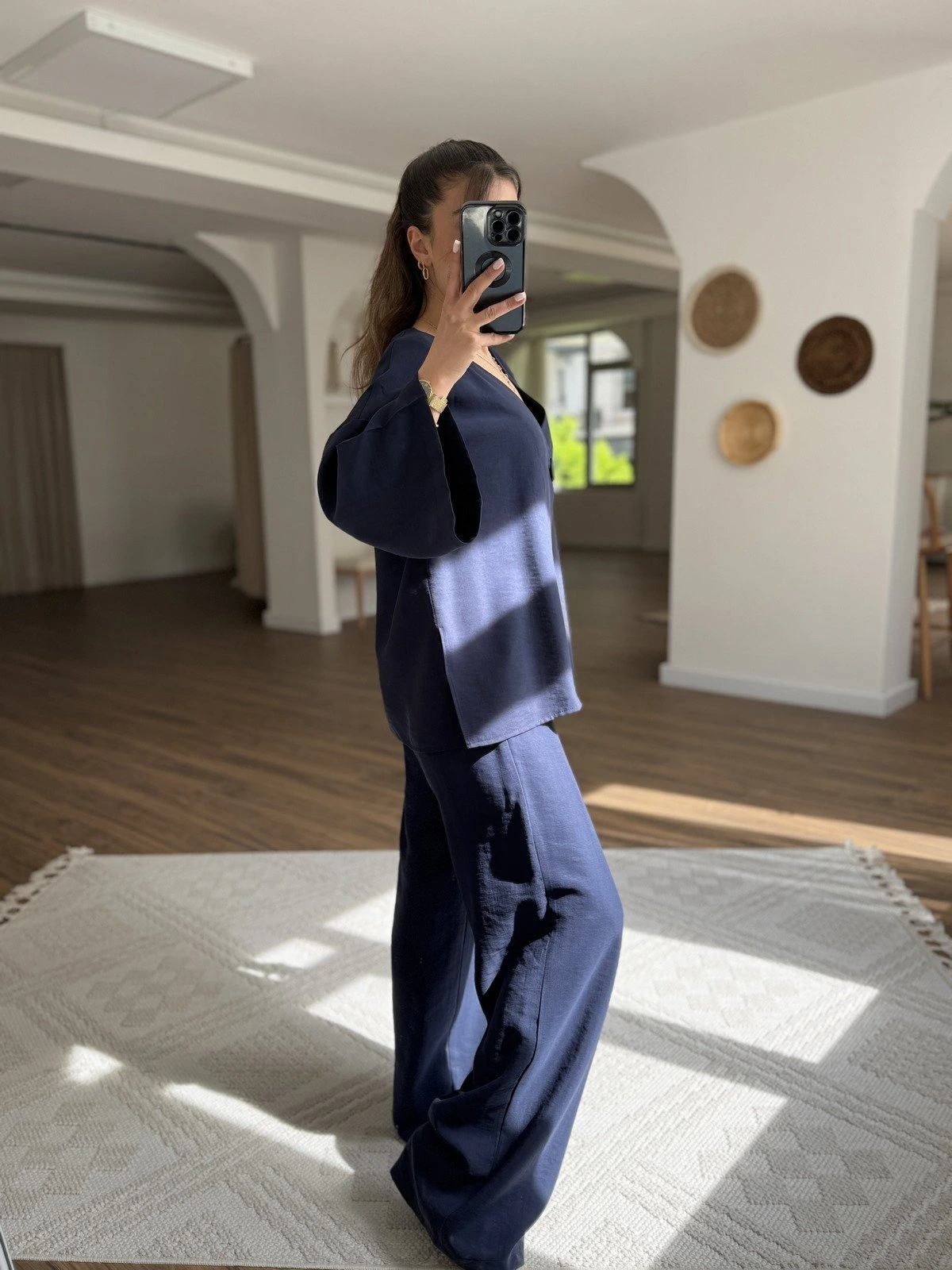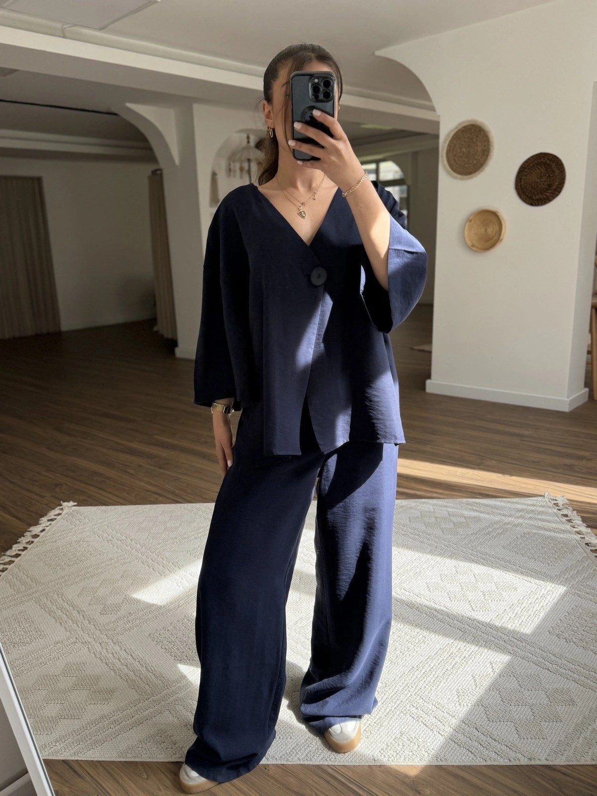 V YAKA TEK DÜĞME TRUVAKAR KOL BLUZ PANTOLON PAMUK TAKIM – LACİVERT