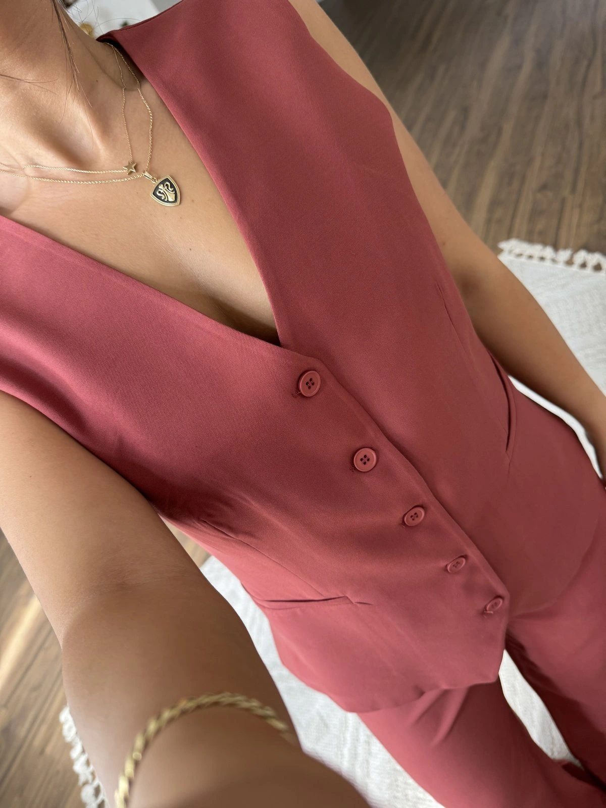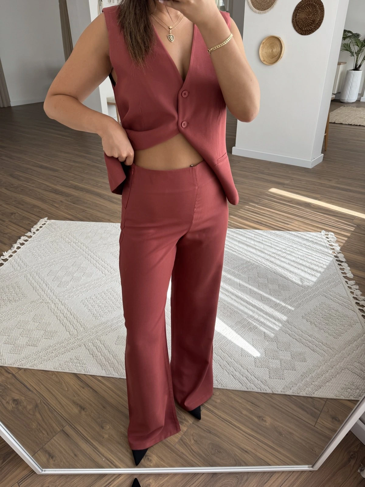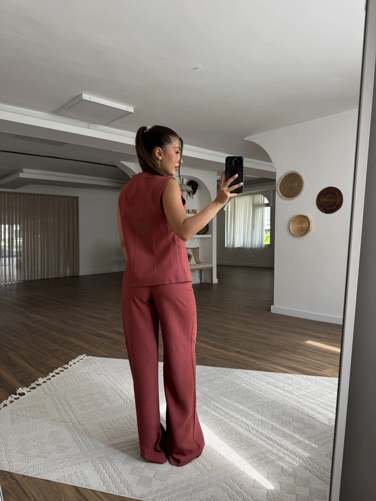 V YAKA YELEK PANTOLON TENSEL VİSKON TAKIM – KİREMİT