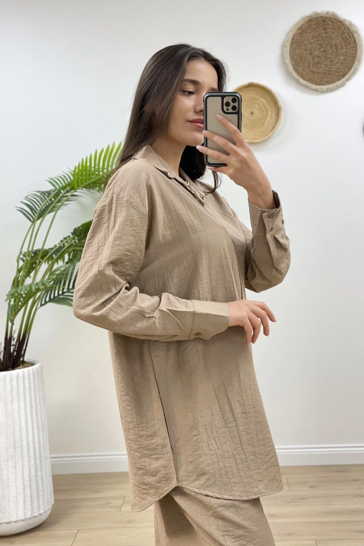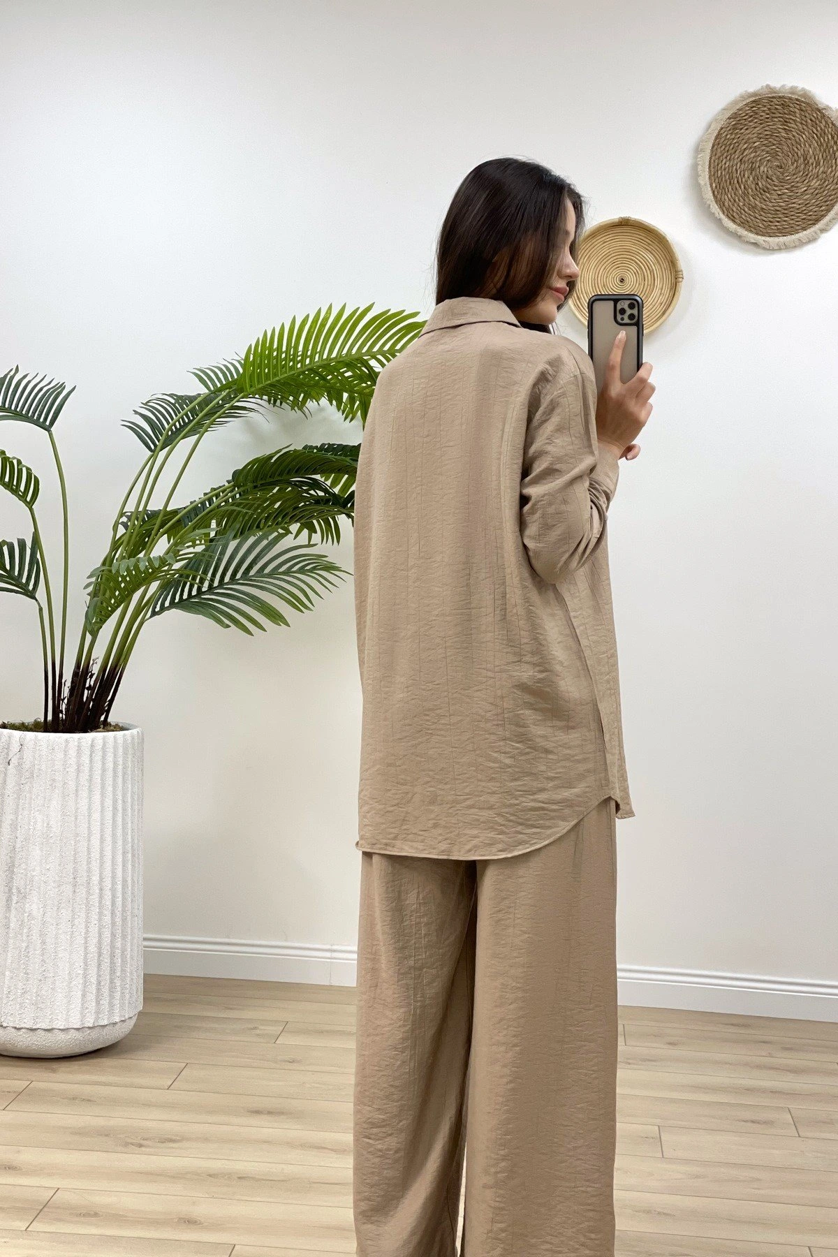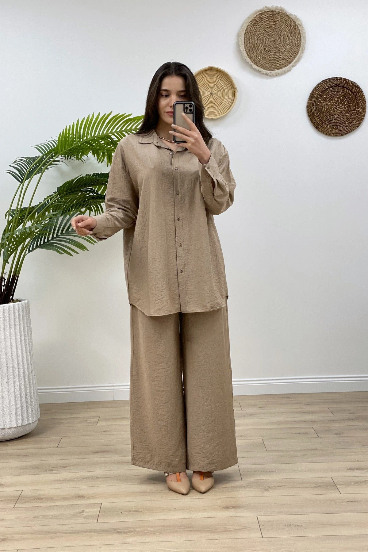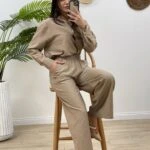 VİSKON GÖMLEK BOL PAÇA PANTOLON TAKIM – VİZON