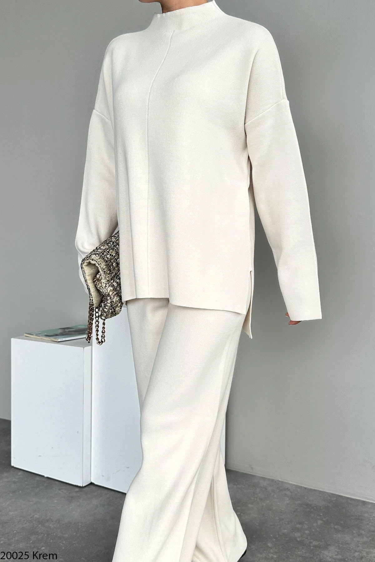 YAN YIRTMAÇ DİK YAKA TRİKO PANTOLON TAKIM – KREM