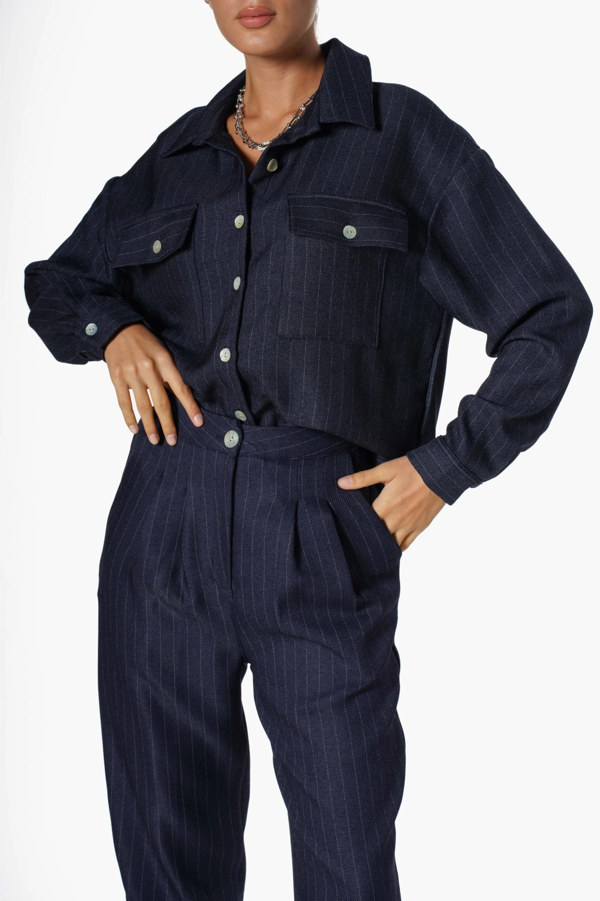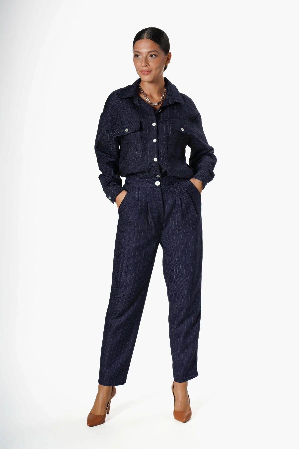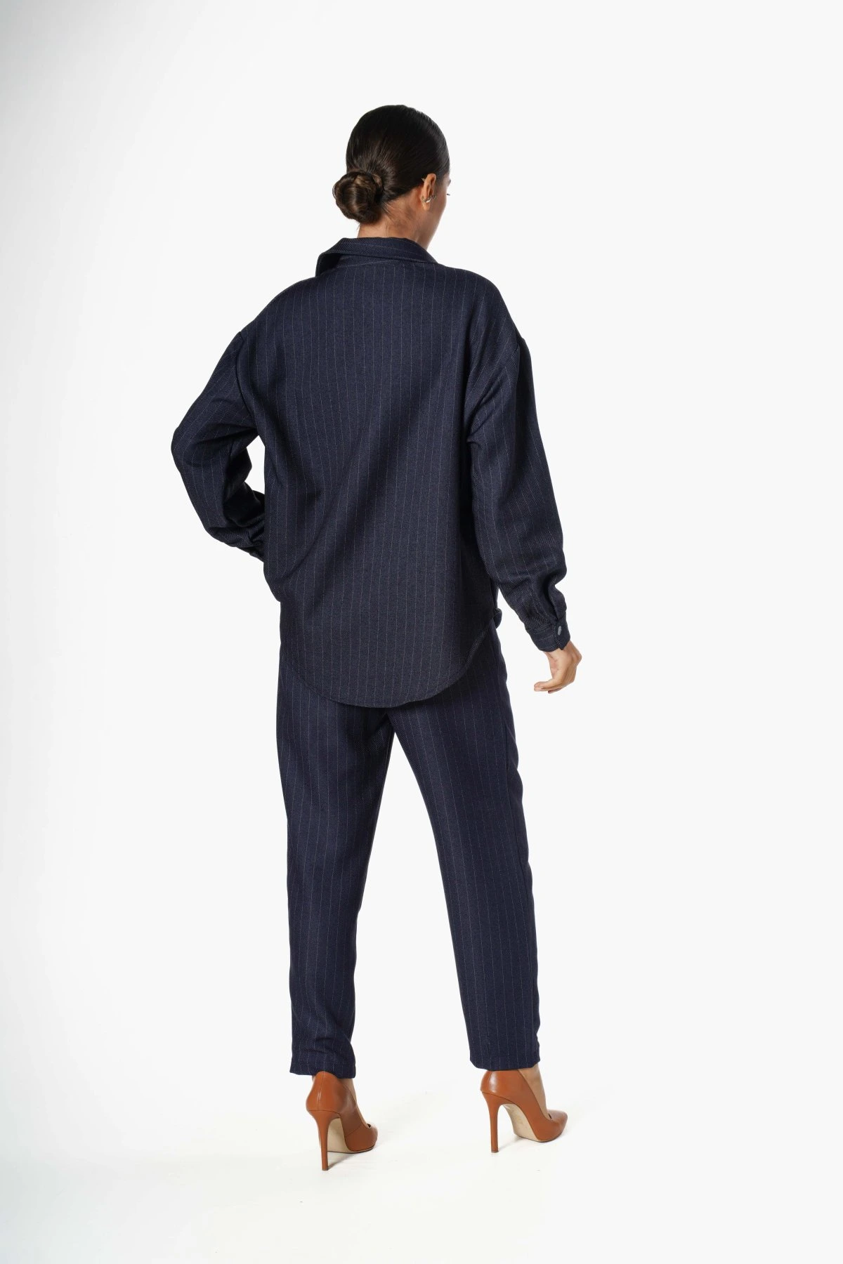 YÜN EFEKT ÇİZGİLİ ÇİFT PİLE PANTOLON GÖMLEK TAKIM – LACİVERT