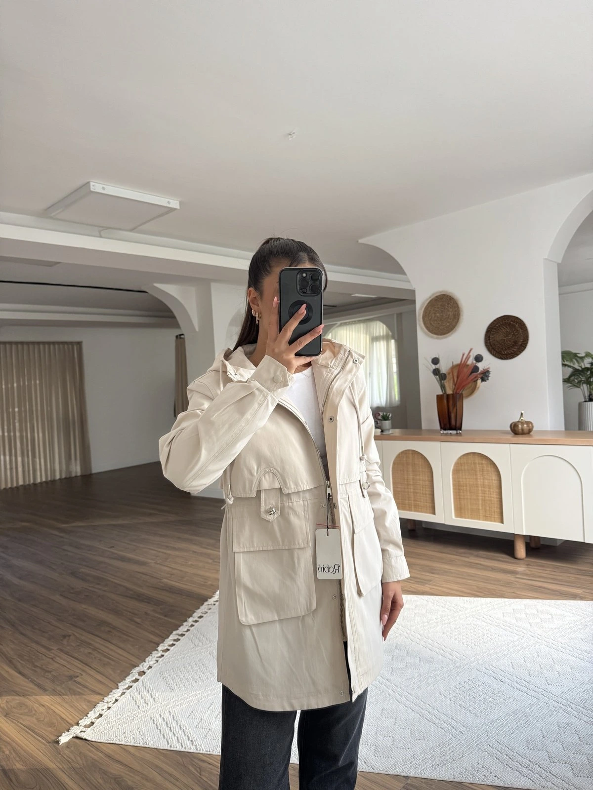KAPÜŞONLU BEL BÜZGÜ CEP DETAY VİSKON KISA TRENÇ – TAŞ
