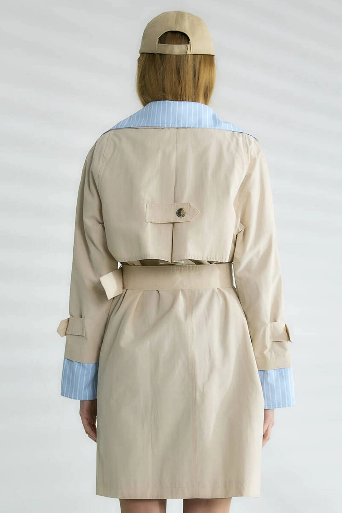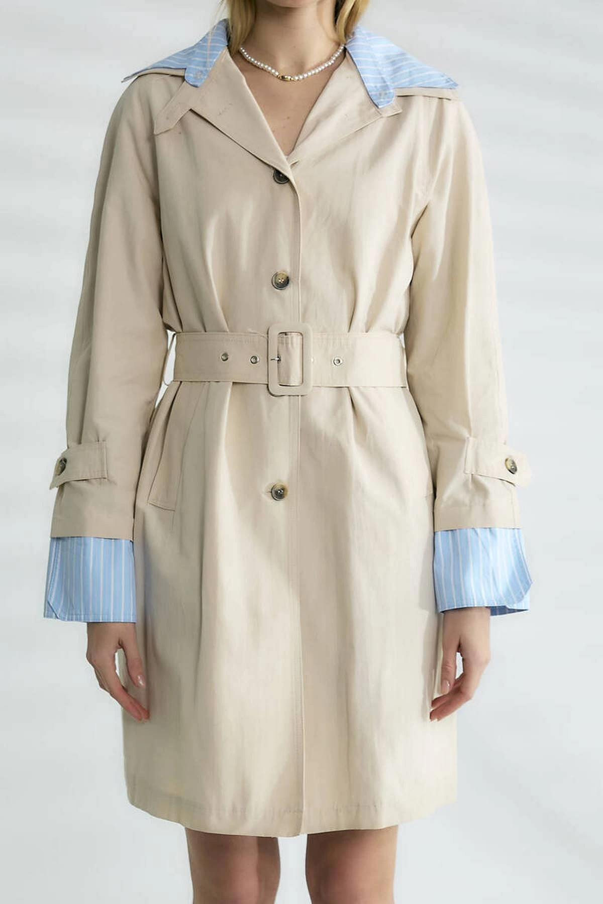 ÇİZGİ YAKA ÇIKARILABİLİR SIRT KAPAKLI KEMERLİ VİSKON TRENÇ – TAŞ