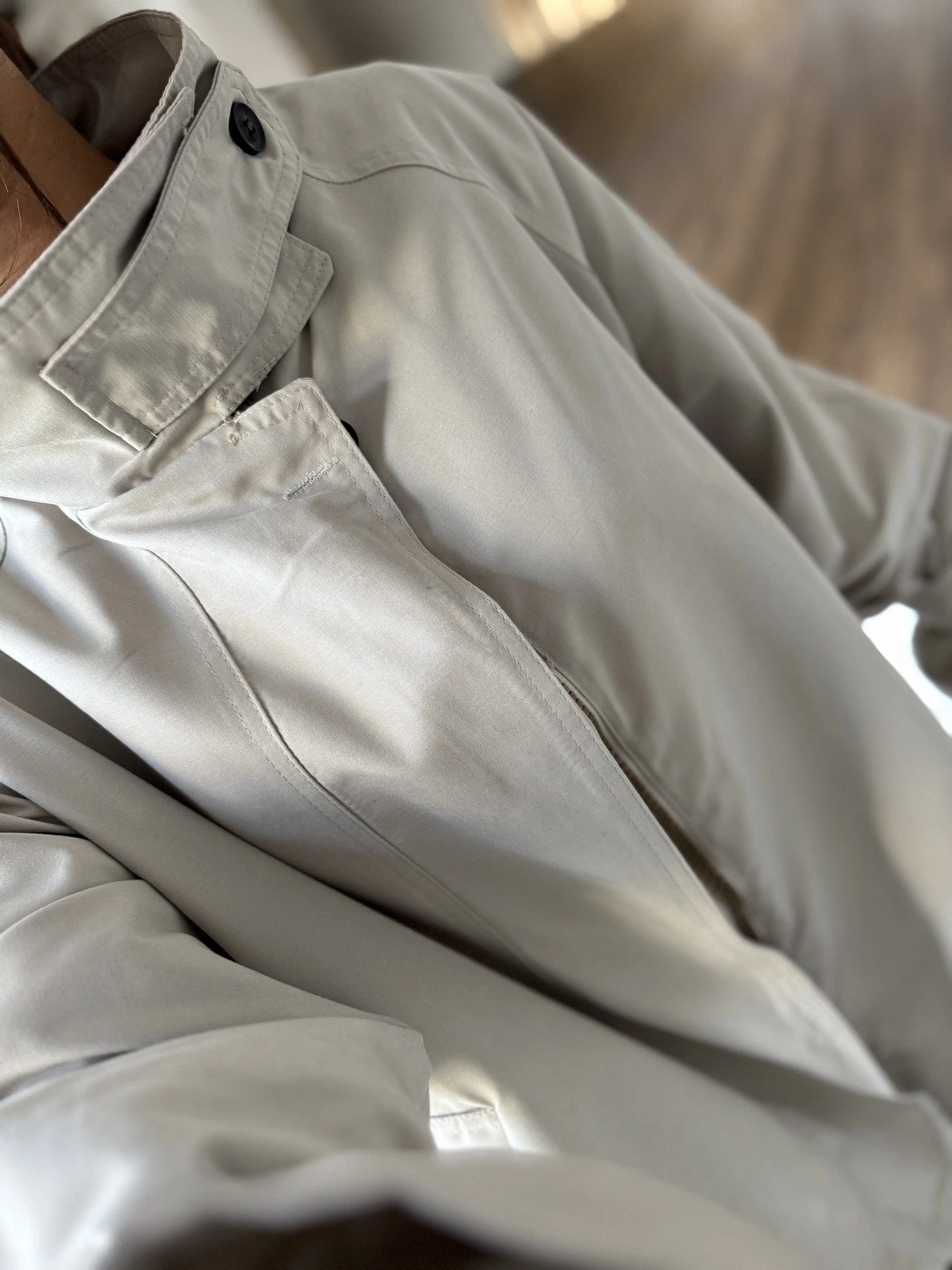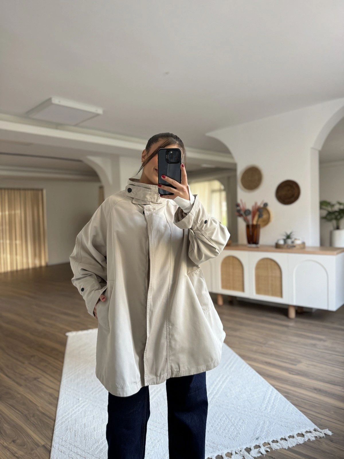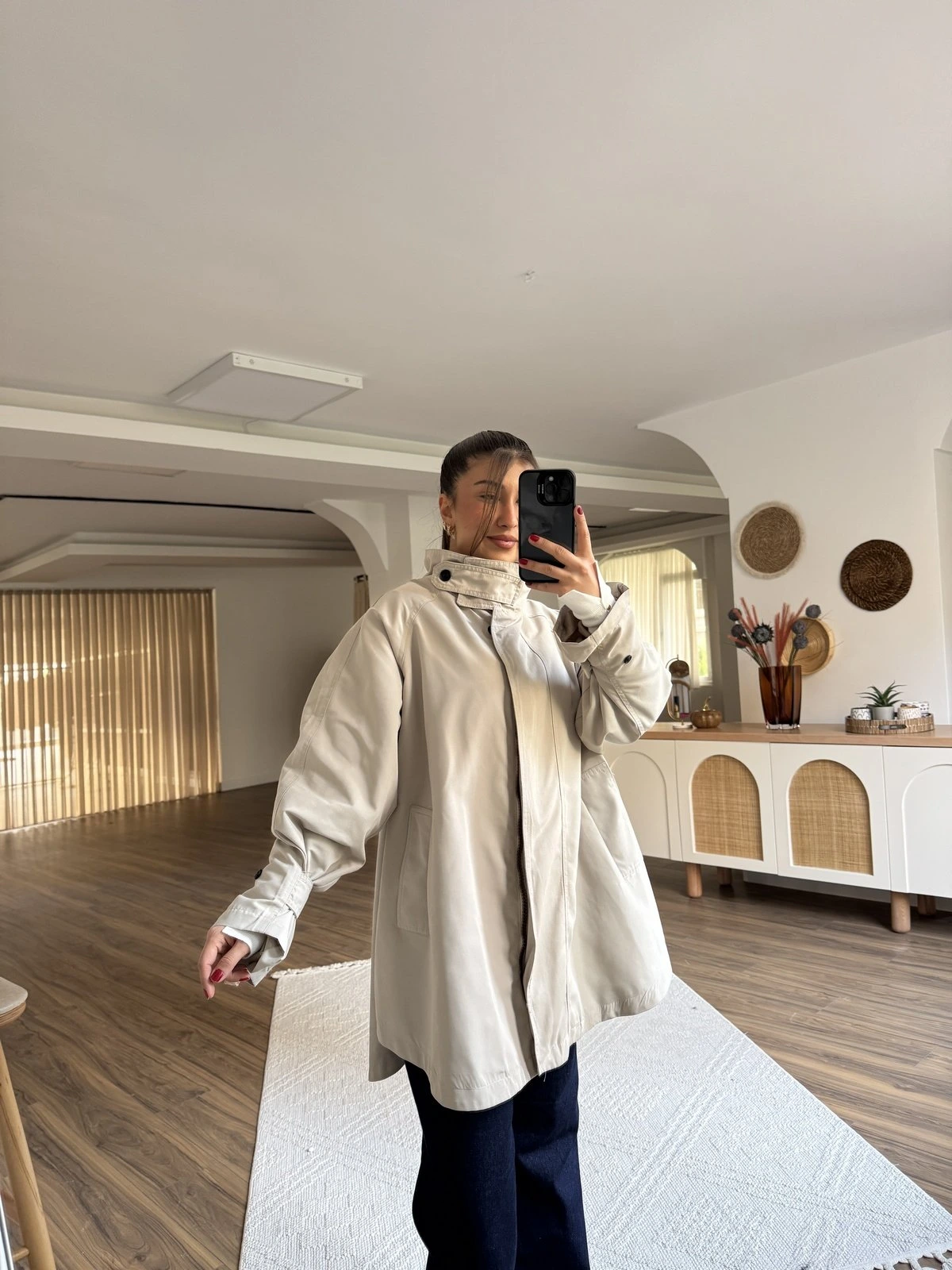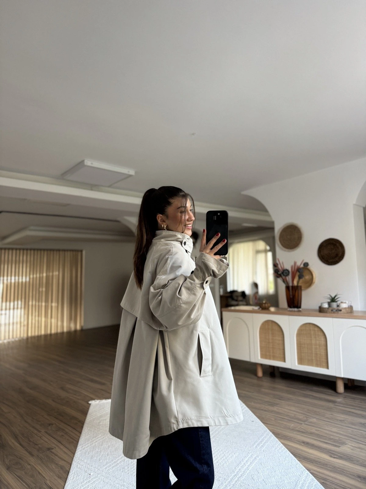 ARKA A PİLE DİK YAKA GENİŞ FERMUARLI PANÇO MODEL TRENÇ – TAŞ
