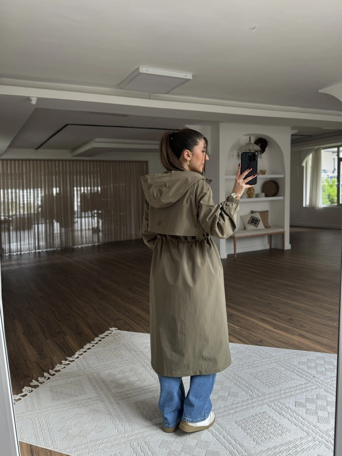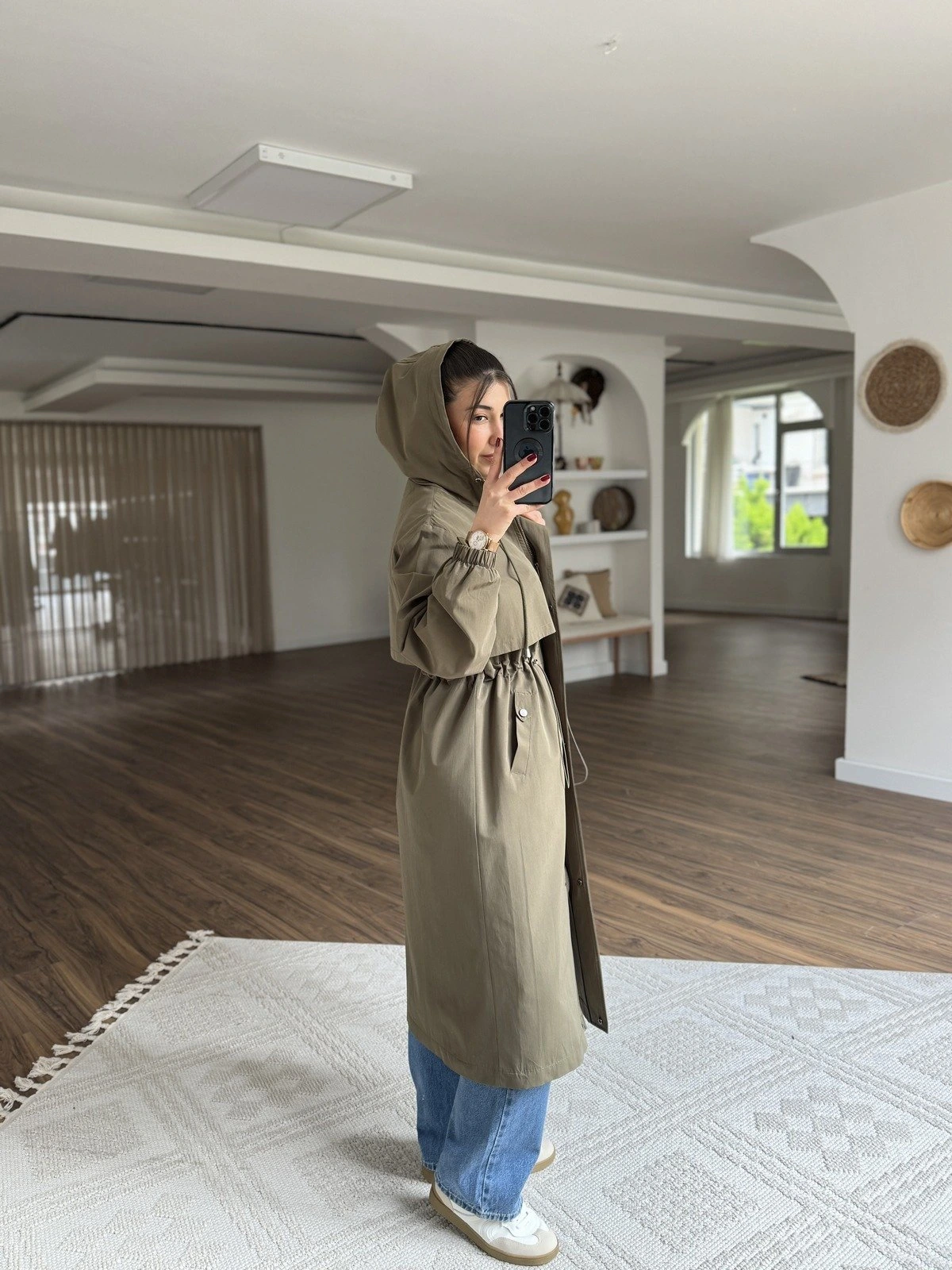 BİLEK LASTİK BEL BÜZGÜ MİDİ KAPÜŞONLU VİSKON TRENÇ – HAKİ