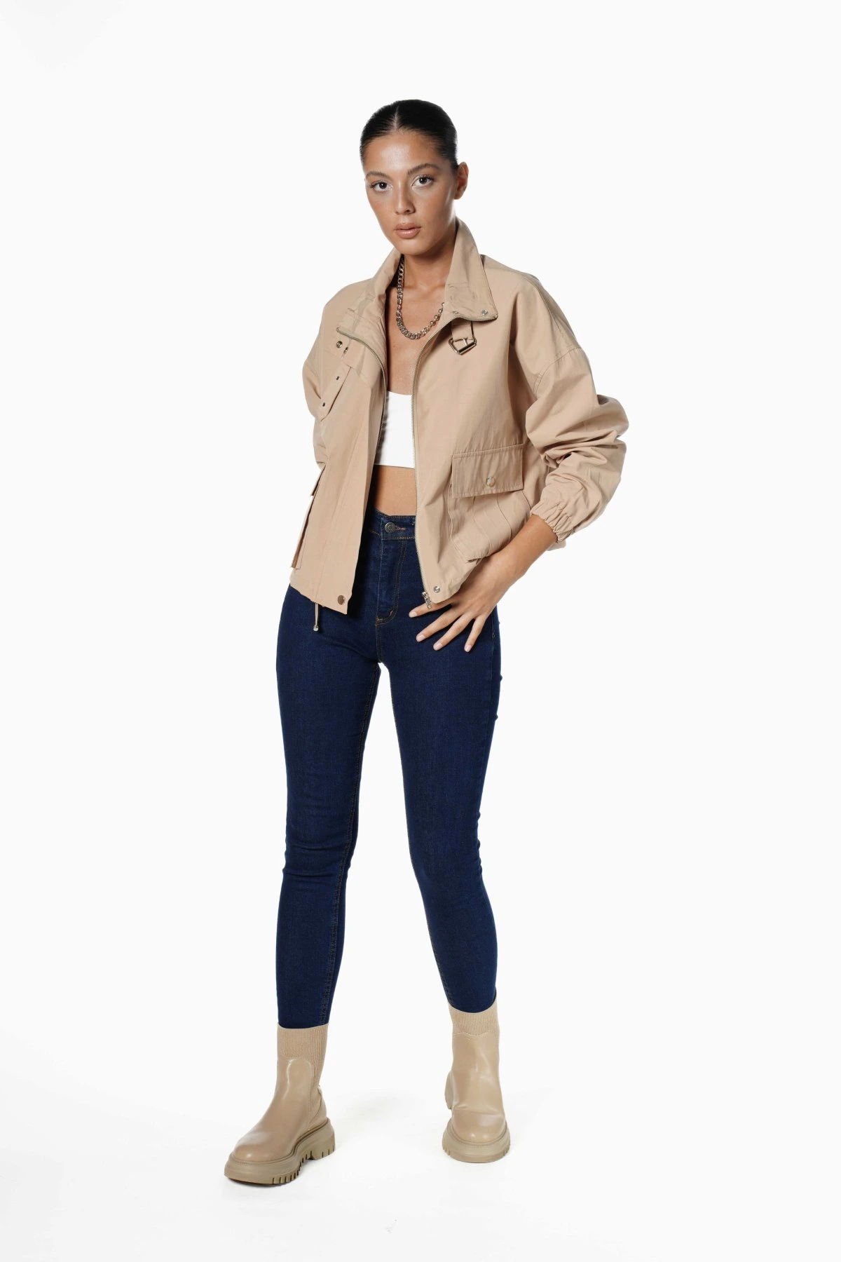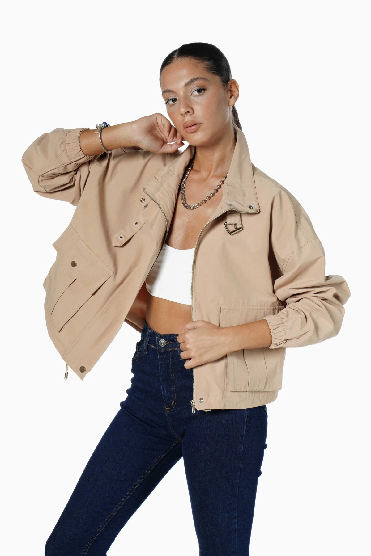 ÇİFT CEP DİK YAKA BEL BÜZGÜ KISA TRENÇ – A.CAMEL