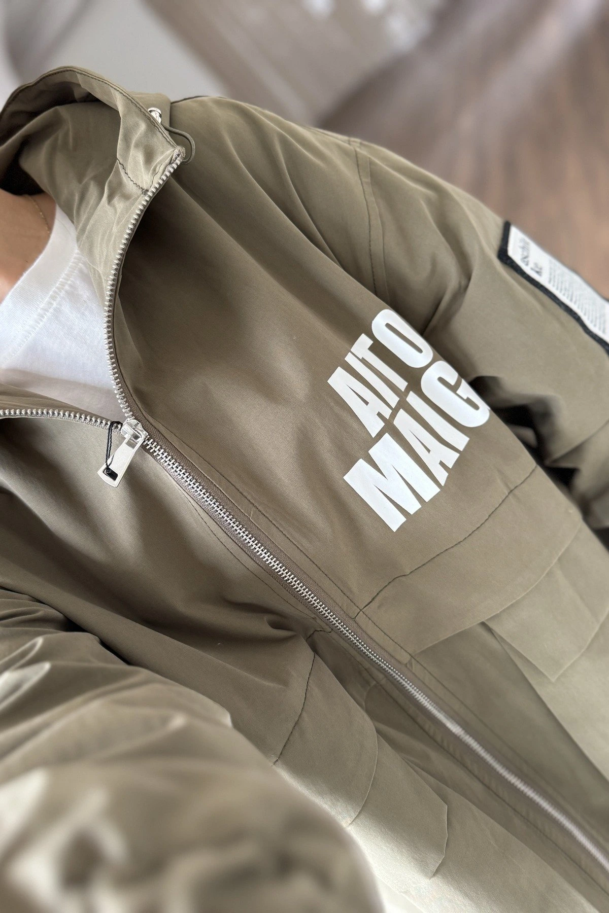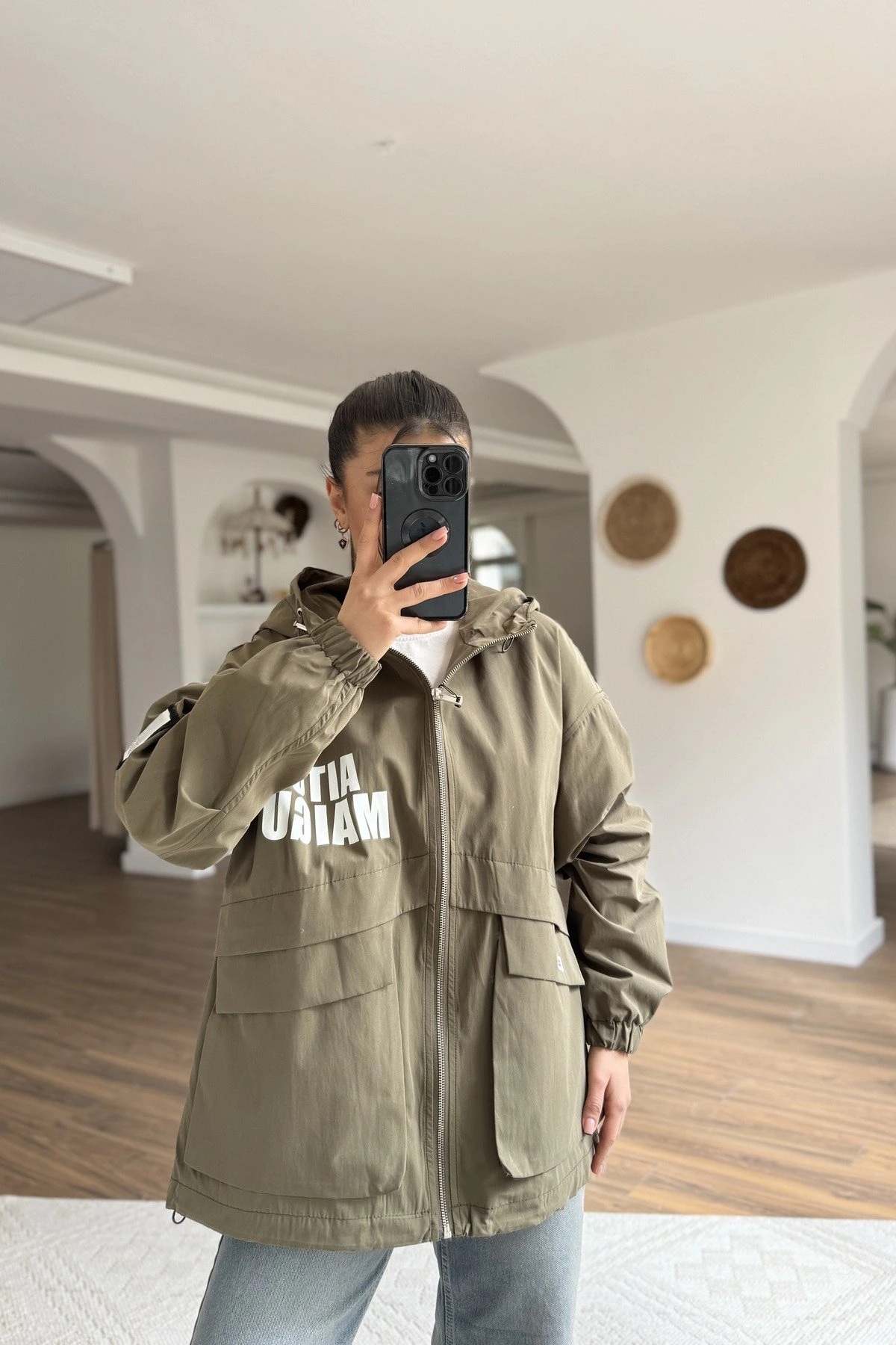 ETİKET BASKI DETAY GENİŞ CEP KAPÜŞONLU VİSKON TRENÇ – HAKİ
