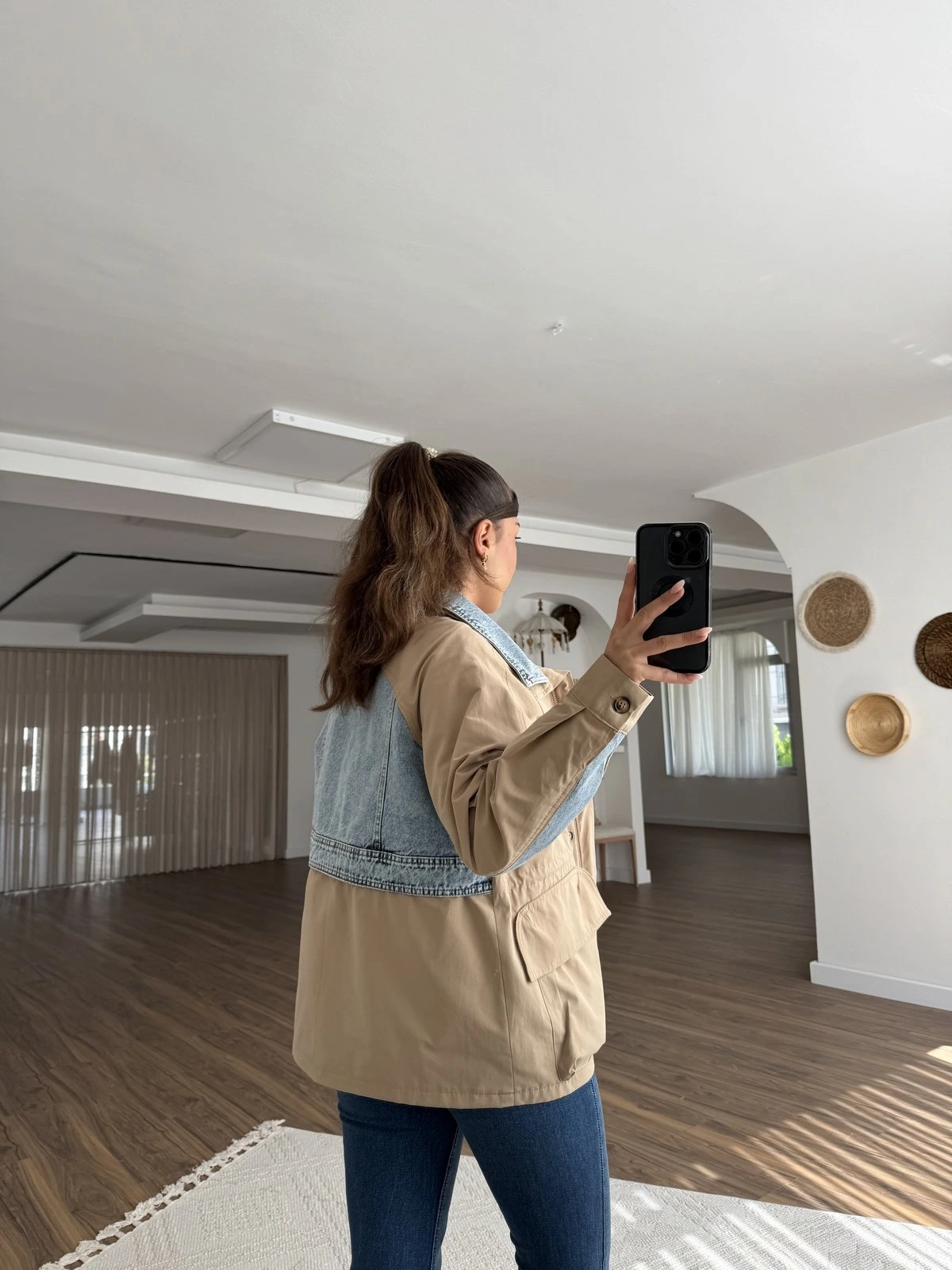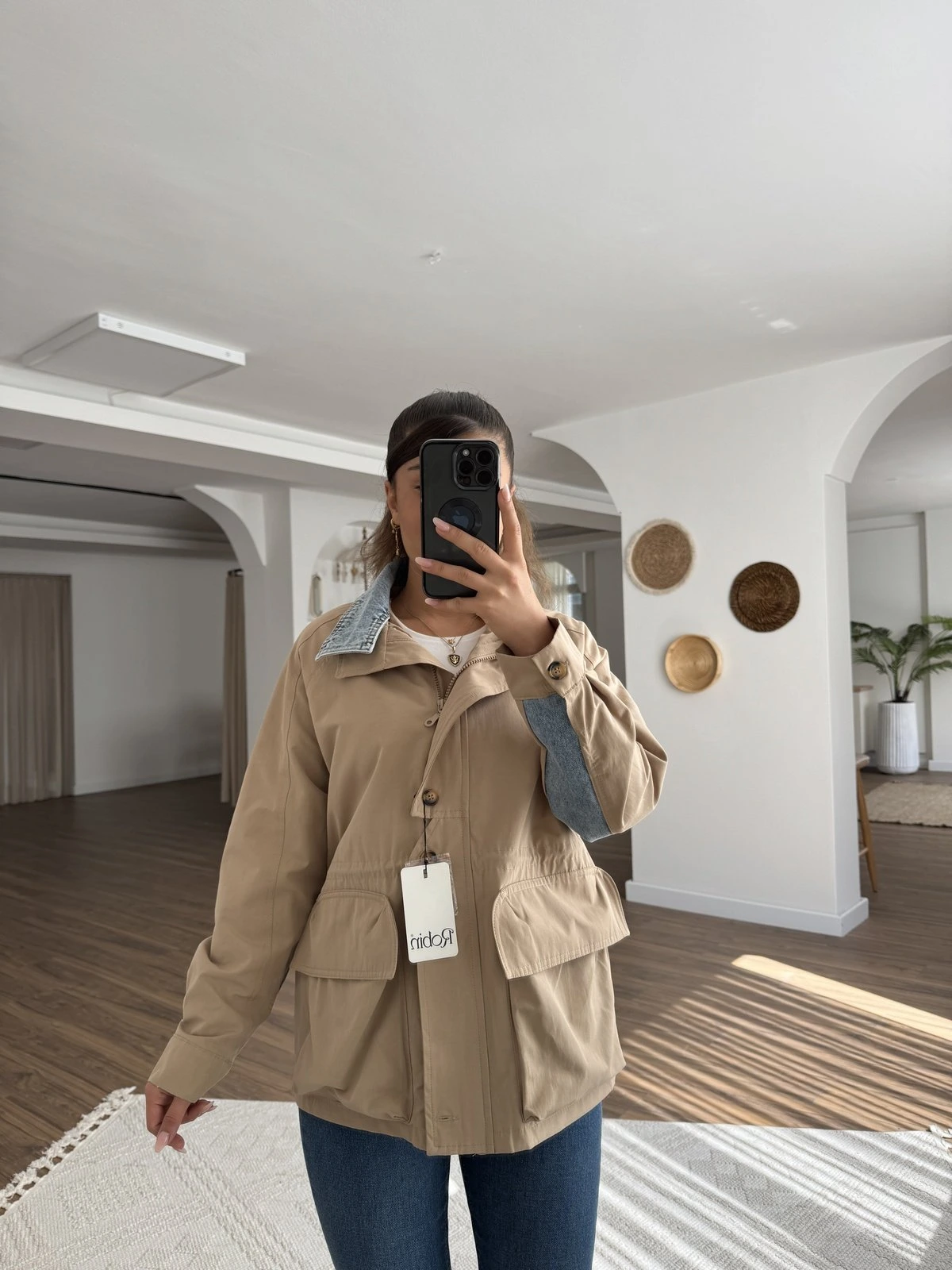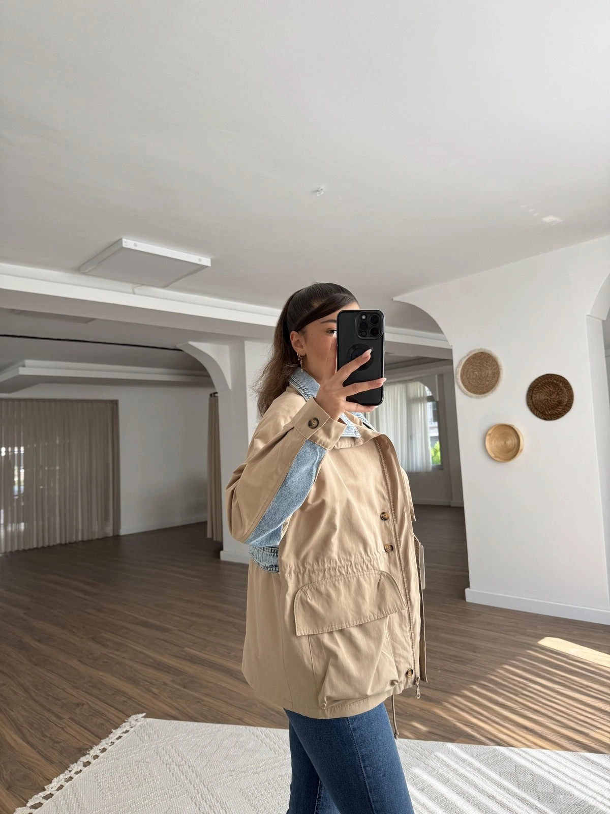 JEAN DETAY REGLAN KOL ÇİZGİ ASTARLI VİSKON KISA TRENÇ – CAMEL