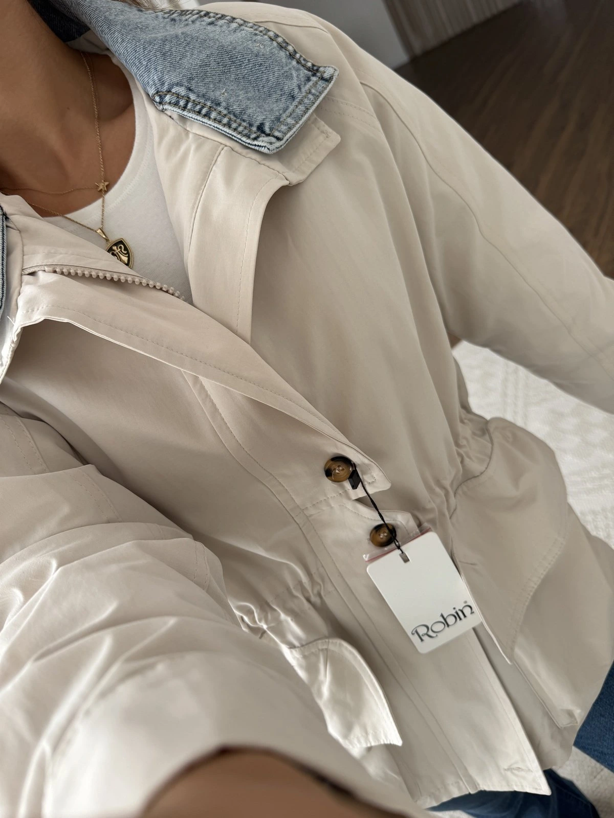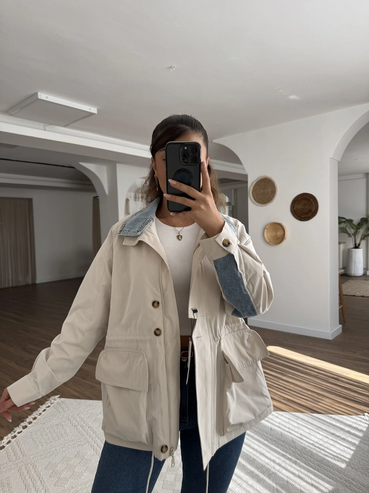 JEAN DETAY REGLAN KOL ÇİZGİ ASTARLI VİSKON KISA TRENÇ – TAŞ