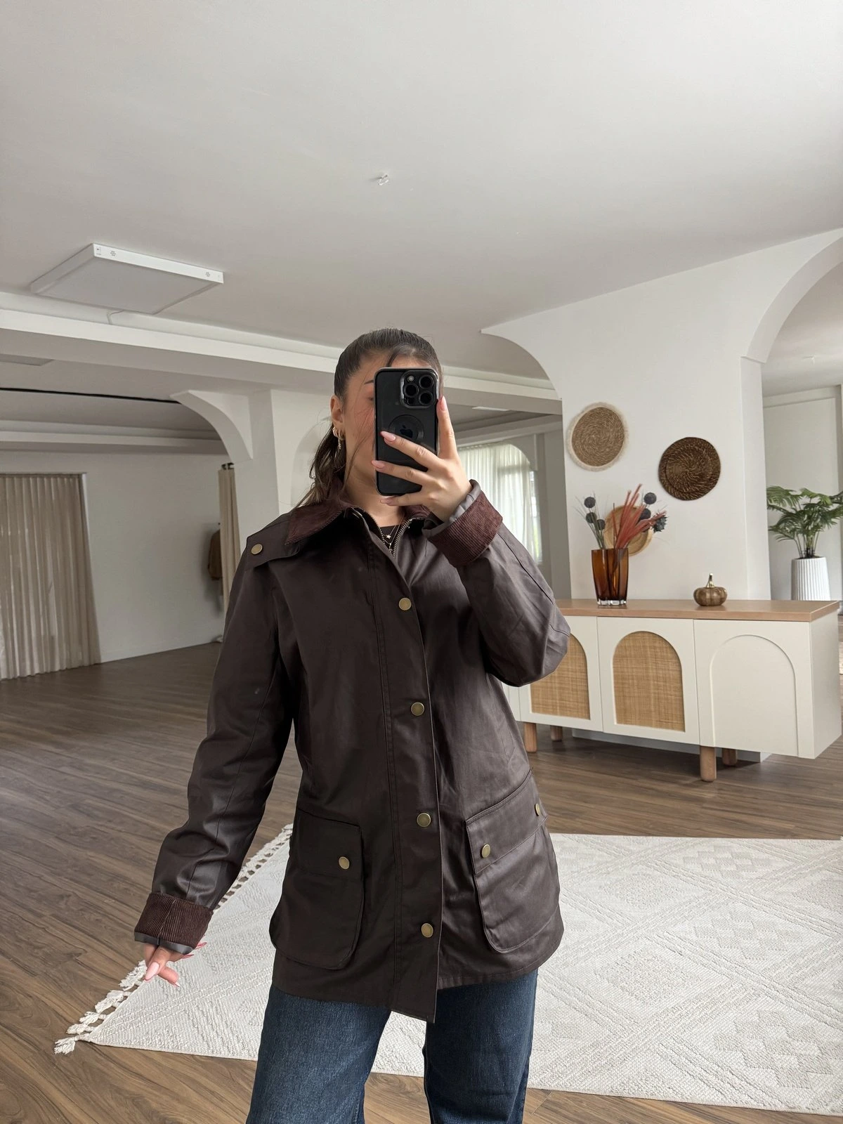 KADİFE YAKA CEPLİ KAPLAMA ASTARLI ÇİFT FERMUARLI KISA TRENÇ – KAHVE