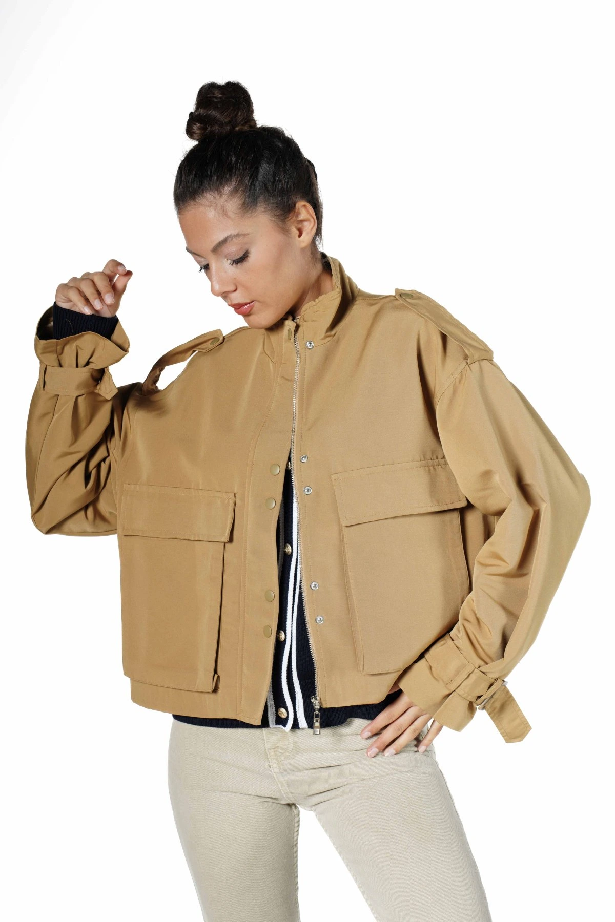 KAPAK CEPLİ APOLETLİ DİK YAKA KISA TRENÇ – KARAMEL
