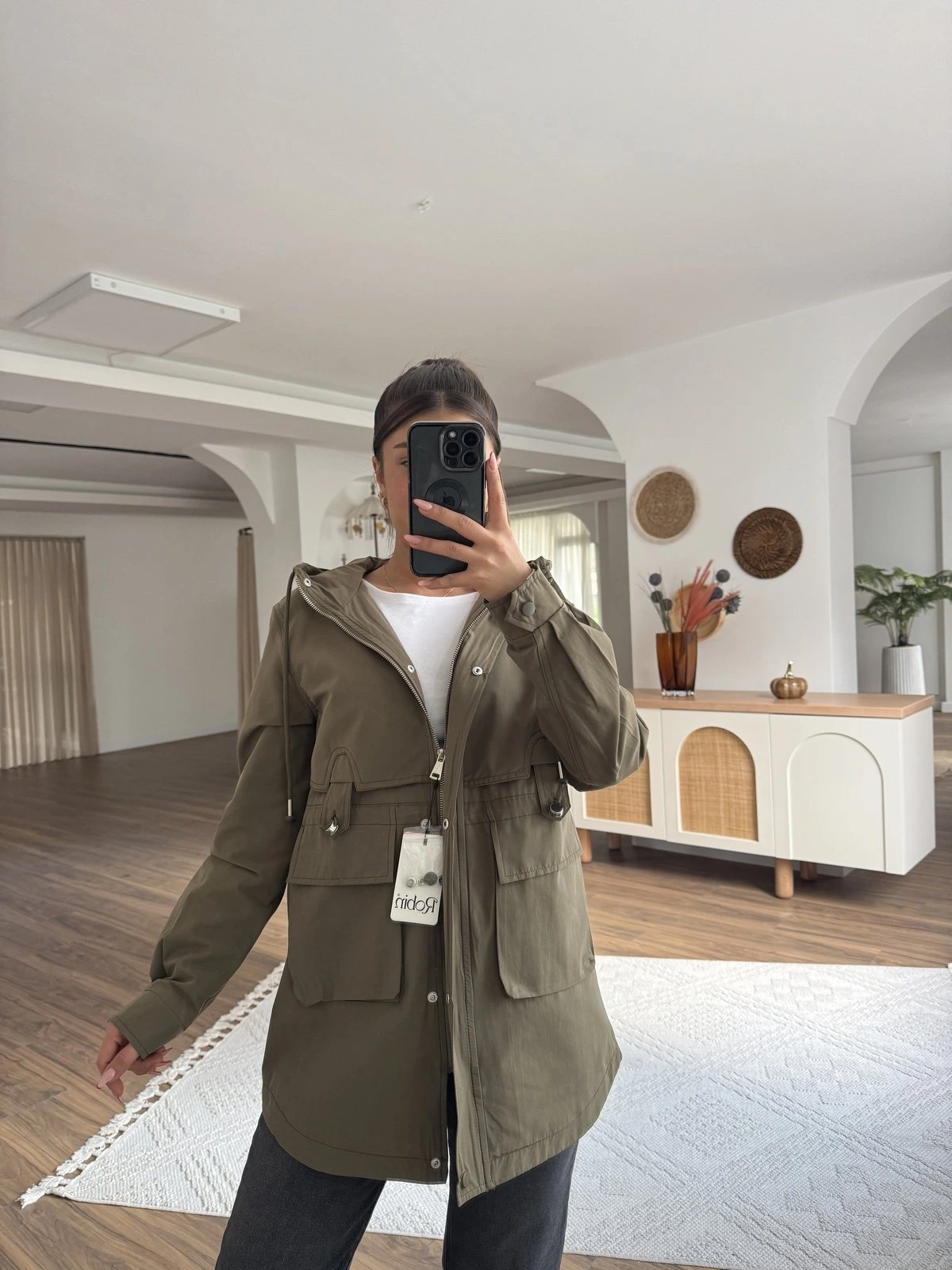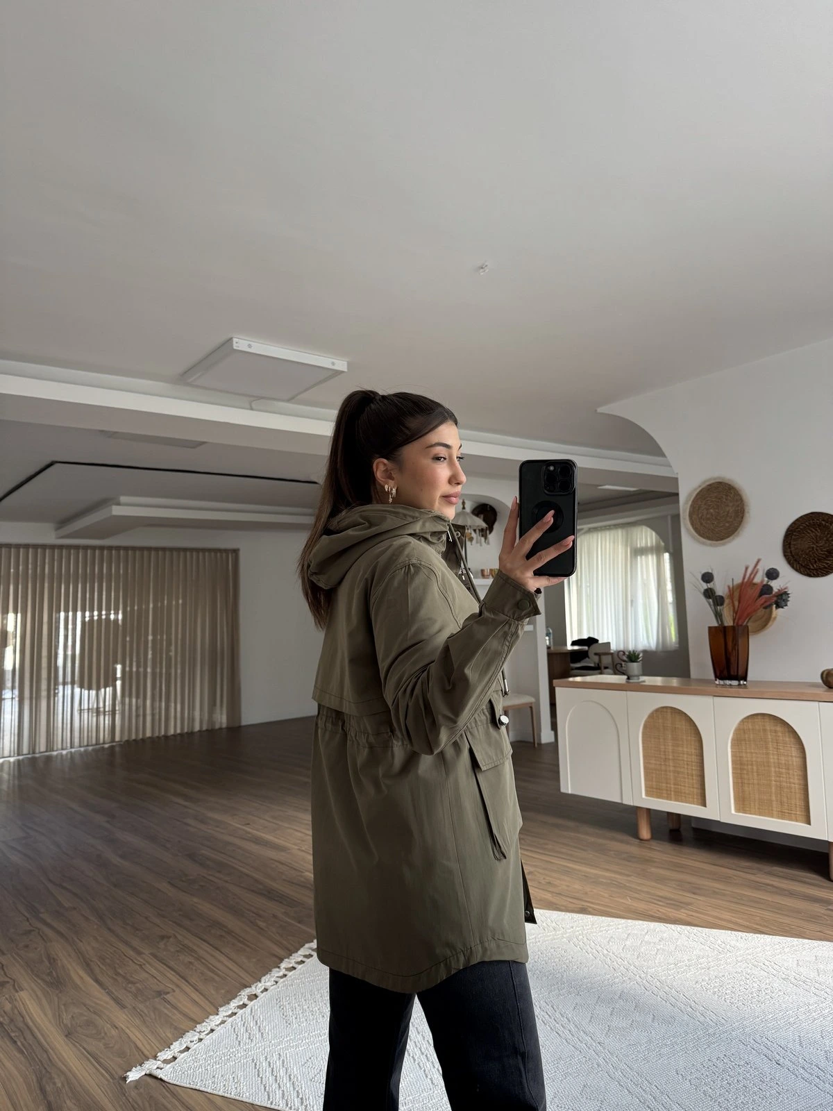 KAPÜŞONLU BEL BÜZGÜ CEP DETAY VİSKON KISA TRENÇ – HAKİ