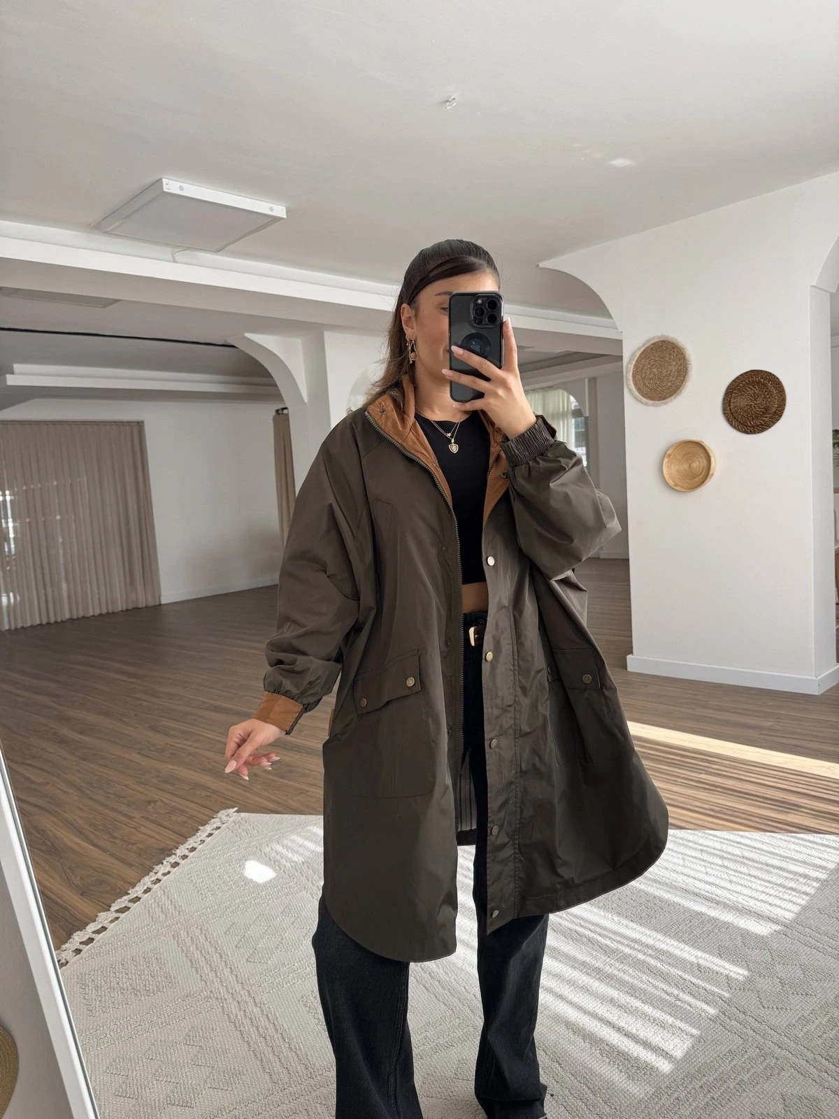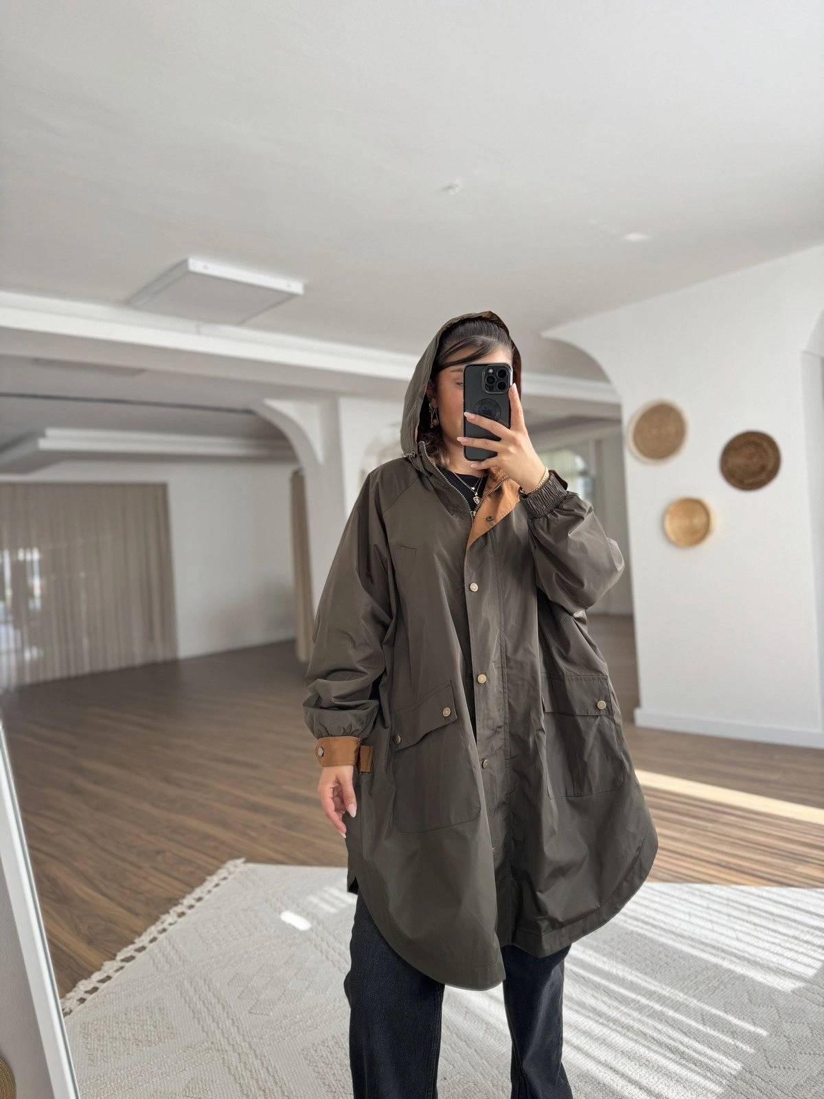 KAPÜŞONLU ETEĞİ OVAL ÇİZGİLİ ASTAR SALAŞ İNCE YAĞMURLUK – HAKİ