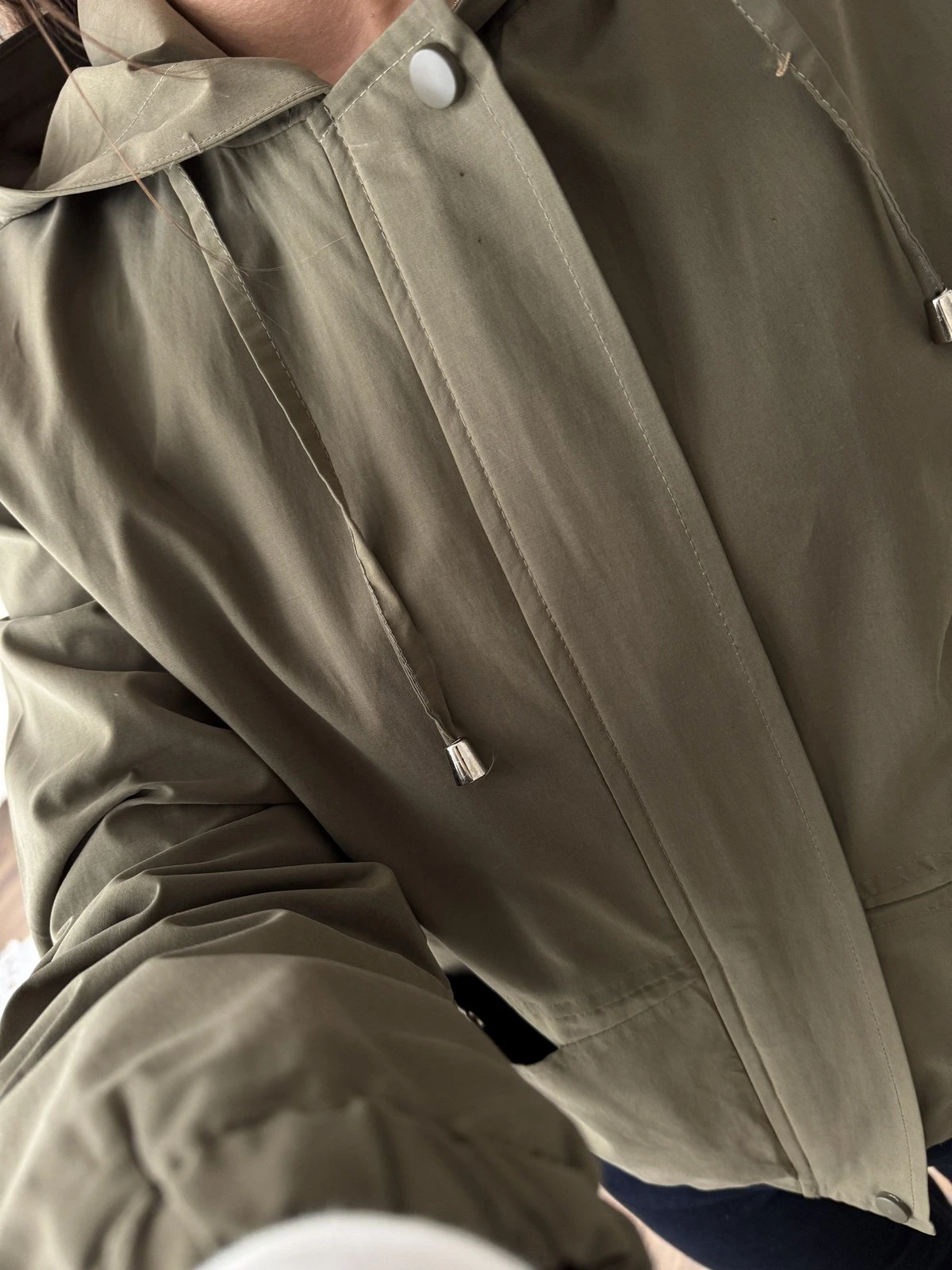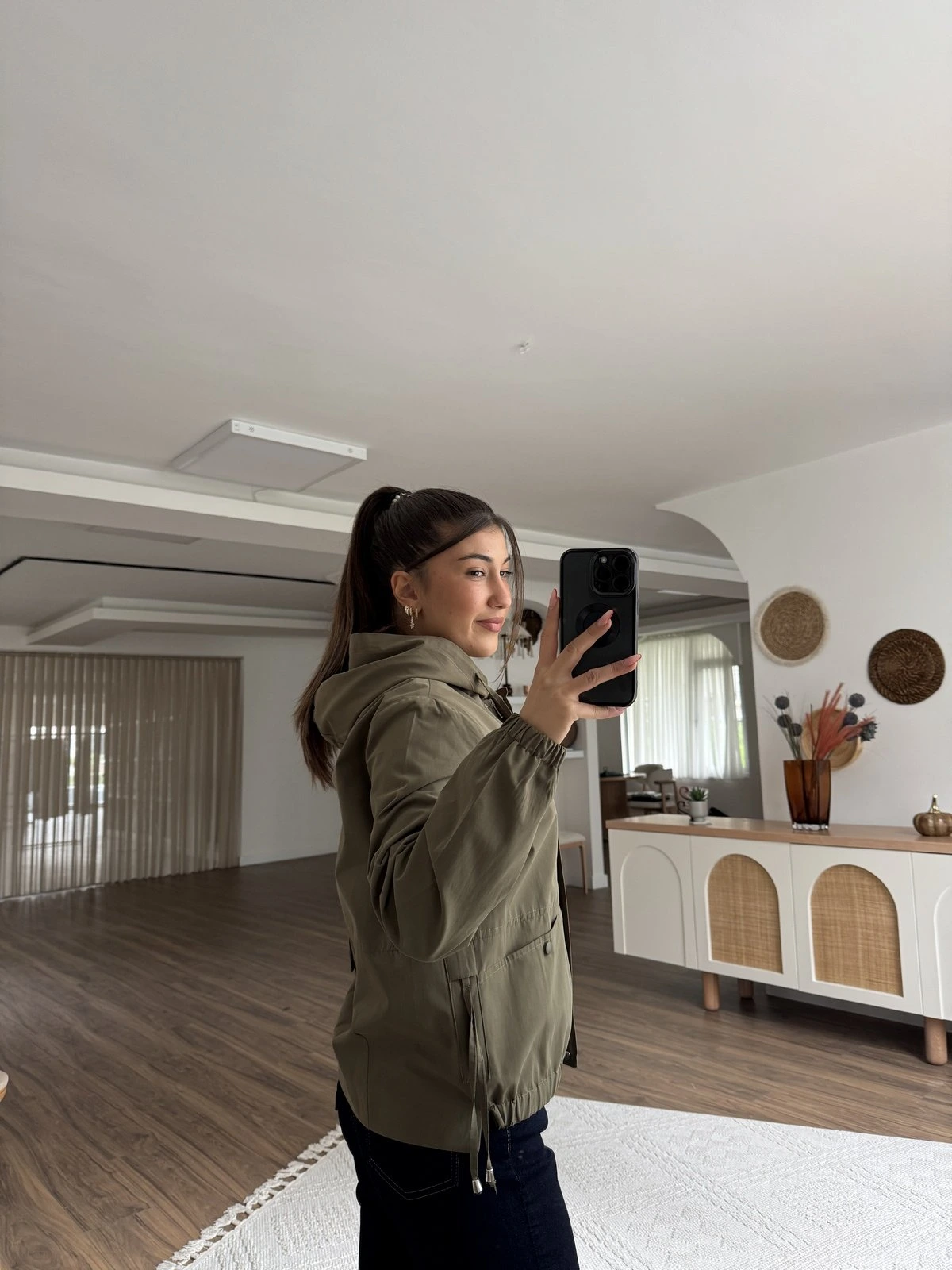 KAPÜŞONLU KOL VE ÖN BEL LASTİK KISA VİSKON TRENÇ – HAKİ