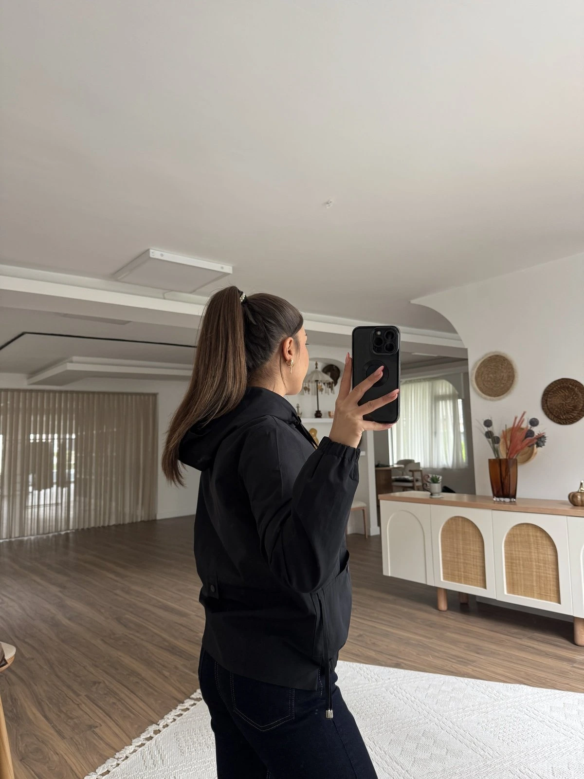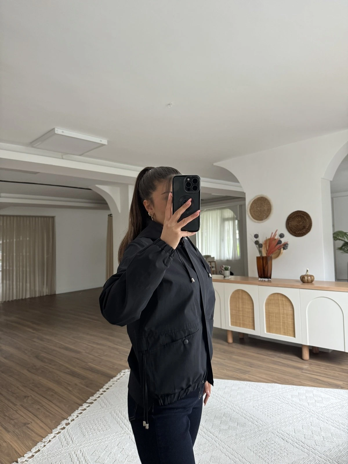 KAPÜŞONLU KOL VE ÖN BEL LASTİK KISA VİSKON TRENÇ – SİYAH