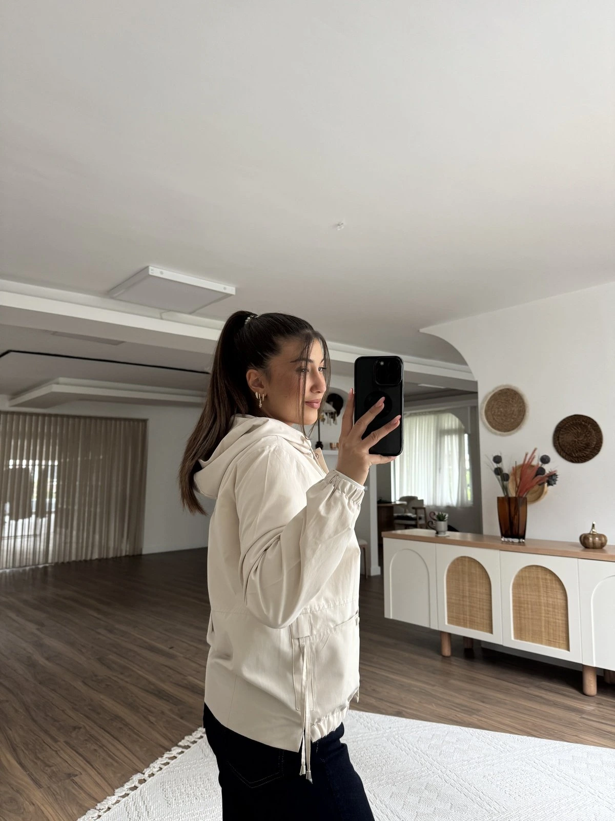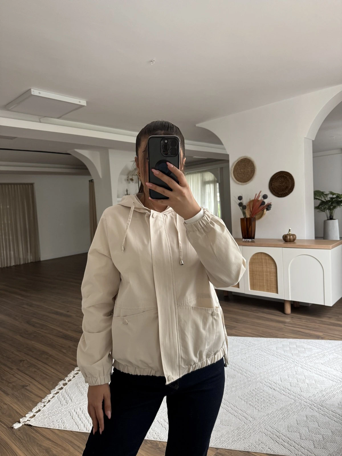 KAPÜŞONLU KOL VE ÖN BEL LASTİK KISA VİSKON TRENÇ – TAŞ