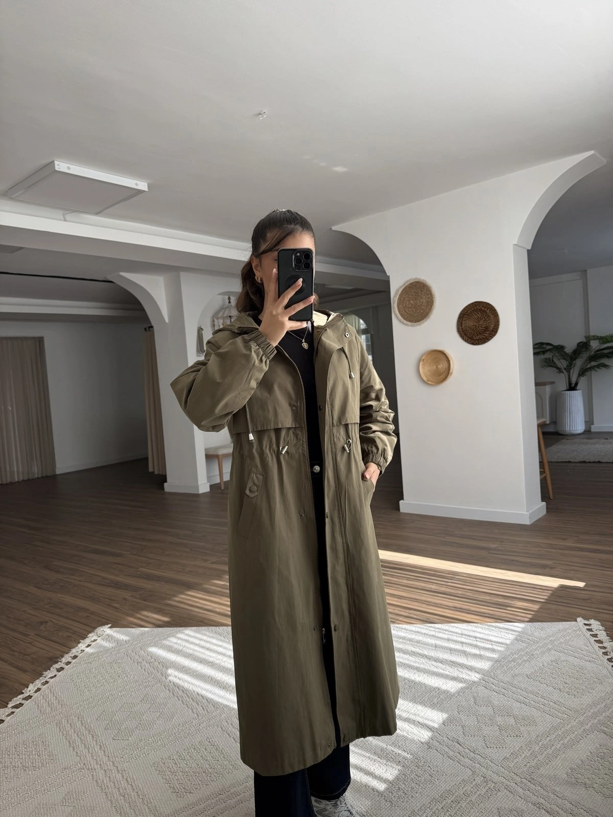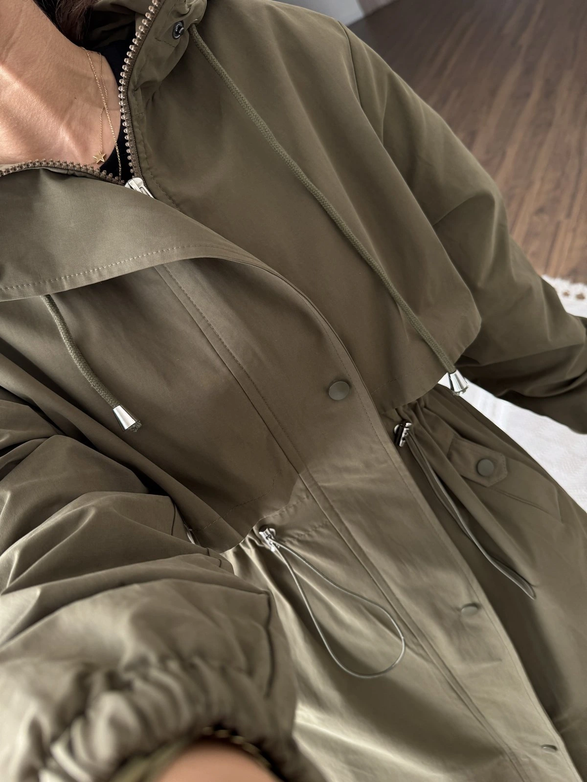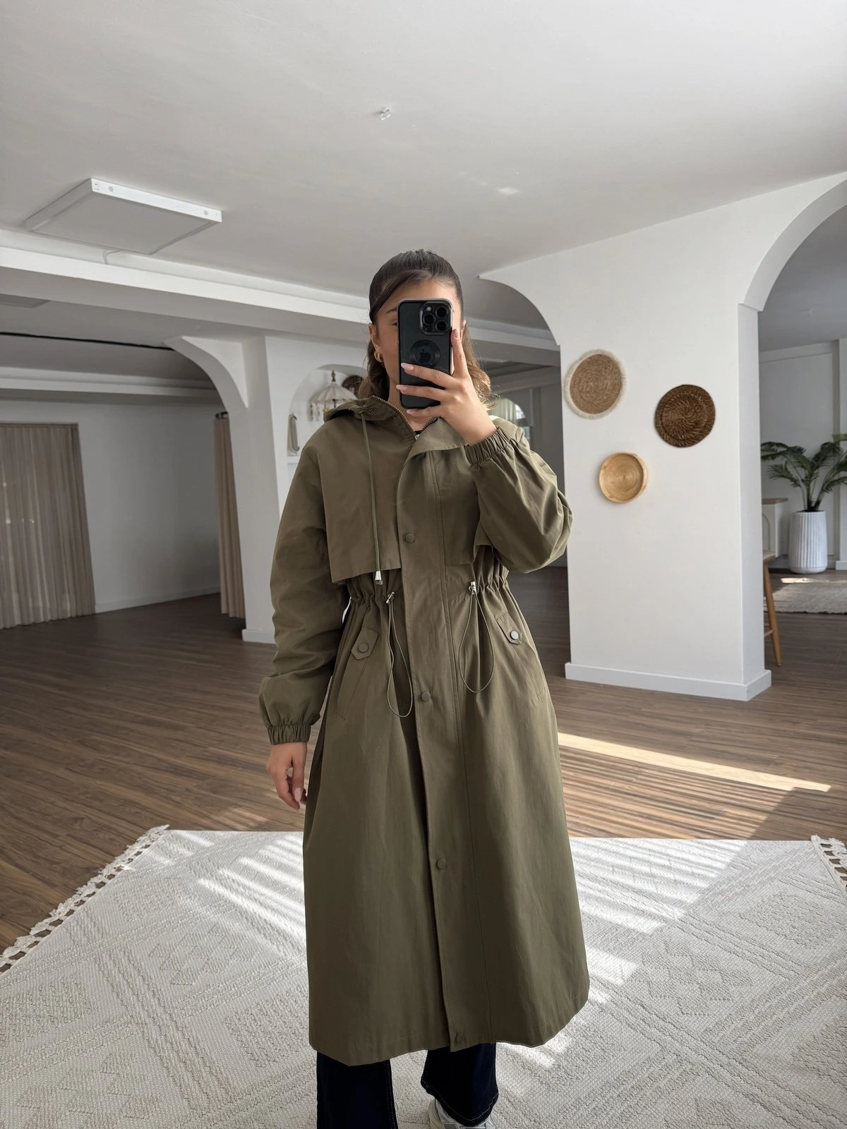 KAPÜŞONLU UZUN BEL BÜZGÜ SIRT KAPAK VİSKON TRENÇ – HAKİ