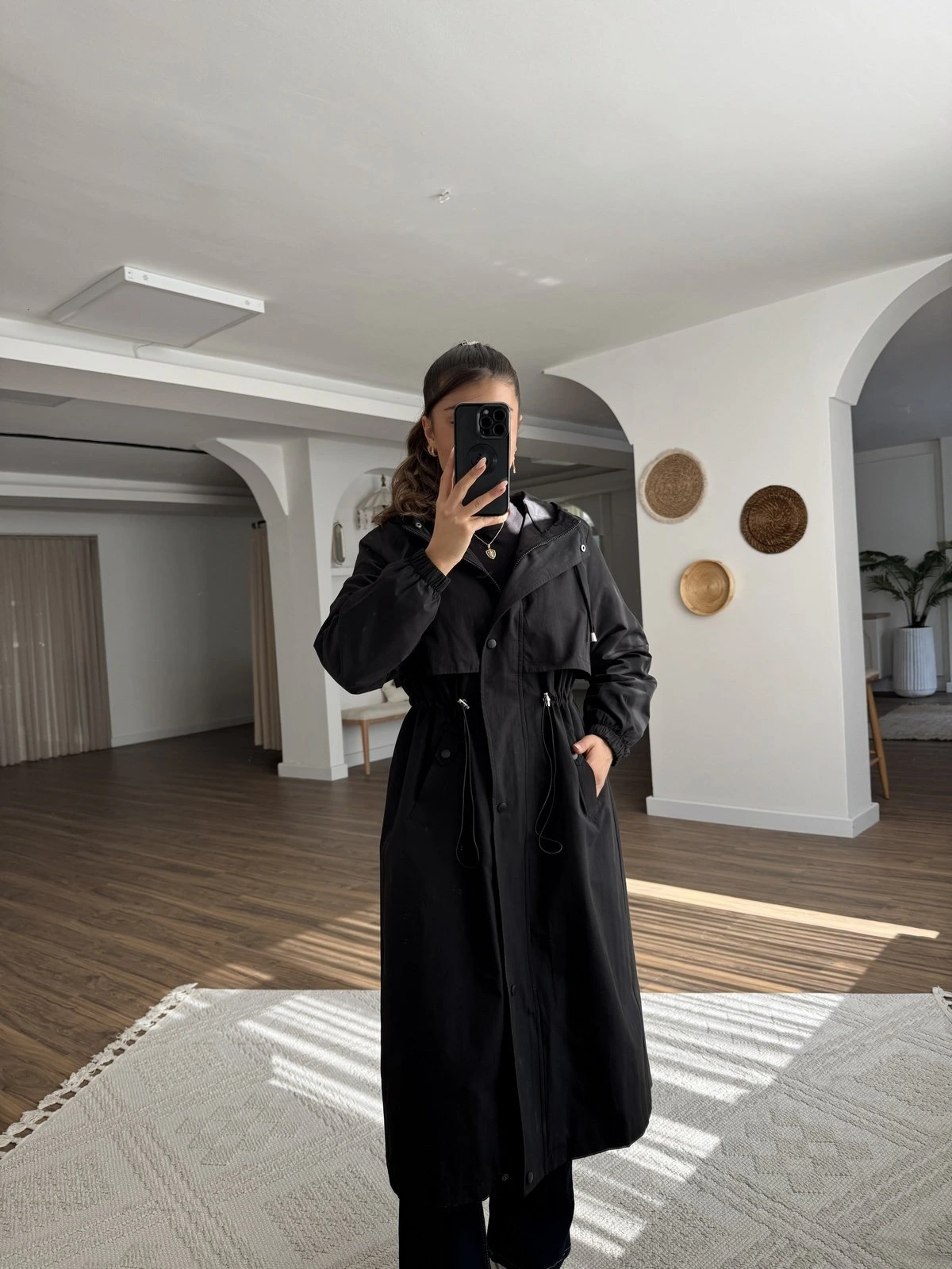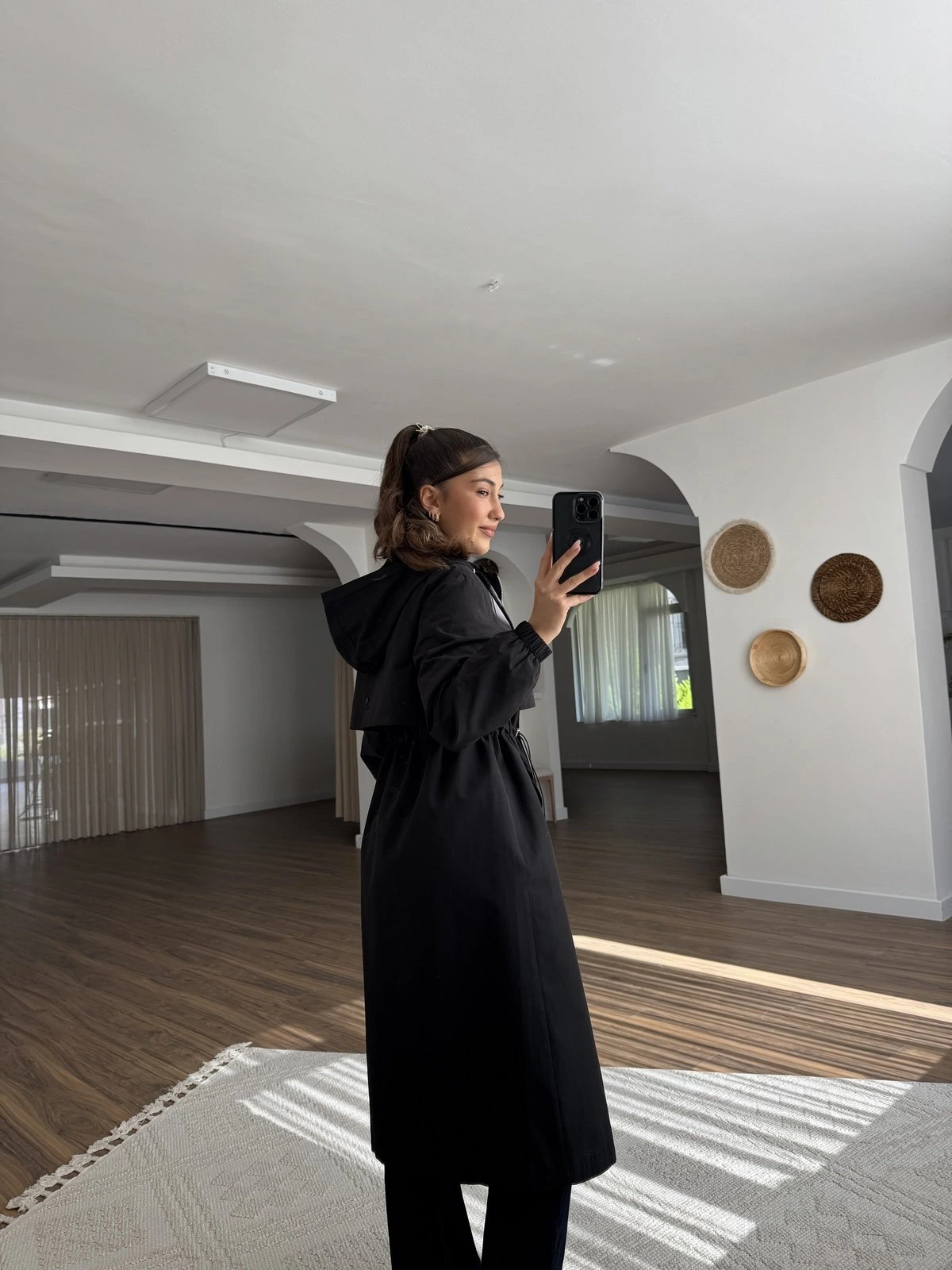KAPÜŞONLU UZUN BEL BÜZGÜ SIRT KAPAK VİSKON TRENÇ – SİYAH