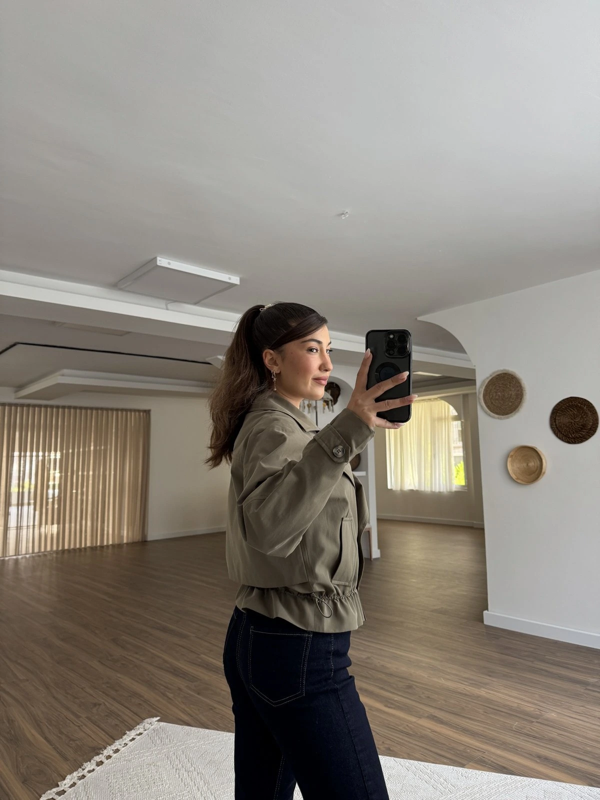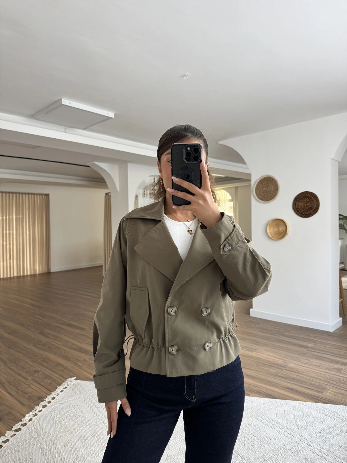 KRUVAZE DÖRT DÜĞME KOL BRİT VİSKON KISA TRENÇ – HAKİ