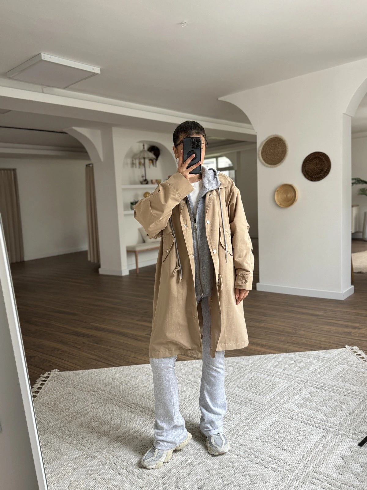 KUMAŞ MİX KAPÜŞONLU BEL BÜZGÜ VİSKON TRENÇ – CAMEL