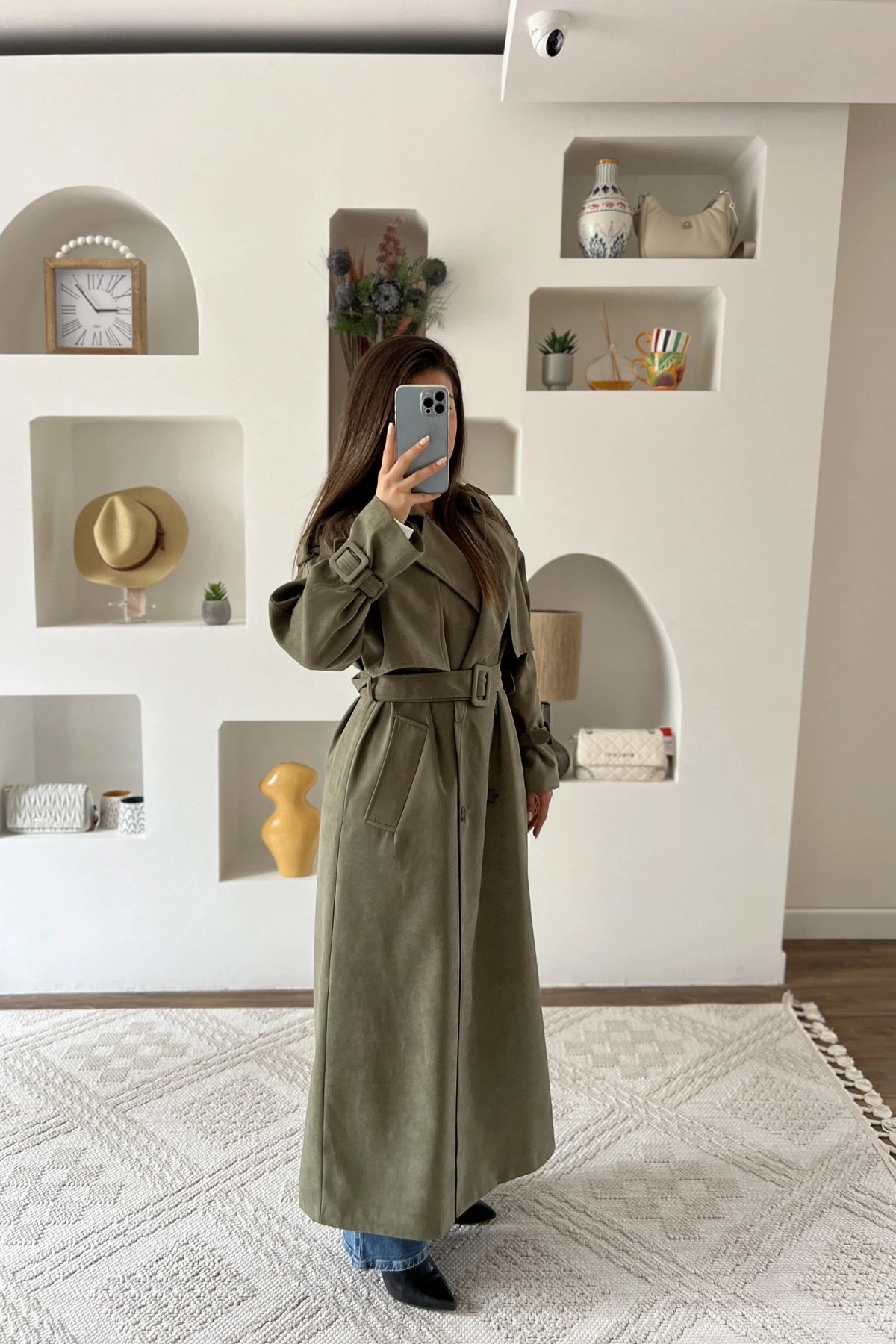 OMUZ APOLET KEMERLİ KOL BRİT UZUN SÜET TRENÇ – HAKİ