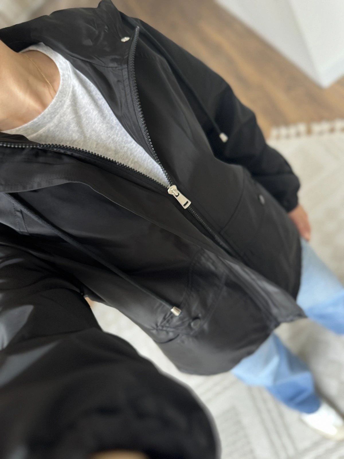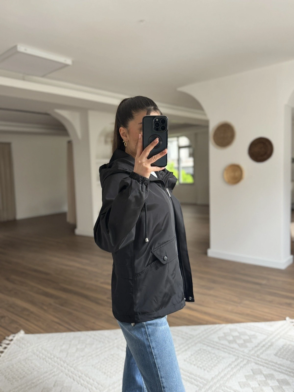PARLAK DOKU KAPÜŞONLU ARKA KAPAKLI TRENÇ – SİYAH
