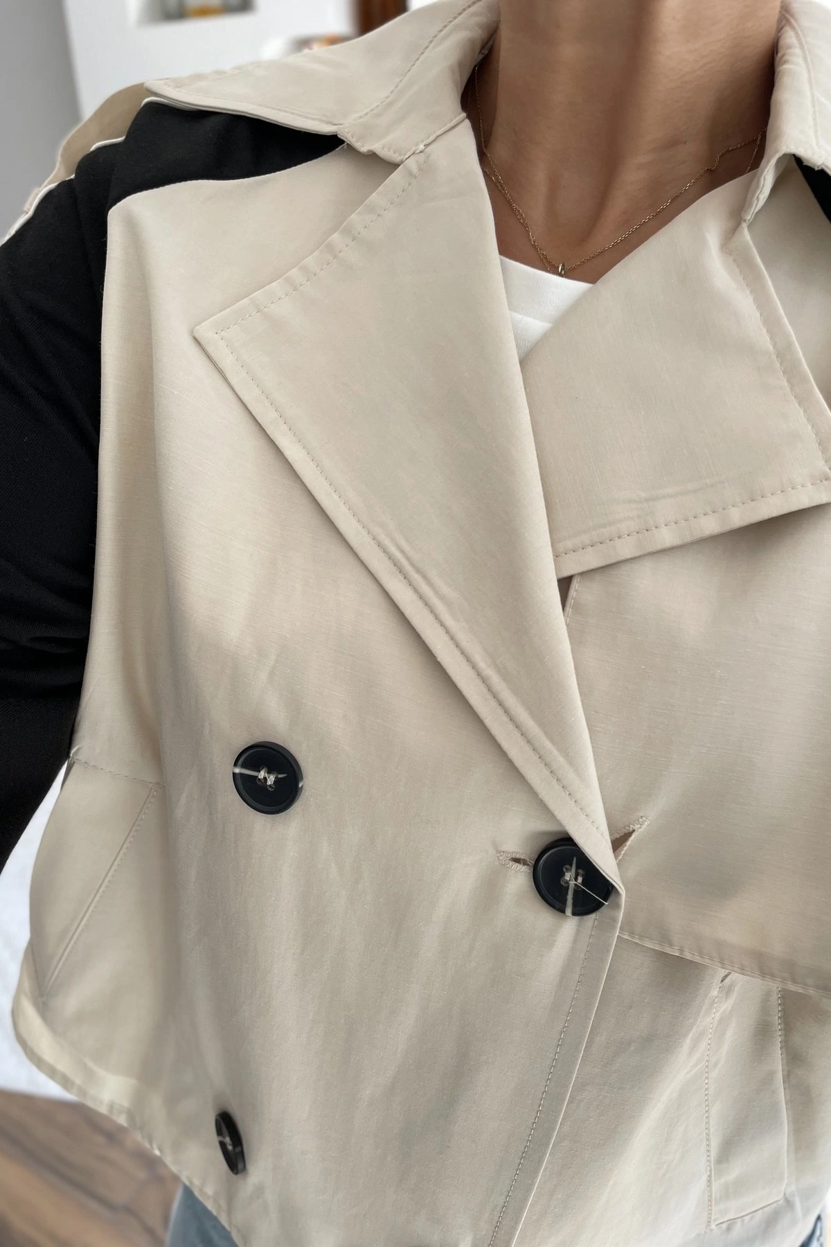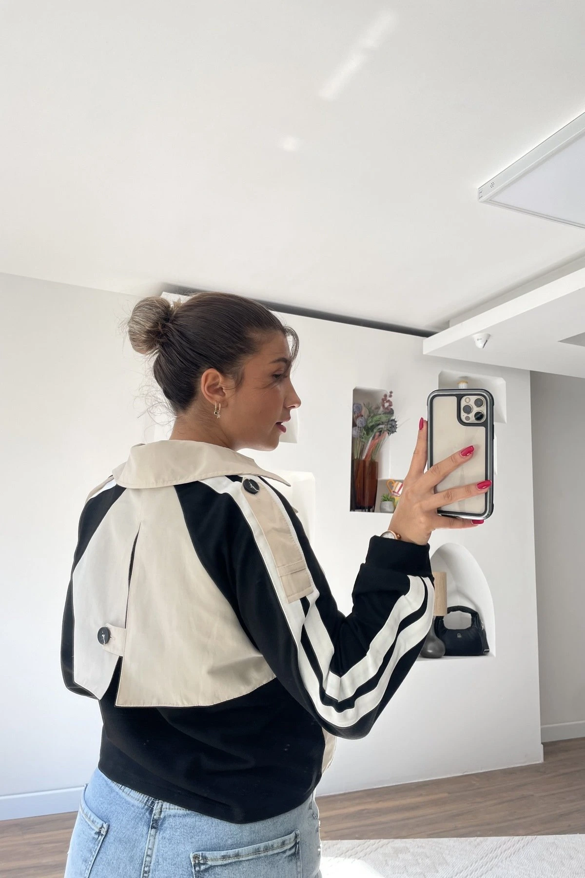 SIRT KAPAKLI KOL ÇİZGİLİ PAMUK KISA TRENÇ – TAŞ