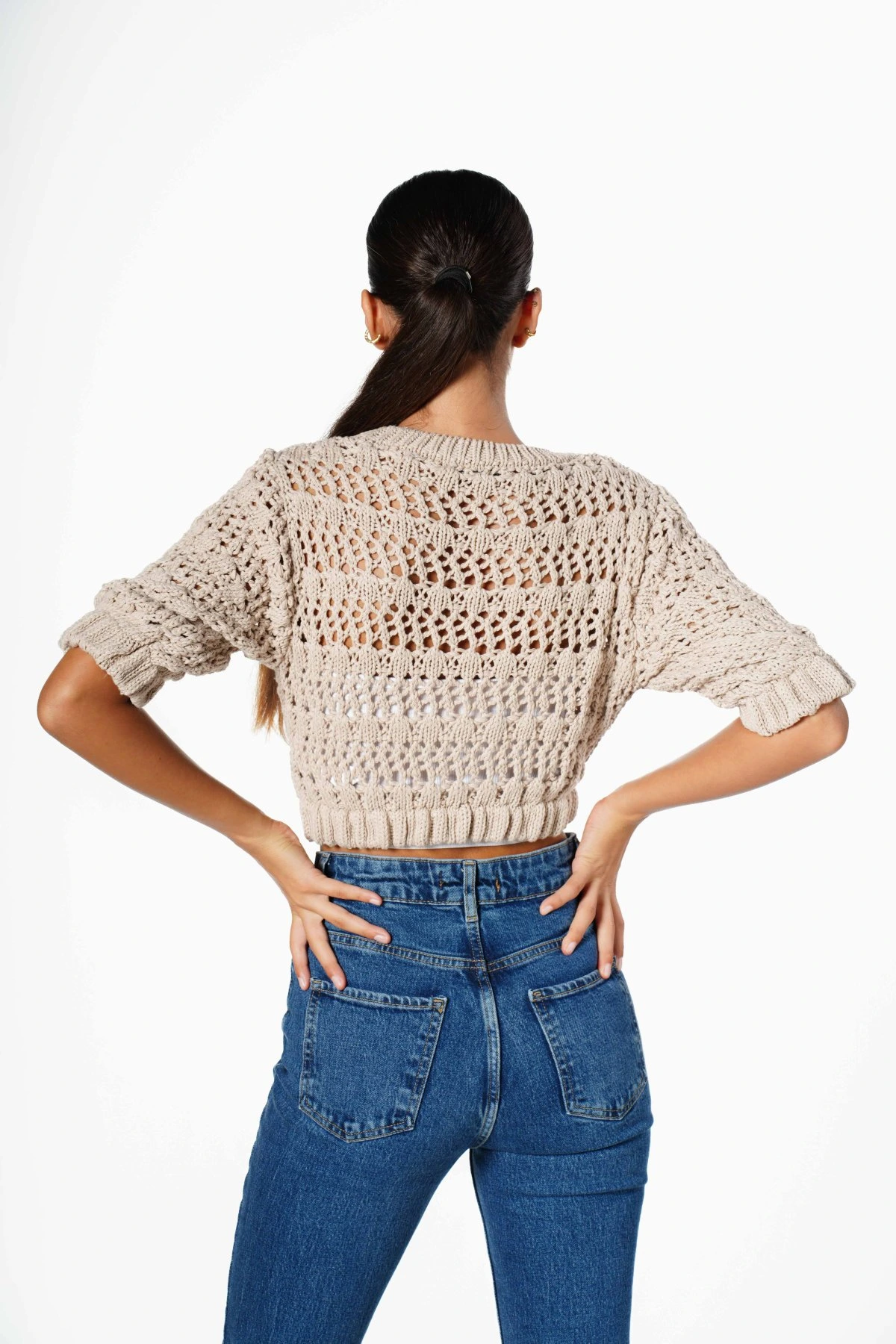 AJURLU KOL VE ETEĞİ LASTİKLİ CROP TRİKO – BEJ