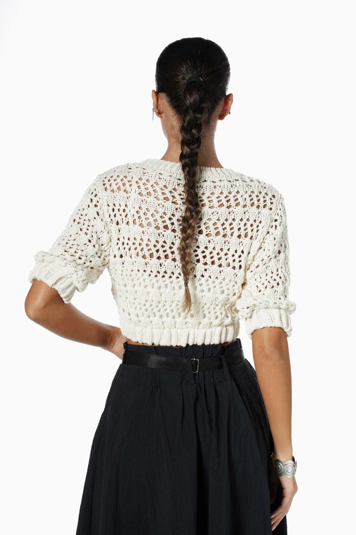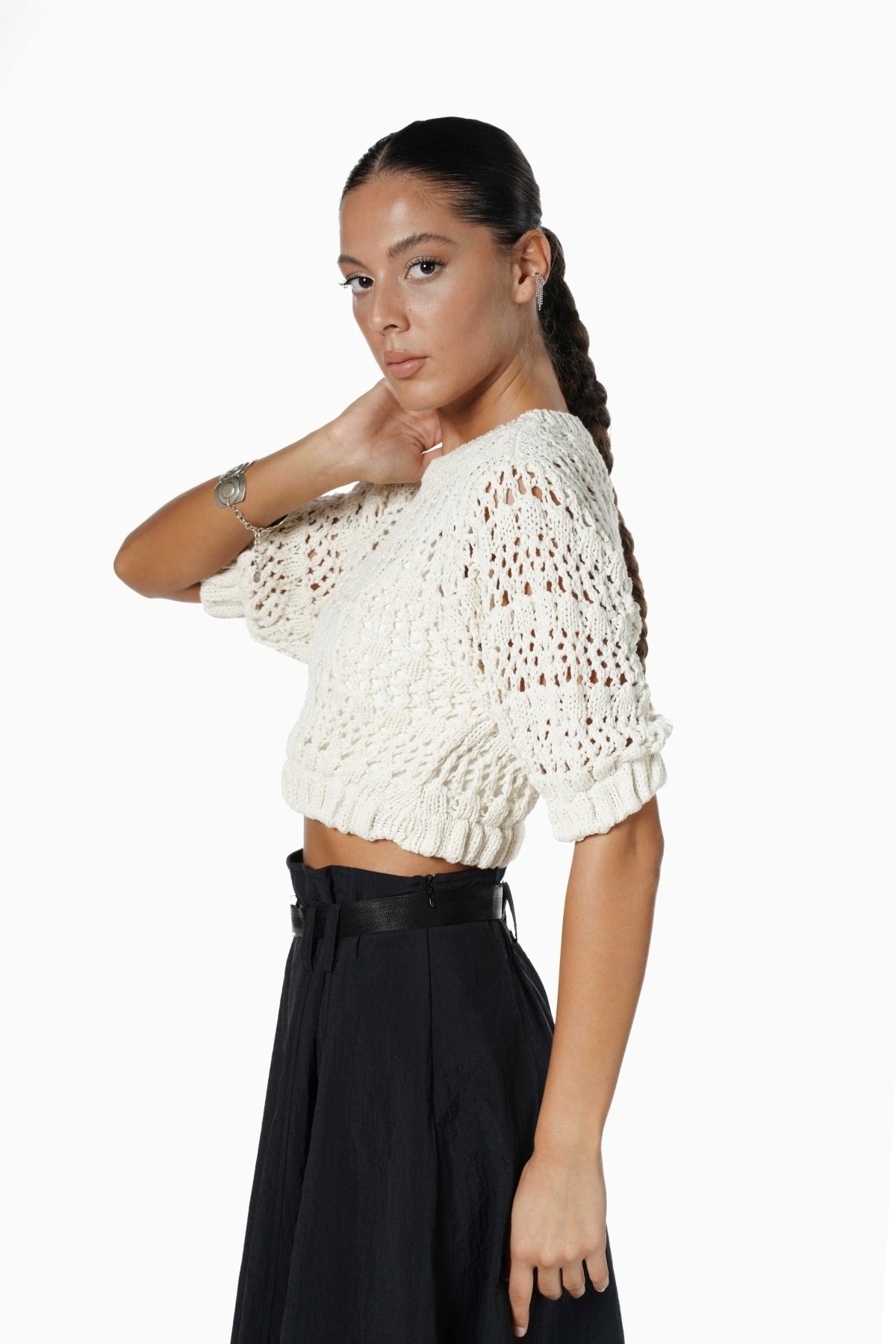 AJURLU KOL VE ETEĞİ LASTİKLİ CROP TRİKO – HAM EKRU
