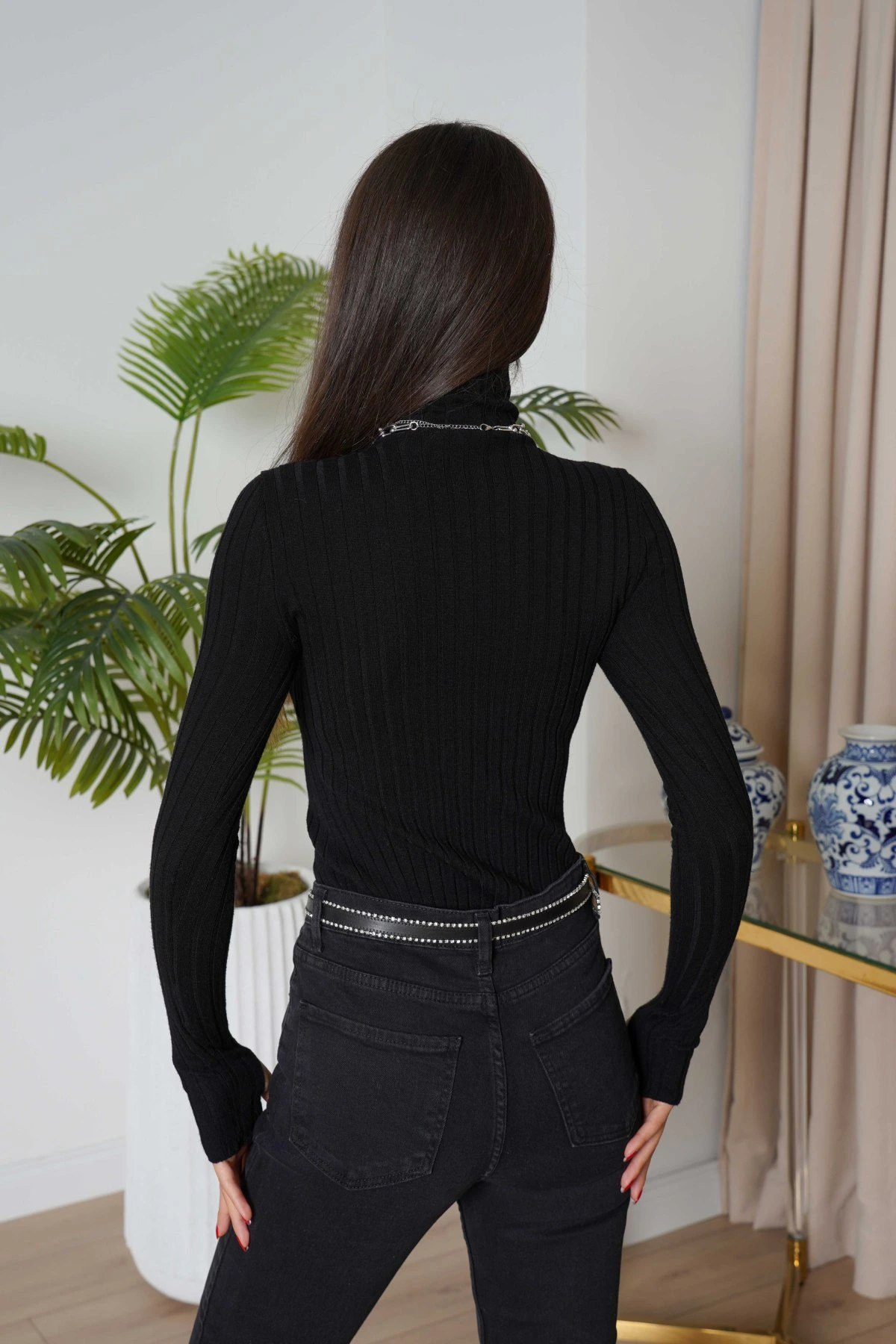 BALIKÇI YAKA VİSKON FİTİLLİ TRİKO – SİYAH