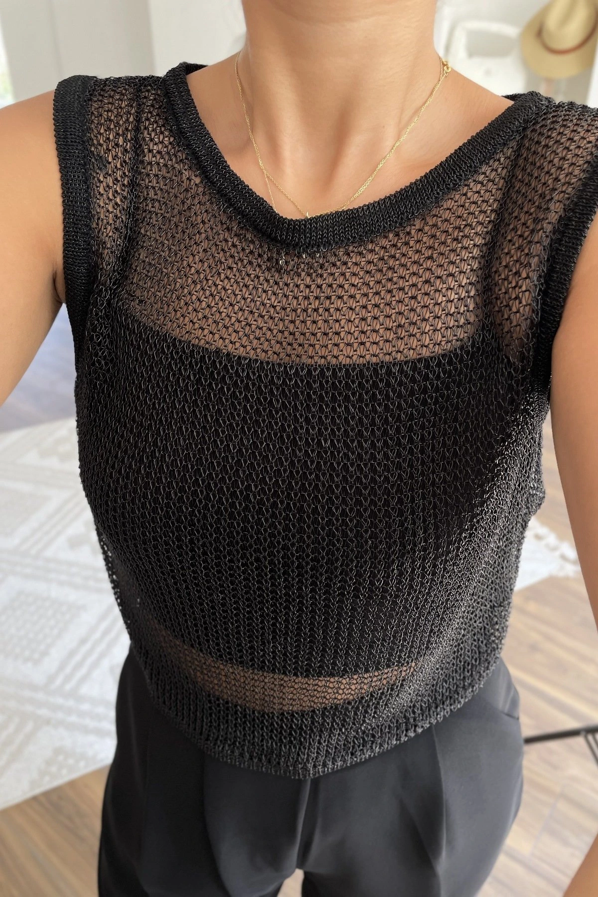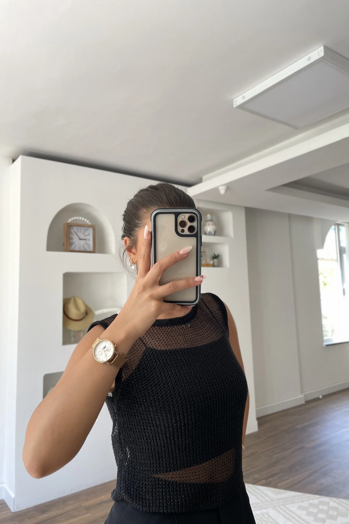 BİSİKLET YAKA AJURLU PARLAK KISA VİSKON BLUZ – SİYAH