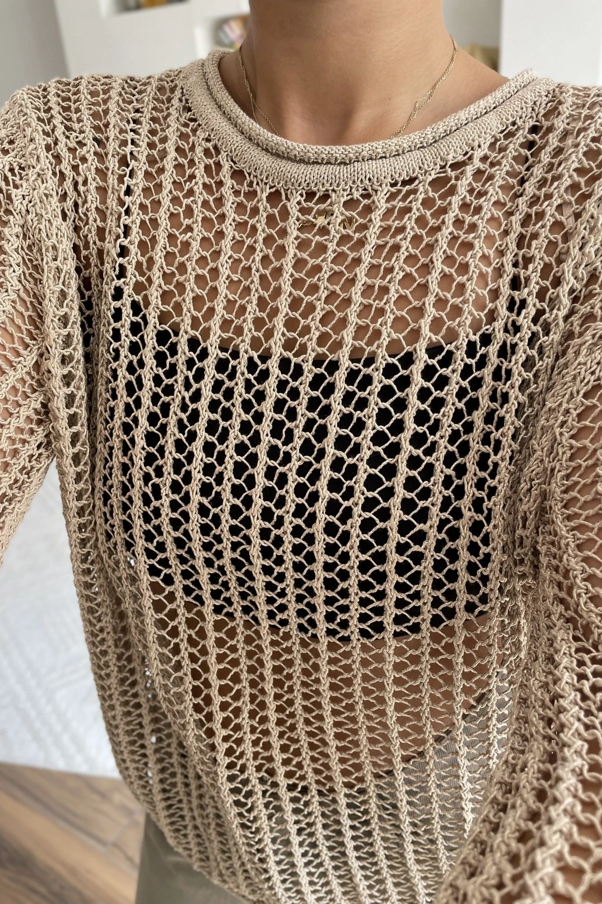 BİSİKLET YAKA AJURLU TRİKO KAZAK – BEJ