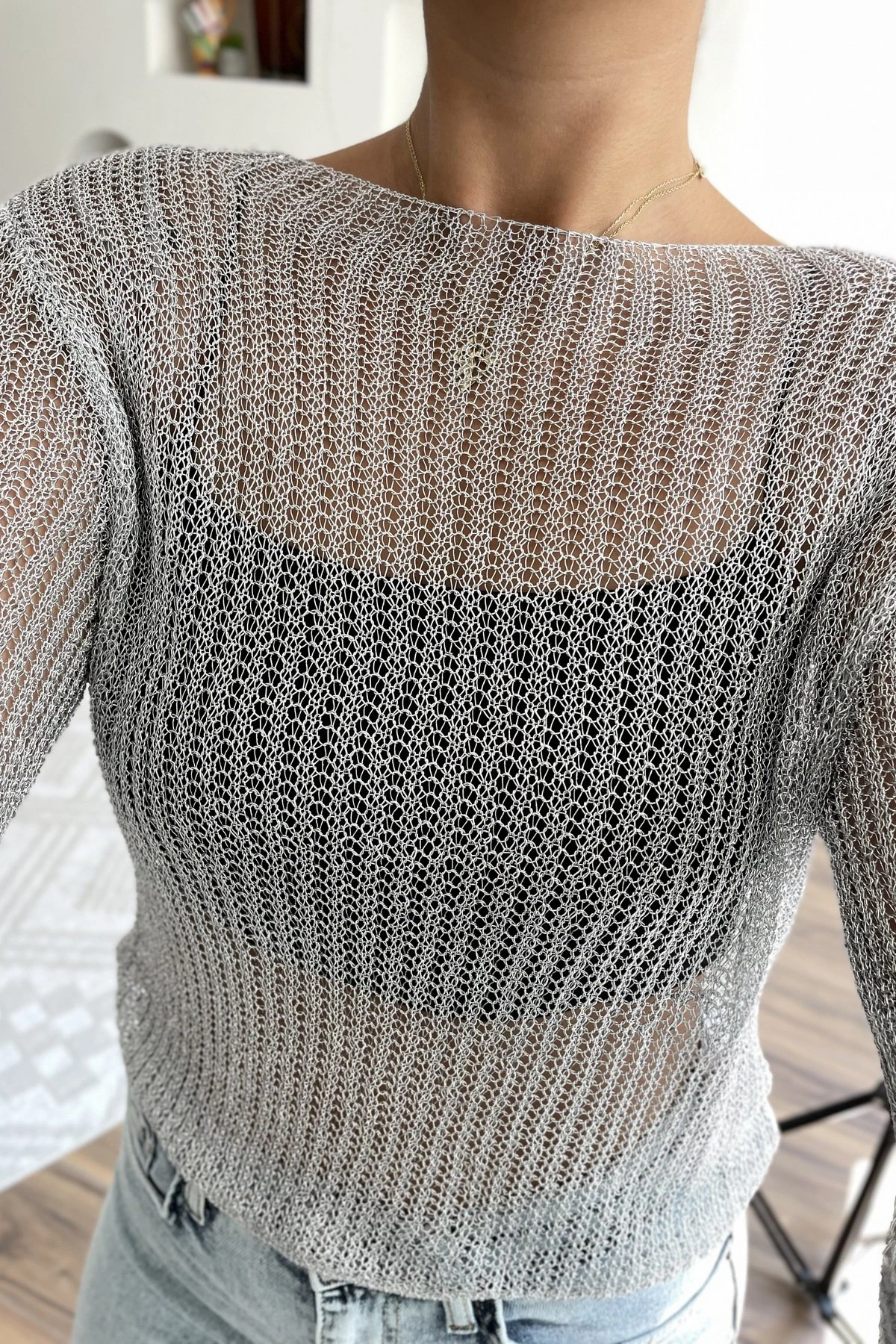 BİSİKLET YAKA AJURLU VİSKON TRİKO BLUZ – GÜMÜŞ