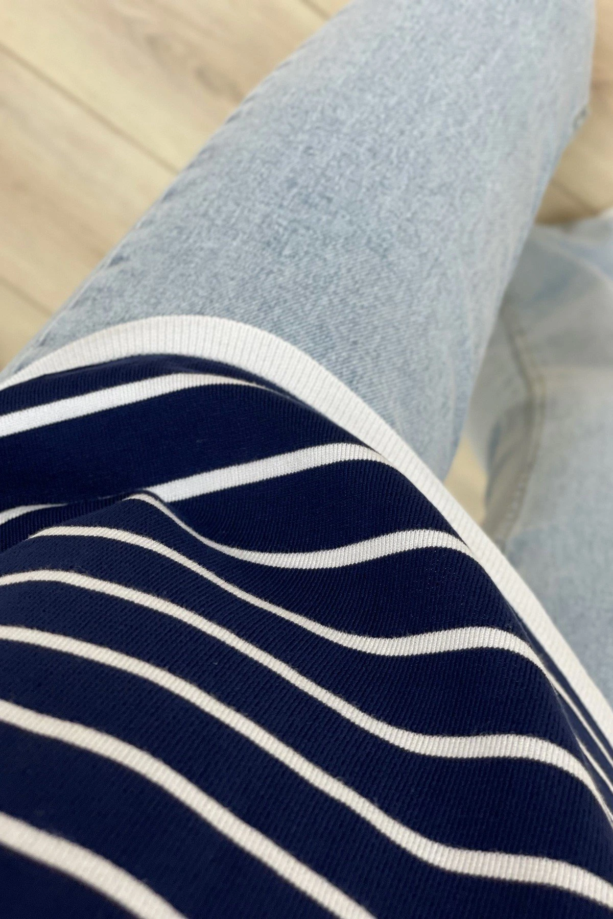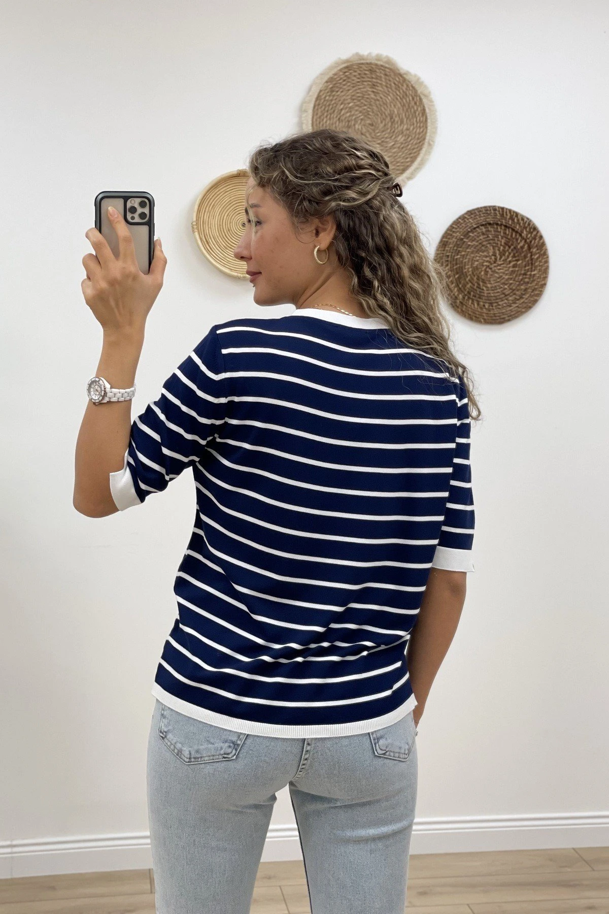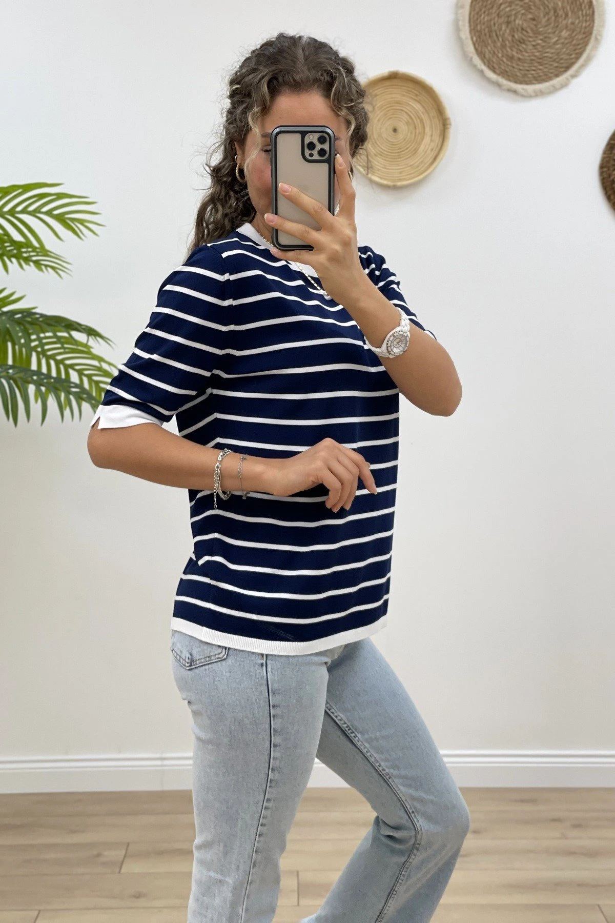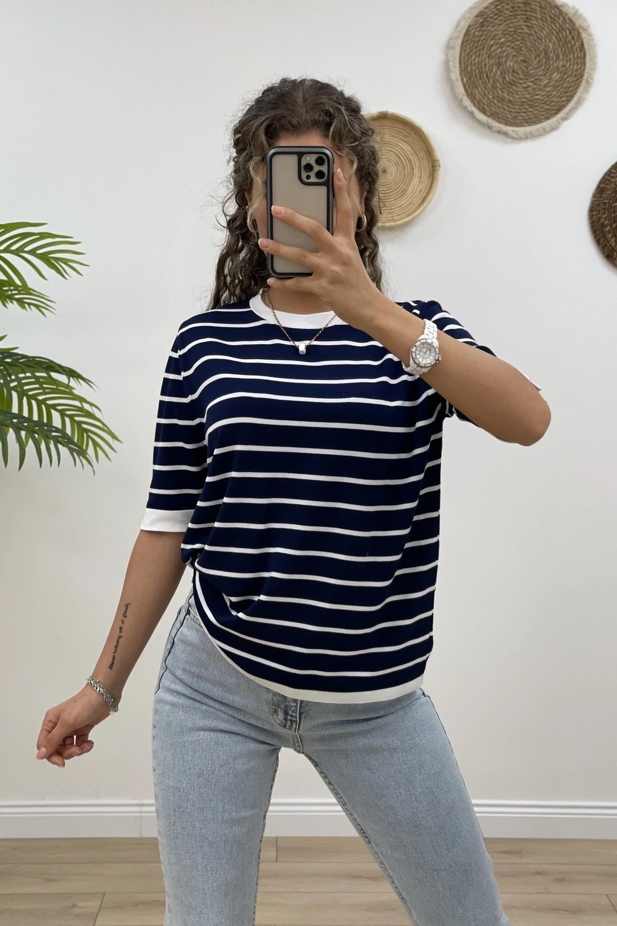 BİSİKLET YAKA ÇİZGİLİ KISA KOL VİSKON TRİKO – EKRU LACİVERT