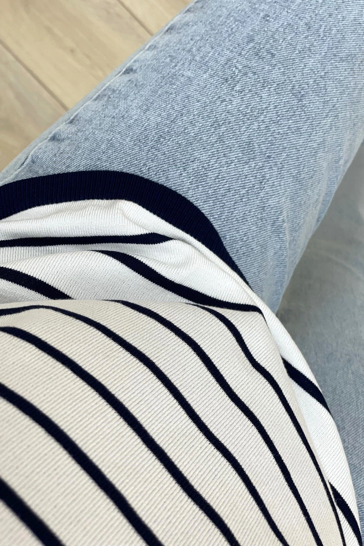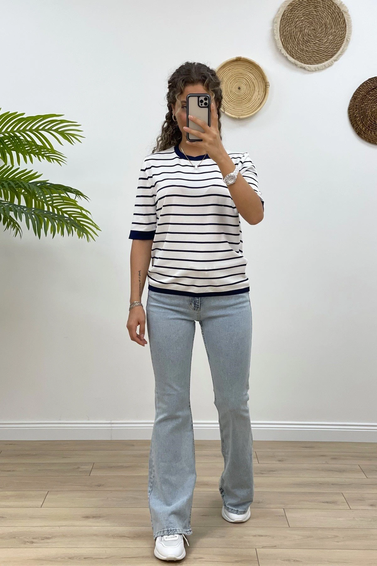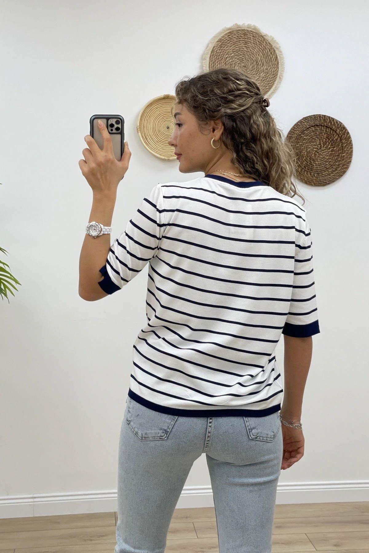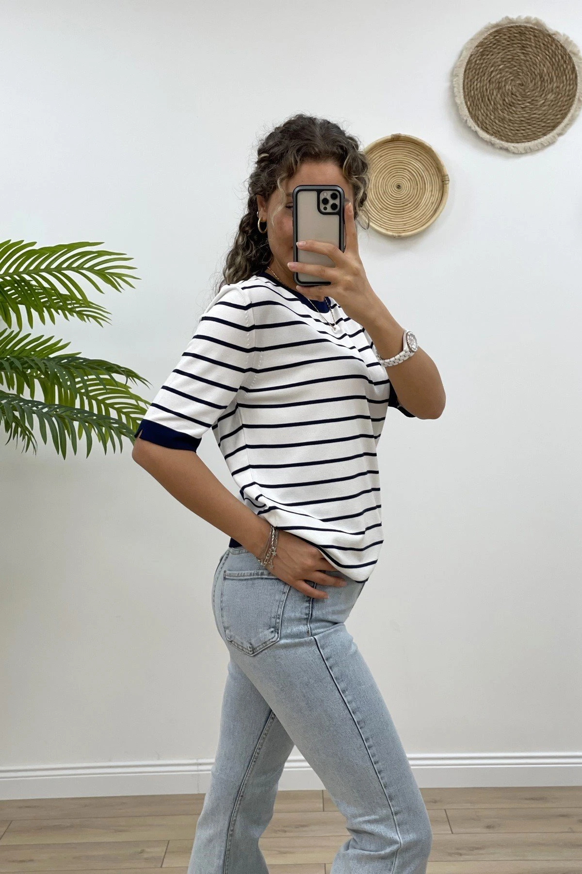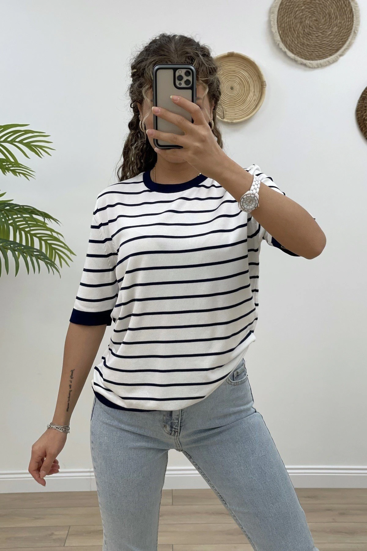 BİSİKLET YAKA ÇİZGİLİ KISA KOL VİSKON TRİKO – LACİVERT EKRU