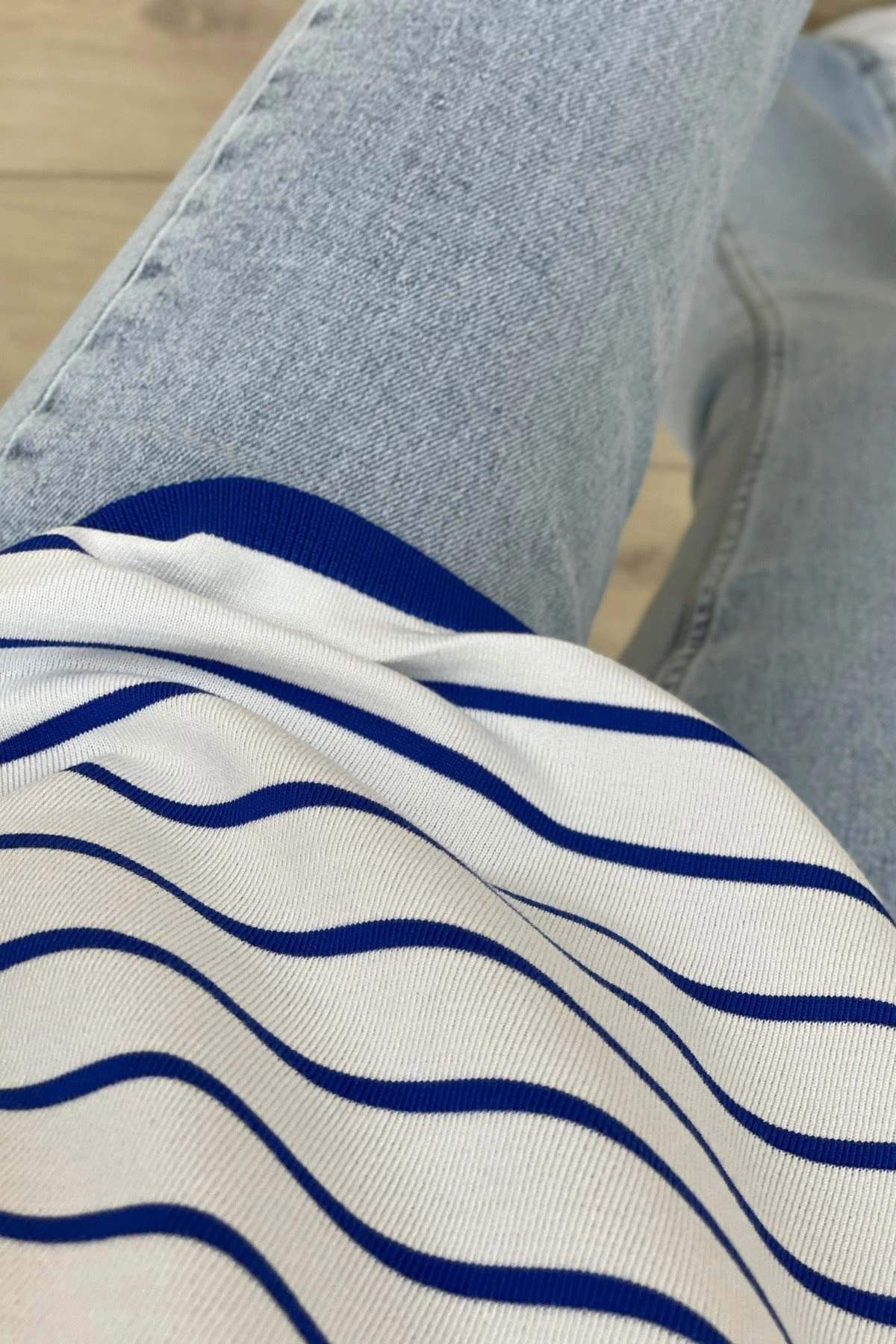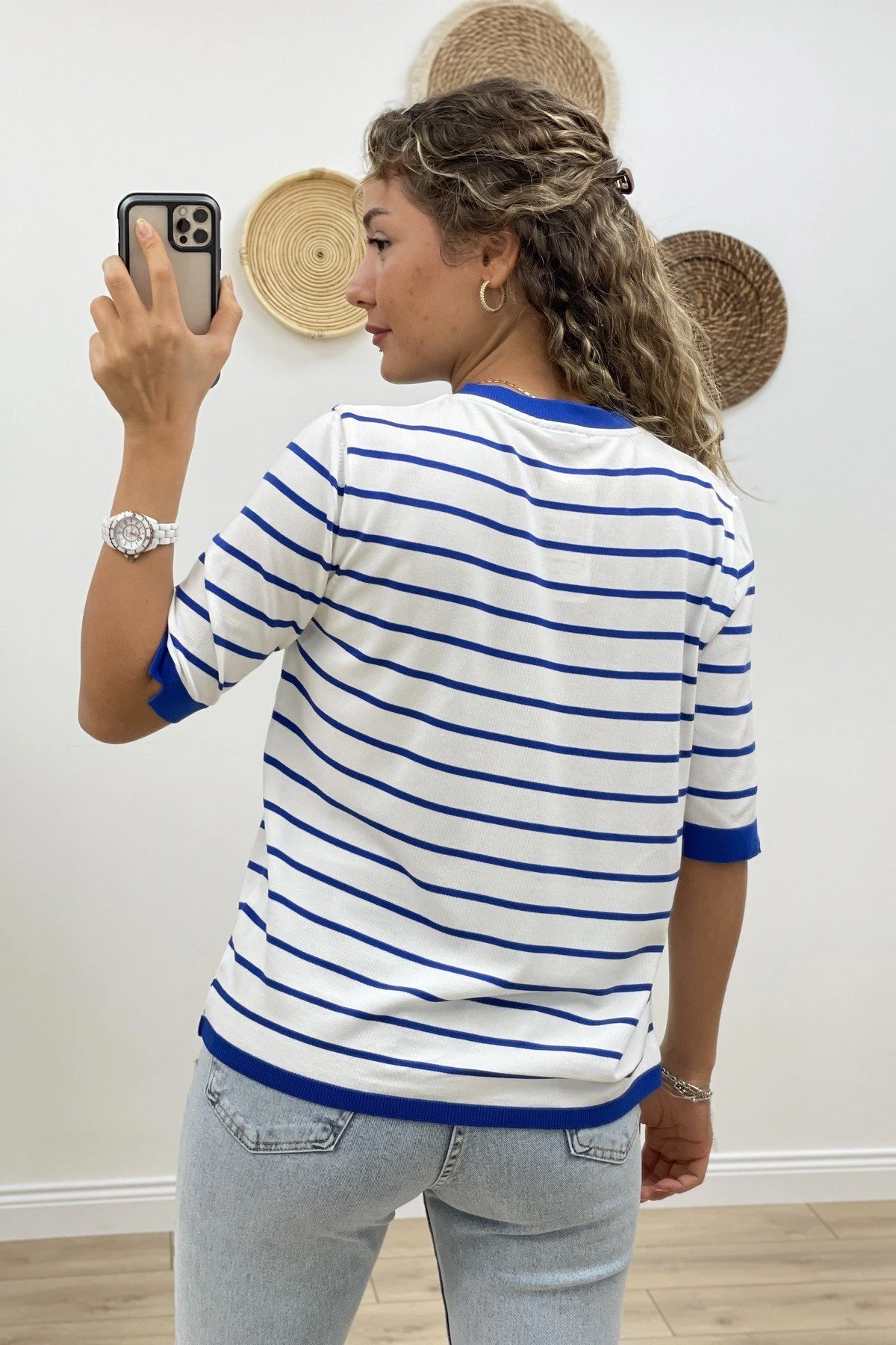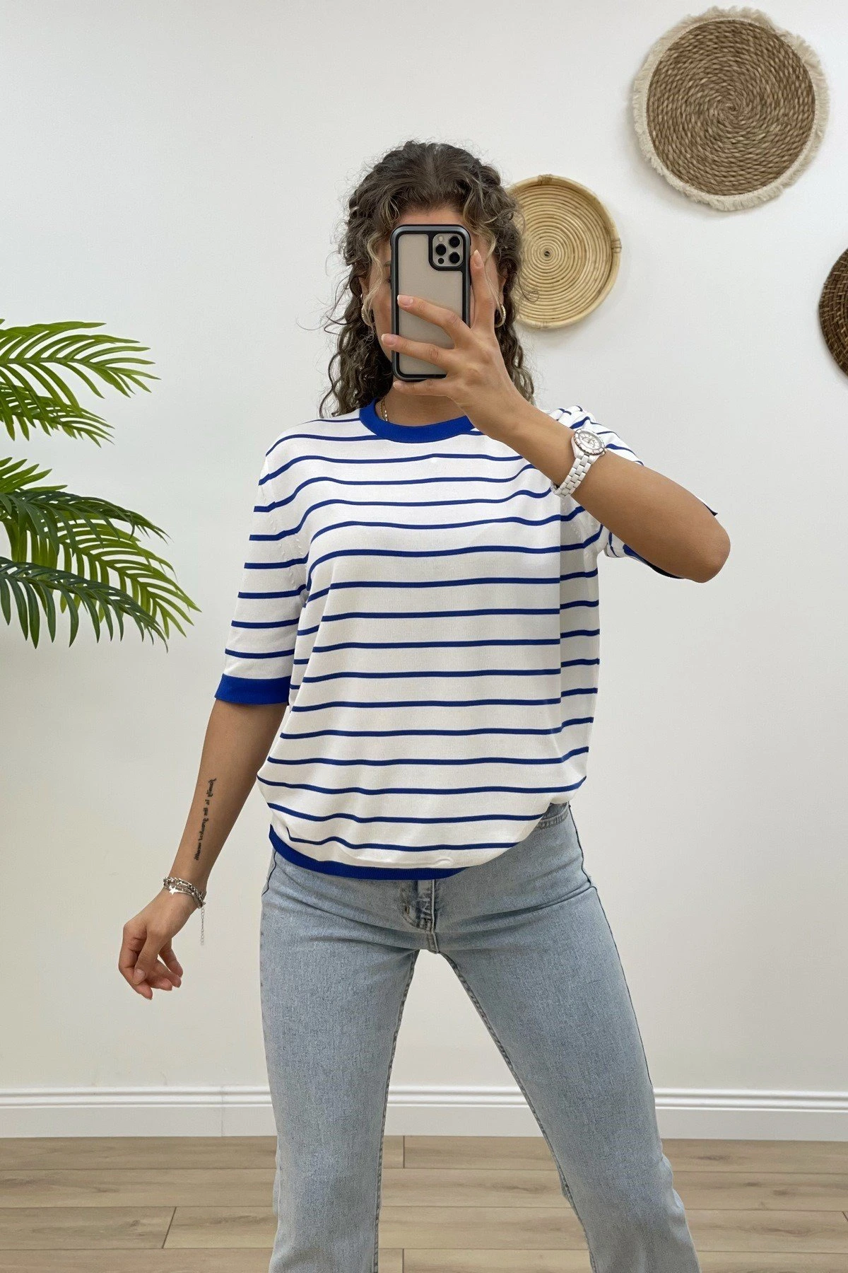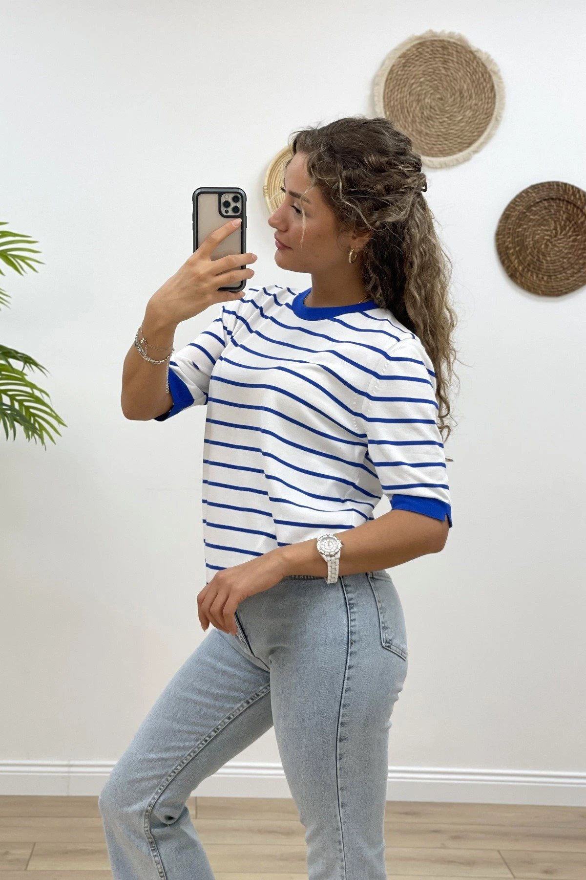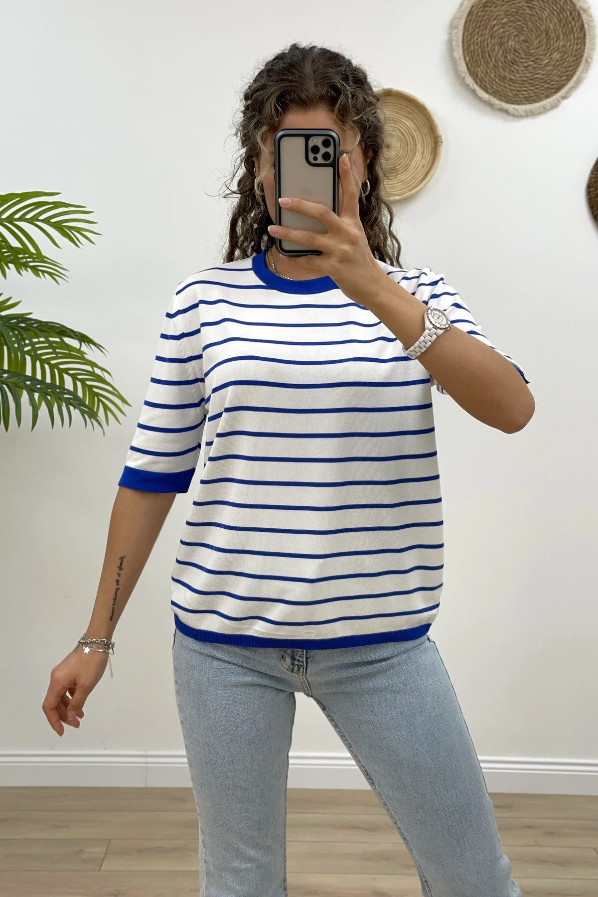 BİSİKLET YAKA ÇİZGİLİ KISA KOL VİSKON TRİKO – SAKS EKRU