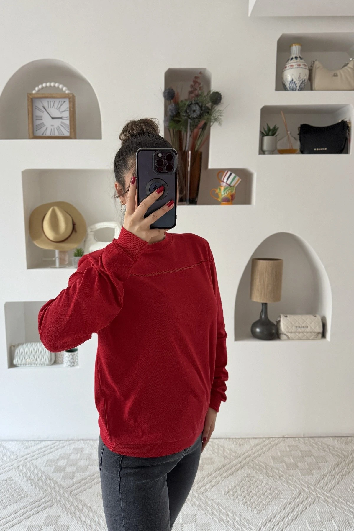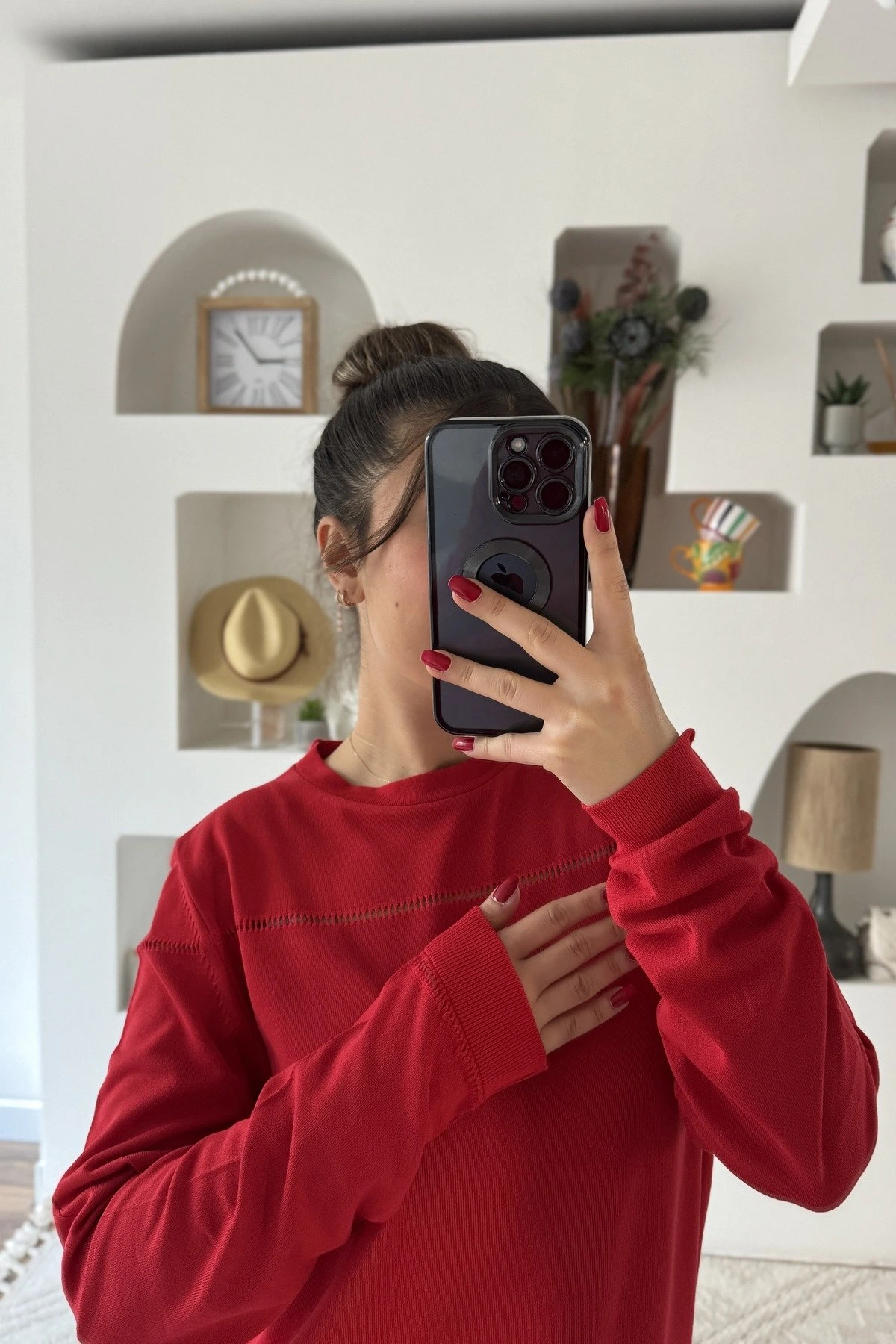 BİSİKLET YAKA ŞERİT AJURLU VİSKON KAZAK – KIRMIZI