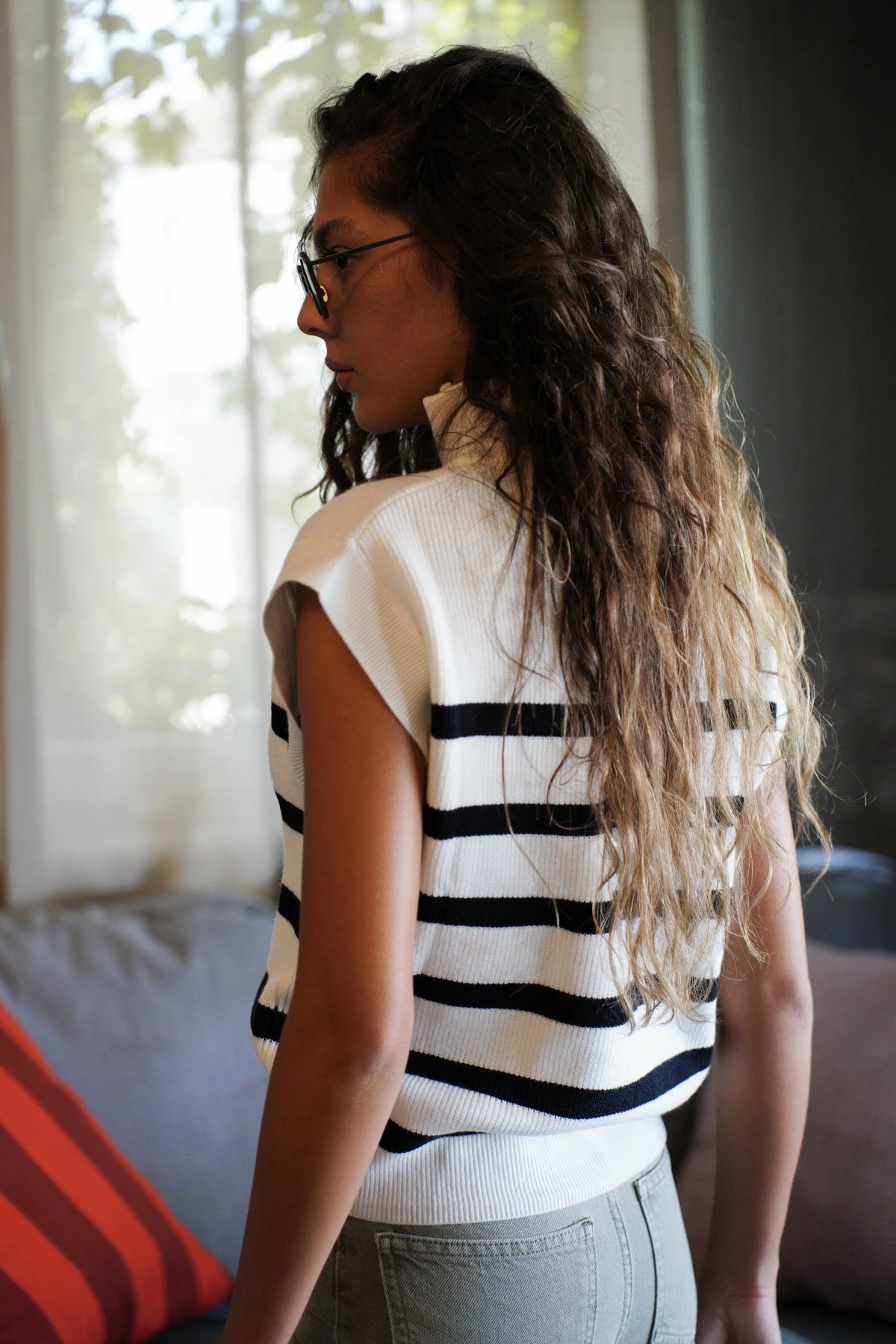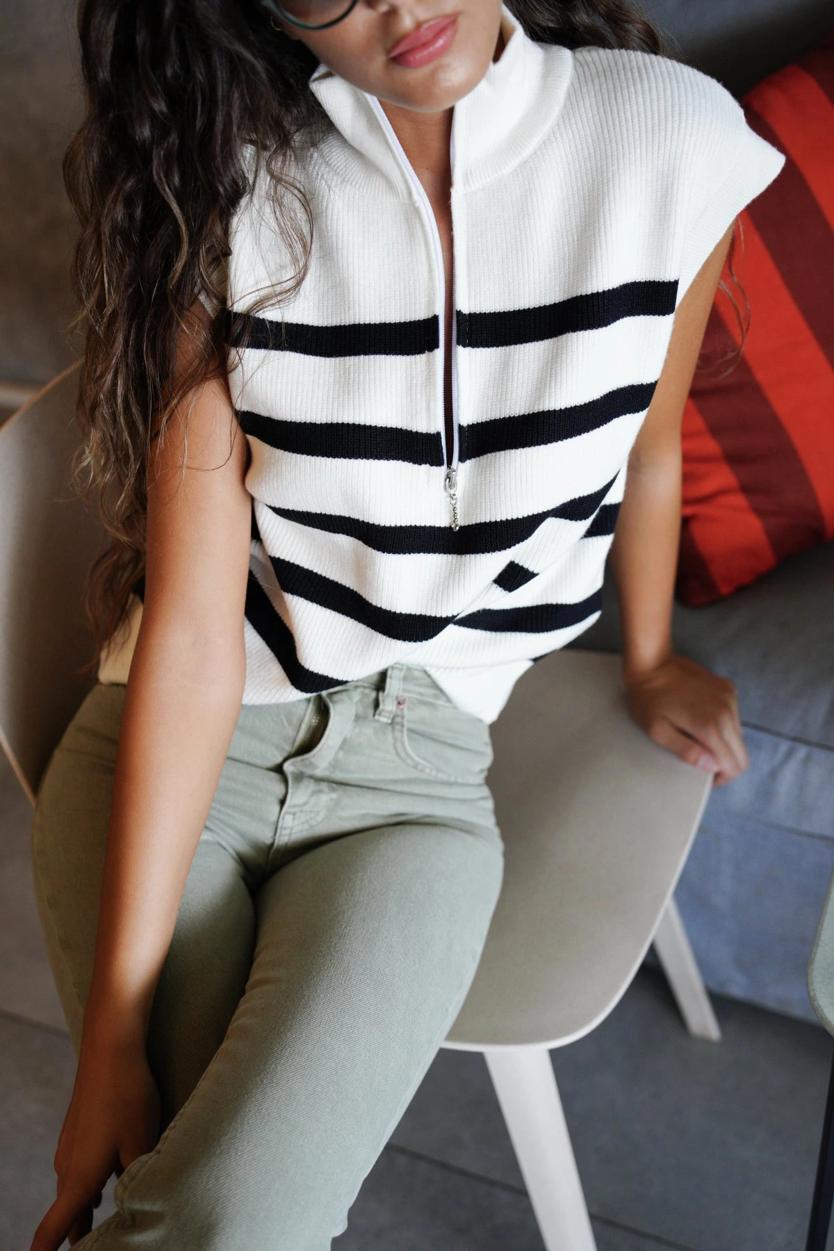 ÇİZGİLİ DİK YAKA FERMUARLI VİSKON SÜVETER – EKRU SİYAH