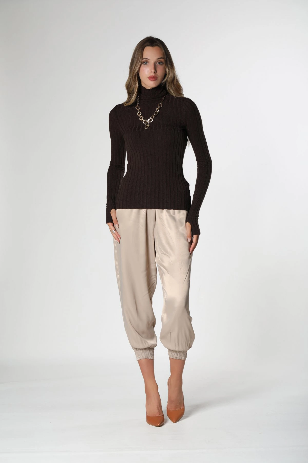 DİK YAKA PARMAK DETAY FİTİLLİ TRİKO – KAHVE