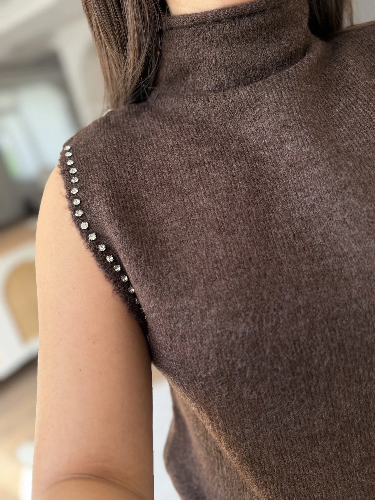 DİK YAKA SIFIR KOL TAŞ ZIMBA TRİKO – KAHVE
