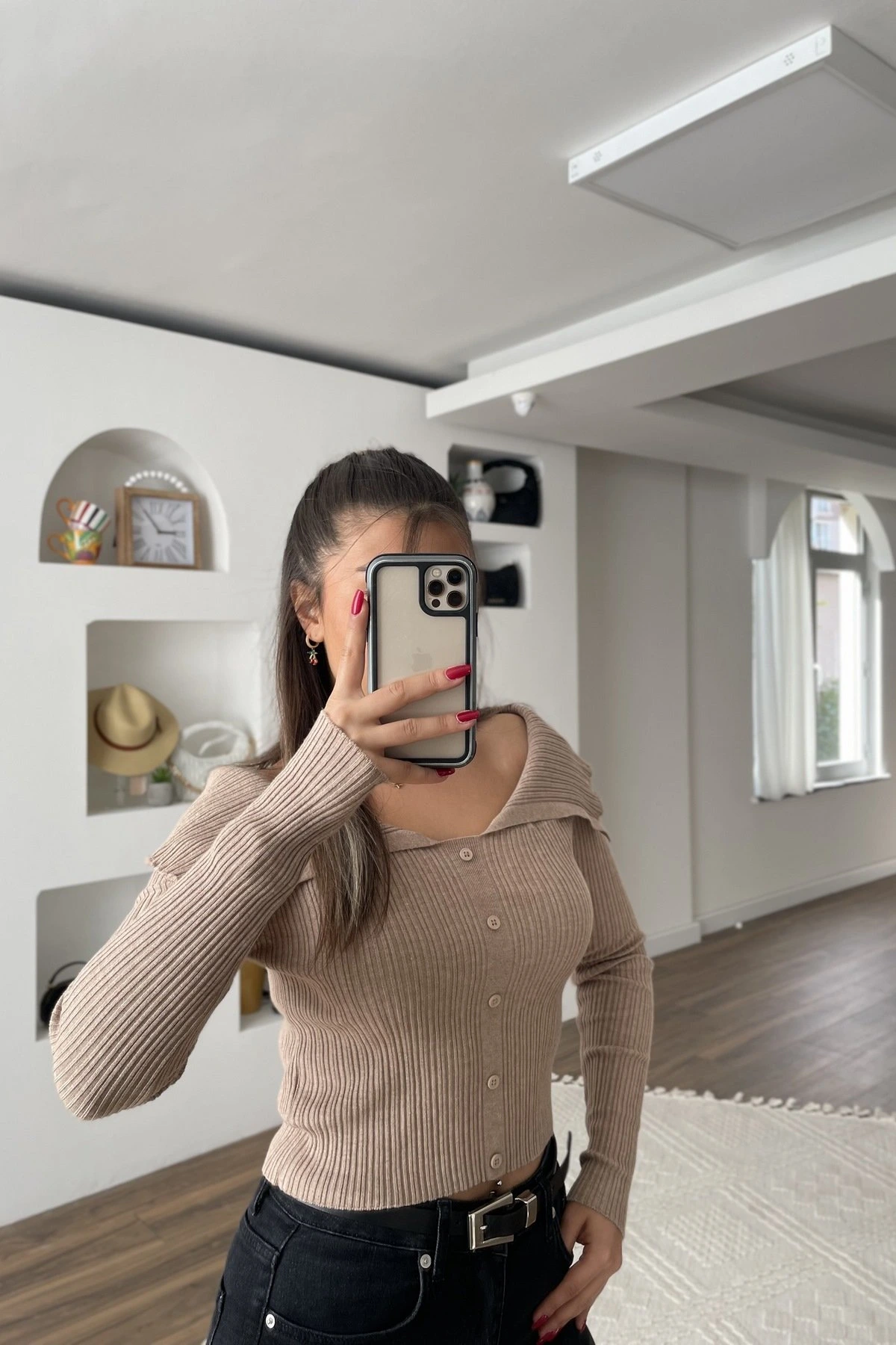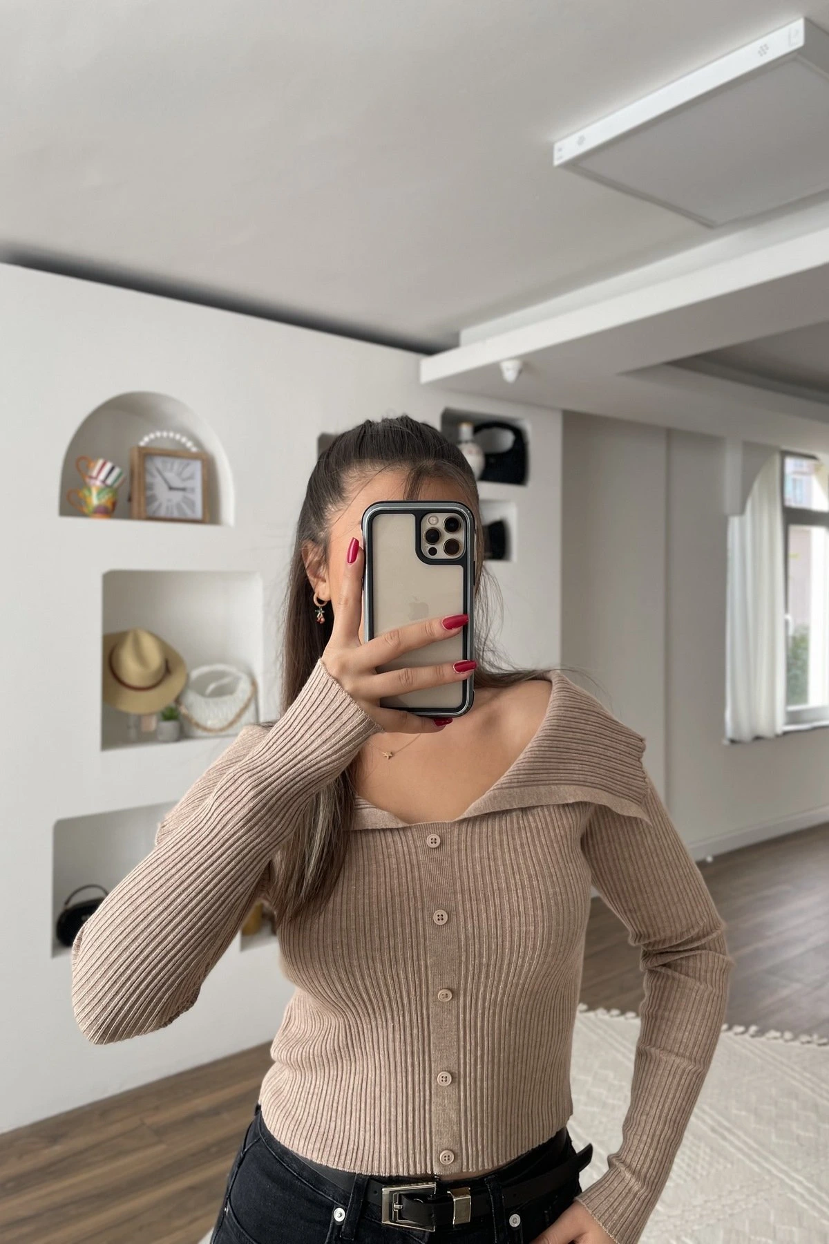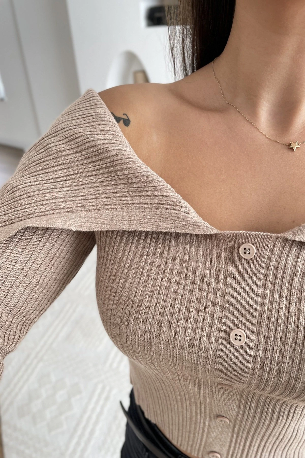DÜŞÜK OMUZ DÜĞME DETAY VİSKON FİTİLLİ TRİKO – CAMEL