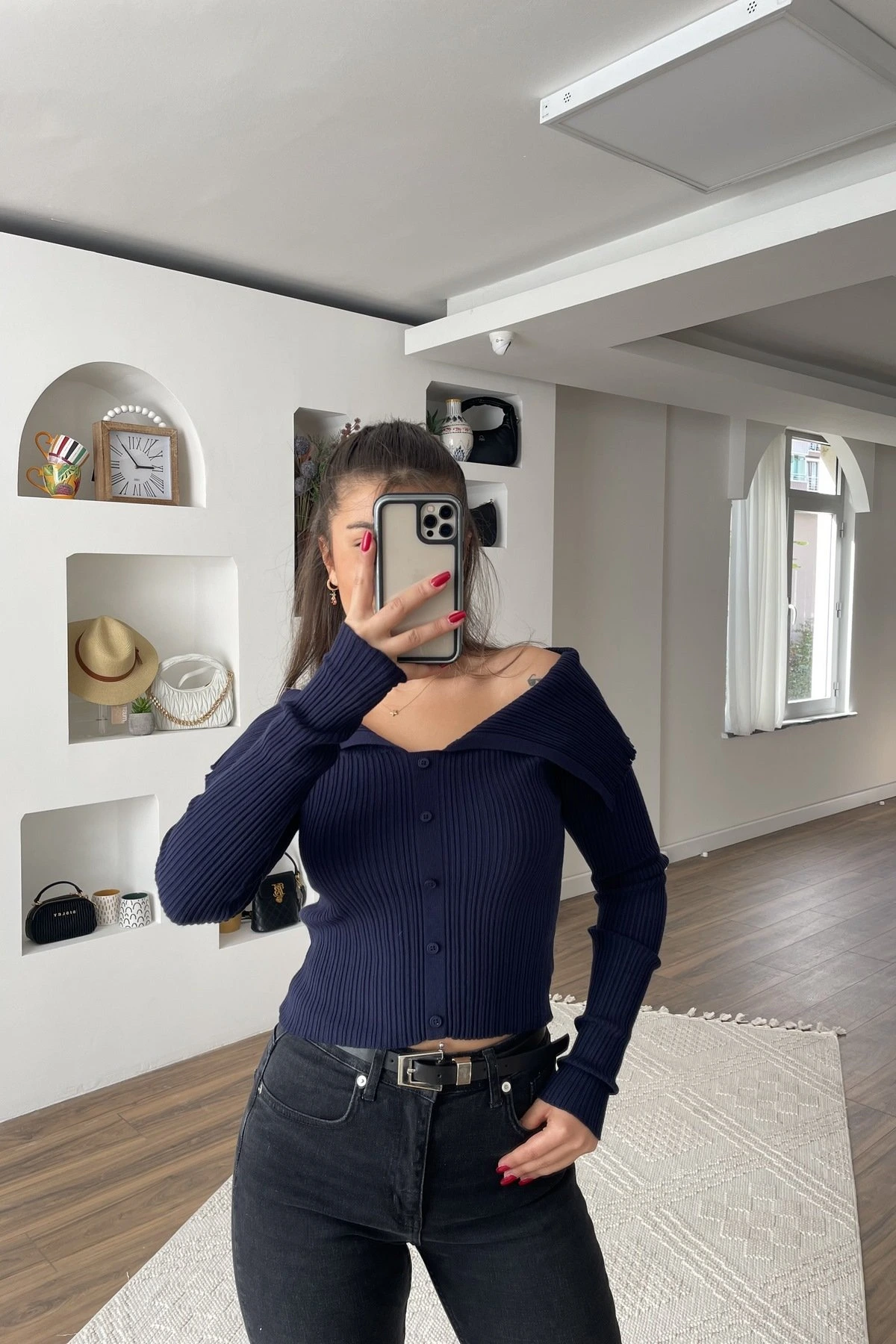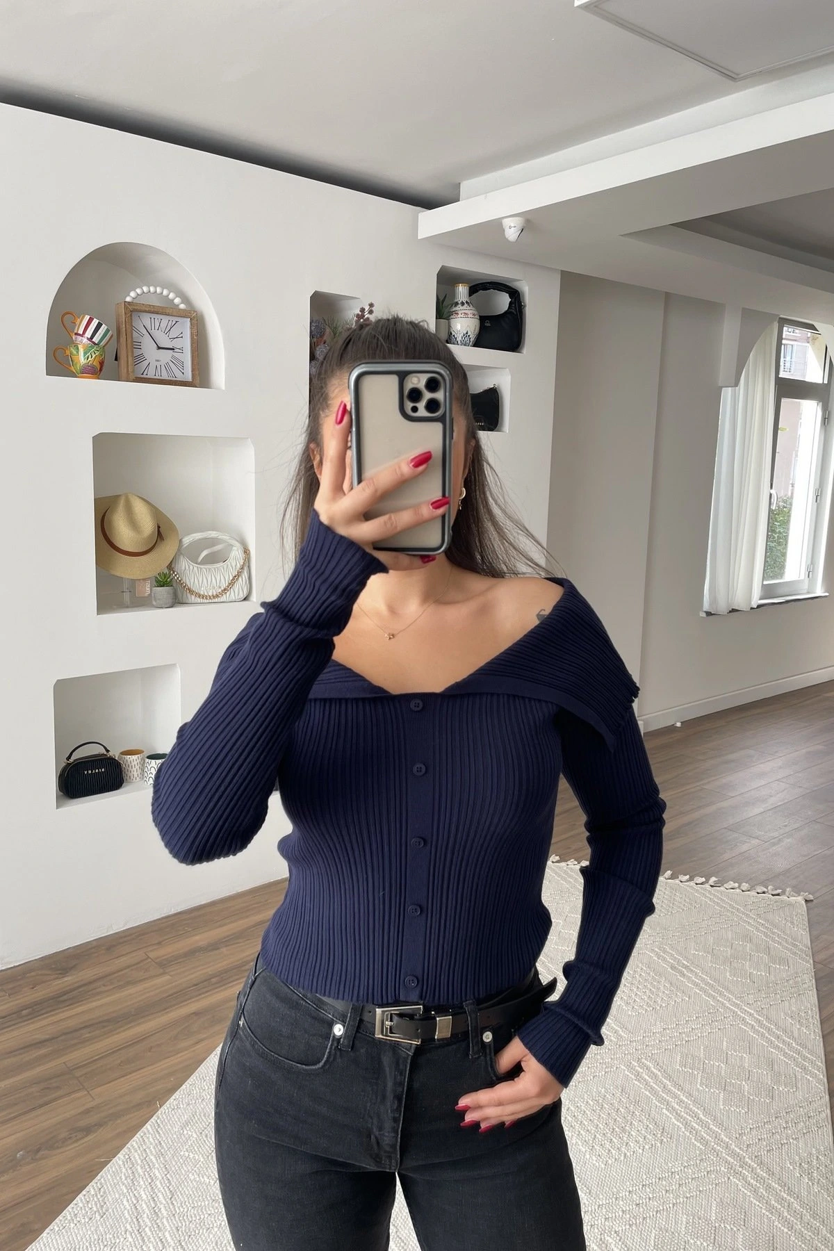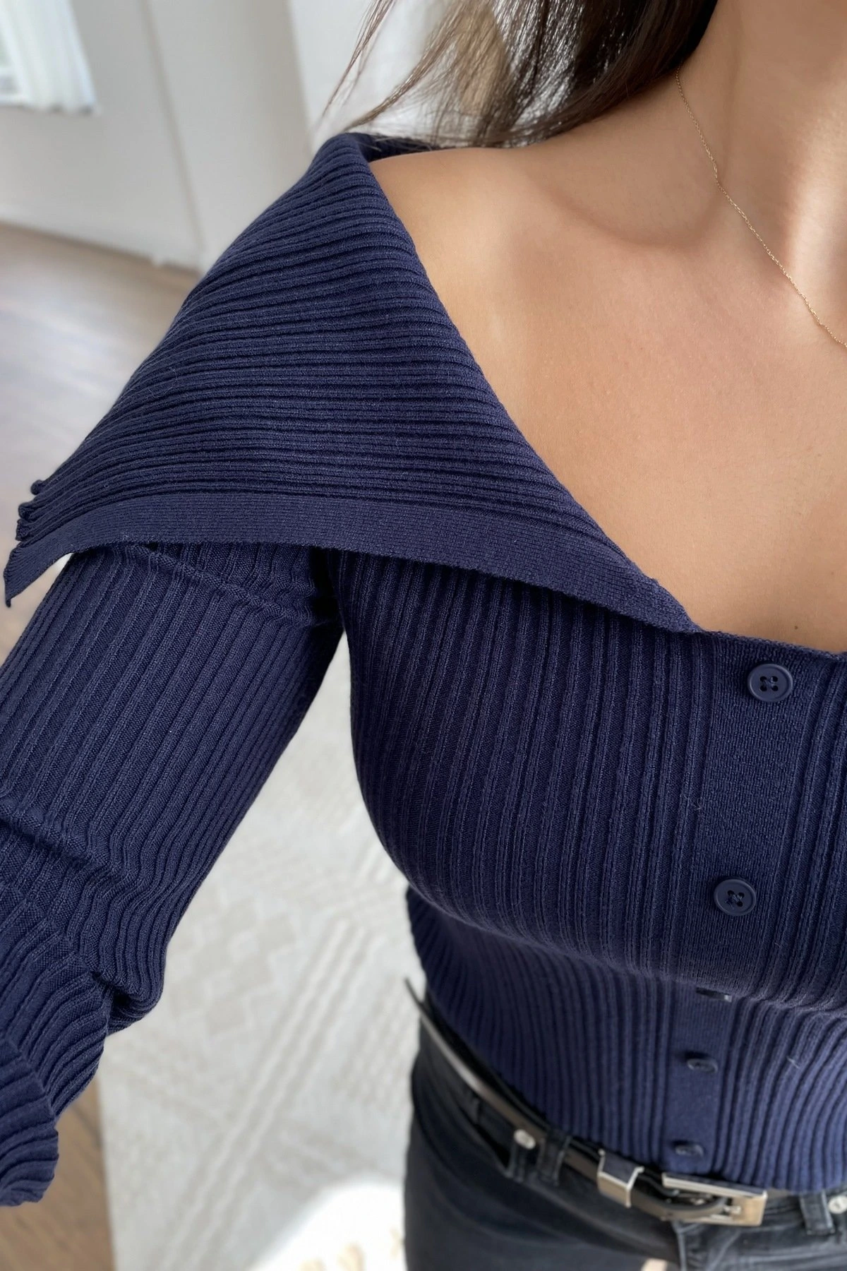 DÜŞÜK OMUZ DÜĞME DETAY VİSKON FİTİLLİ TRİKO – LACİVERT
