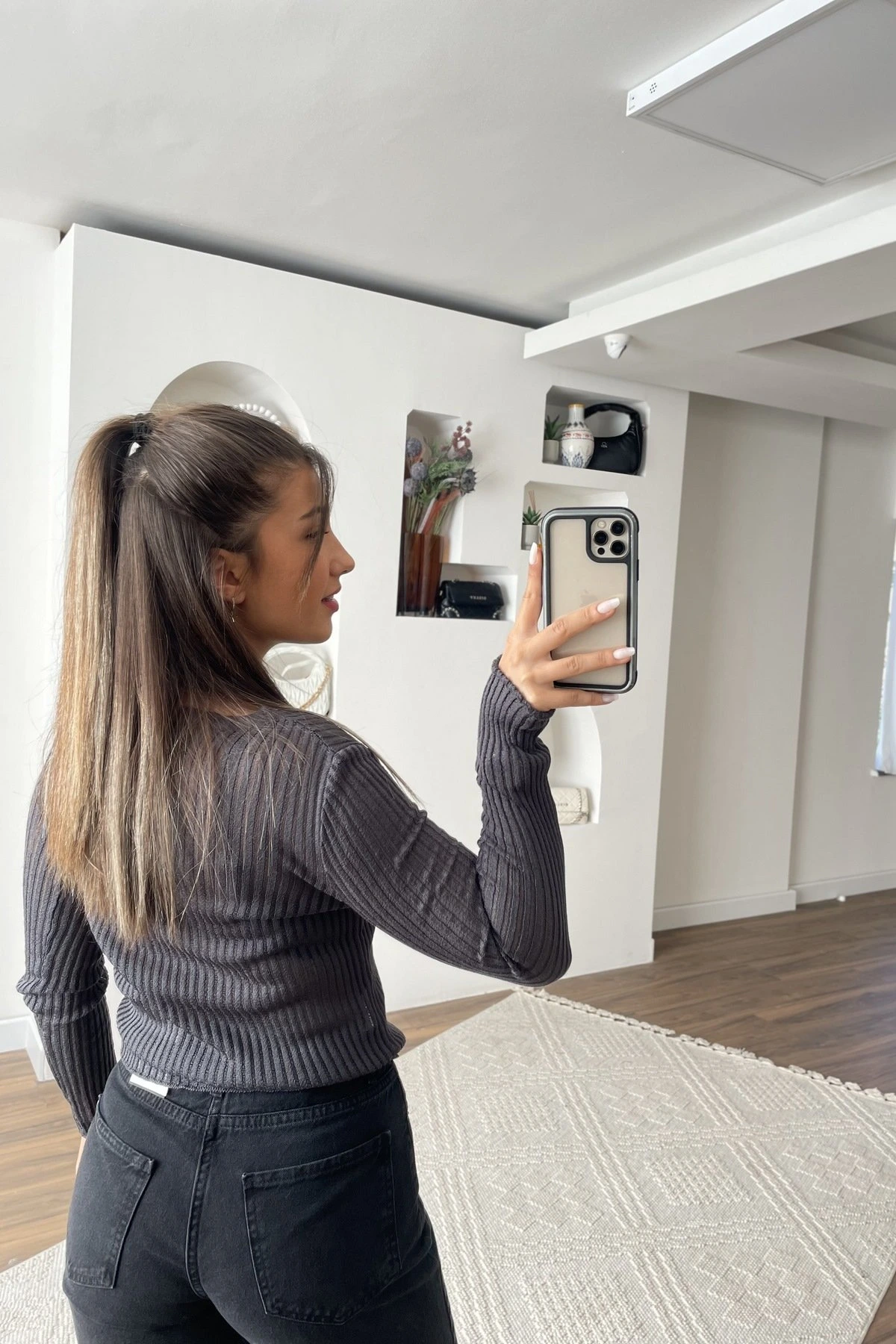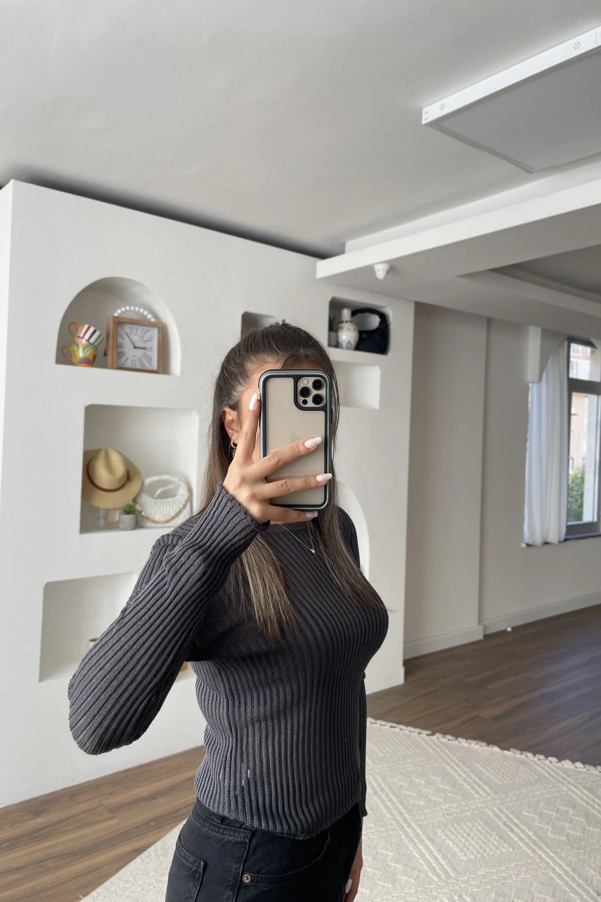 FİTİLLİ AJURLU BİSİKLET YAKA TRİKO – FÜME