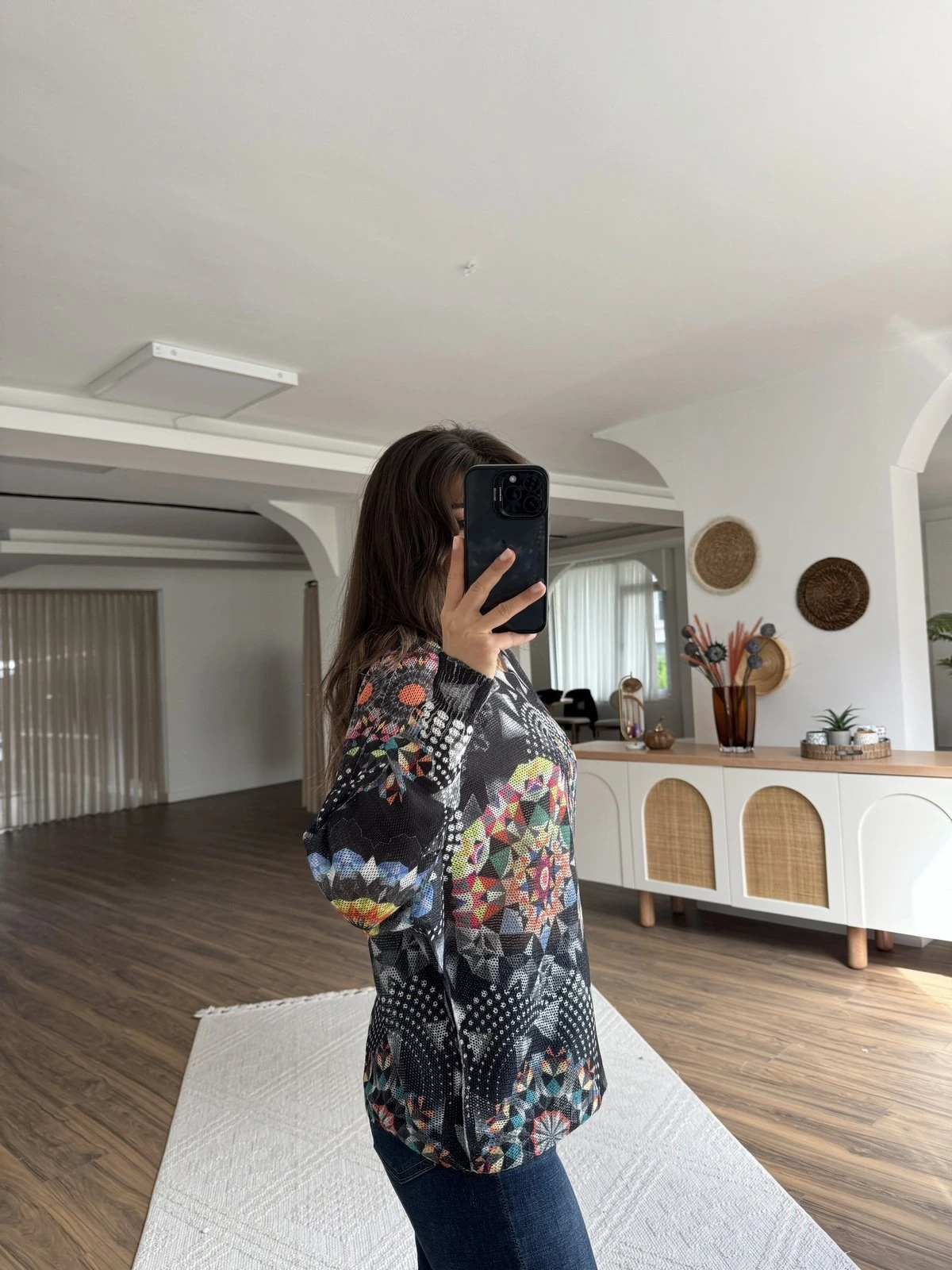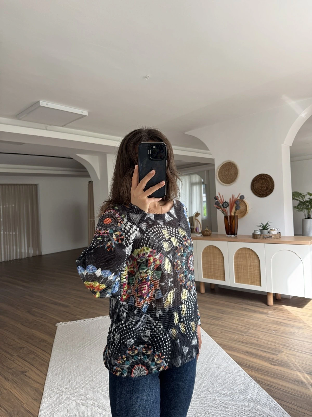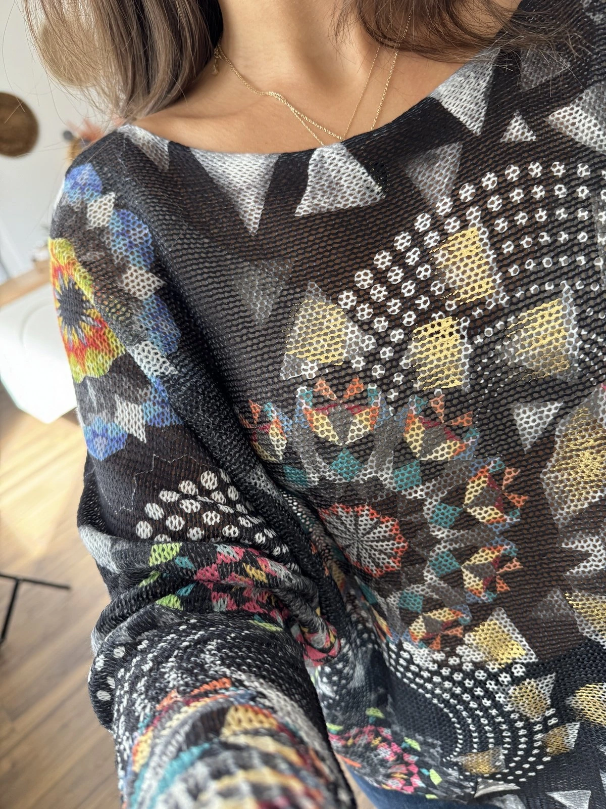 GEOMETRİK RENKLİ DESEN KAYIK YAKA VİSKON TRİKO – ANTRASİT