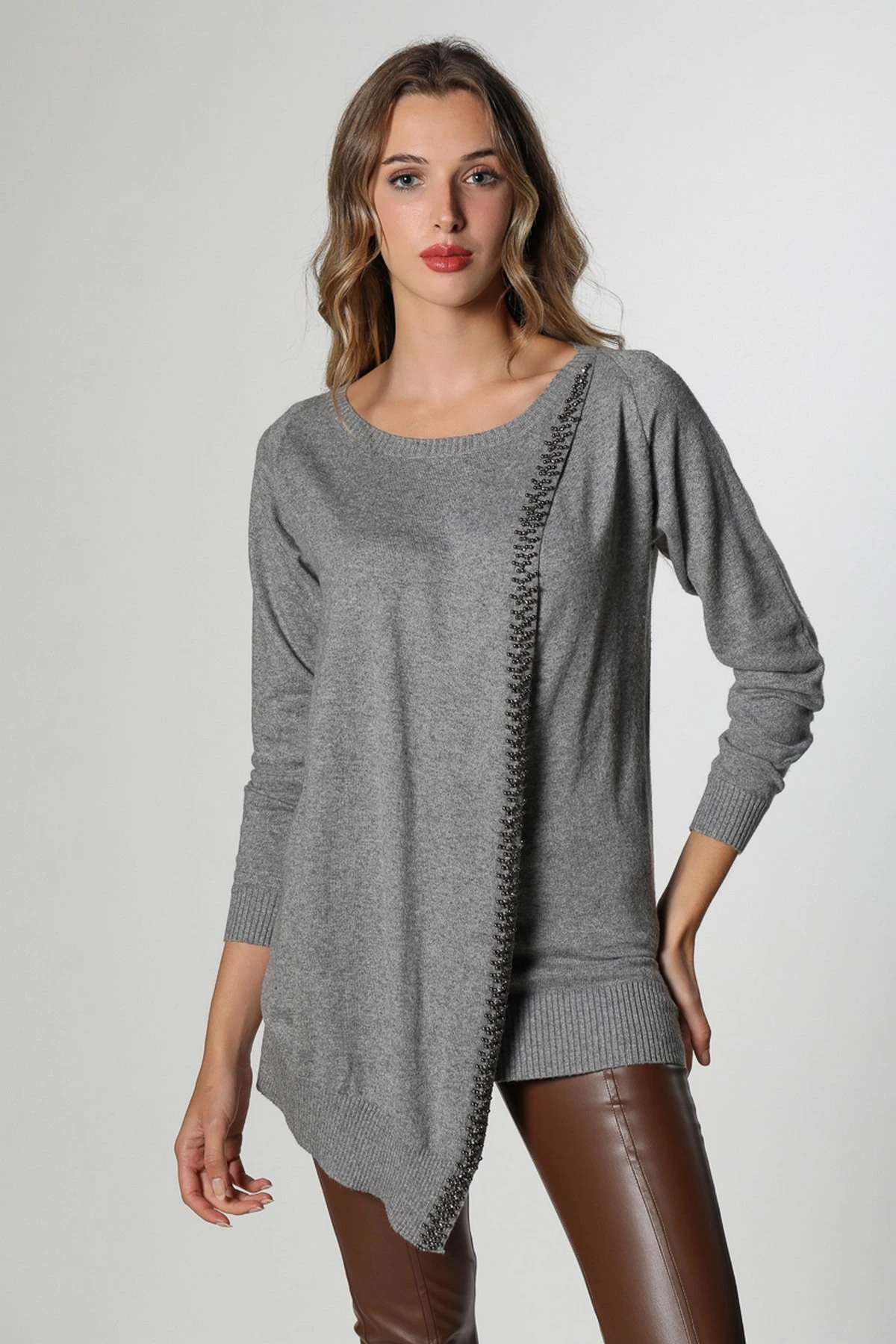 İTHAL ÖN KAPAK VE BONCUK DETAY TRİKO – GRİ