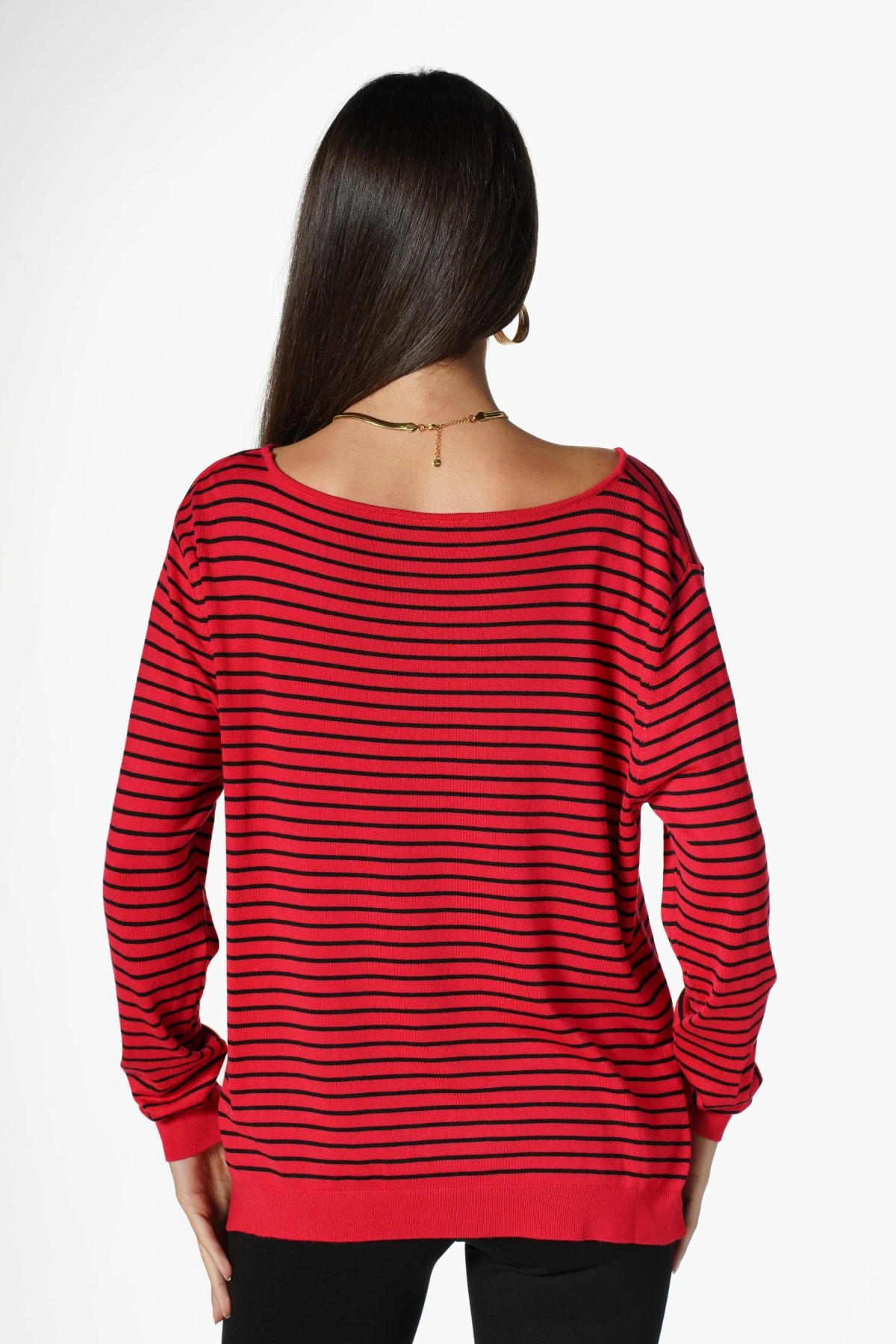 KAYIK YAKA ETEK YIRTMAÇ ÇİZGİLİ TRİKO – KIRMIZI SİYAH