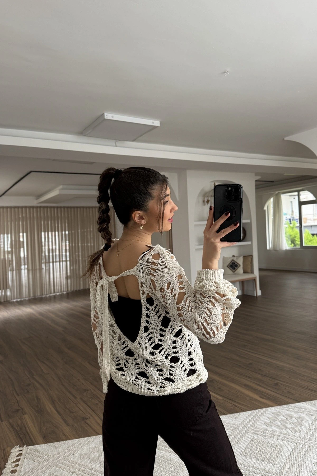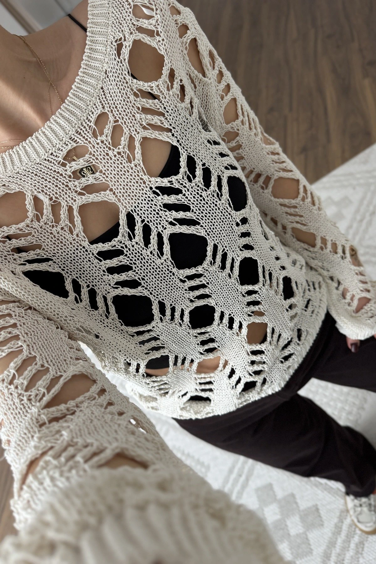 KAYIK YAKA SIRT DEKOLTE BAĞLAMALI AJURLU PAMUK TRİKO – EKRU