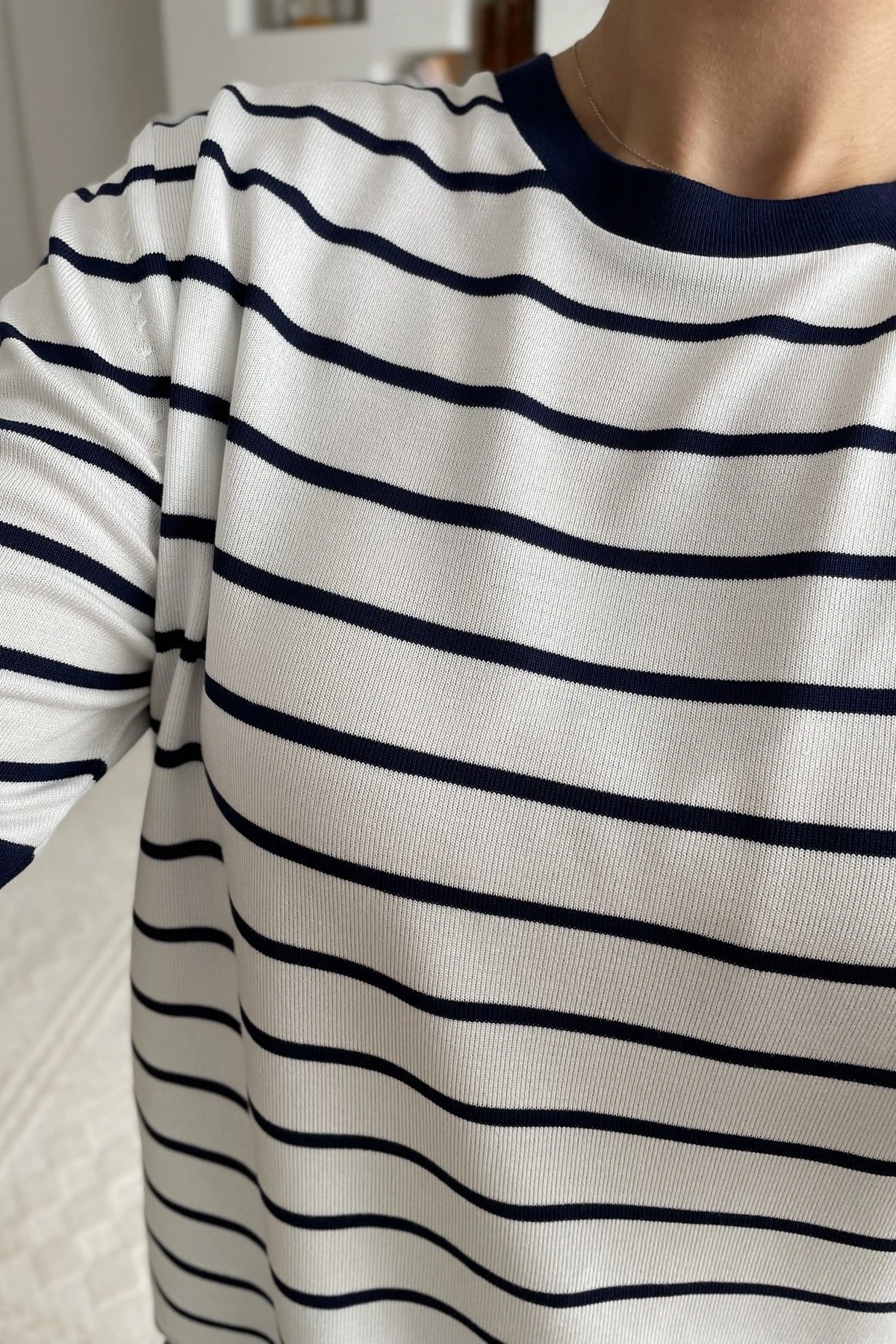 KISA KOL ÇİZGİLİ BASİC VİSKON TRİKO – EKRU LACİVERT