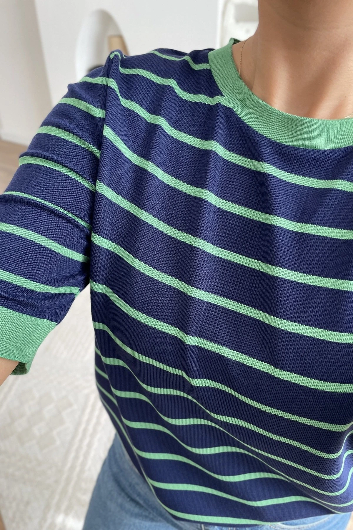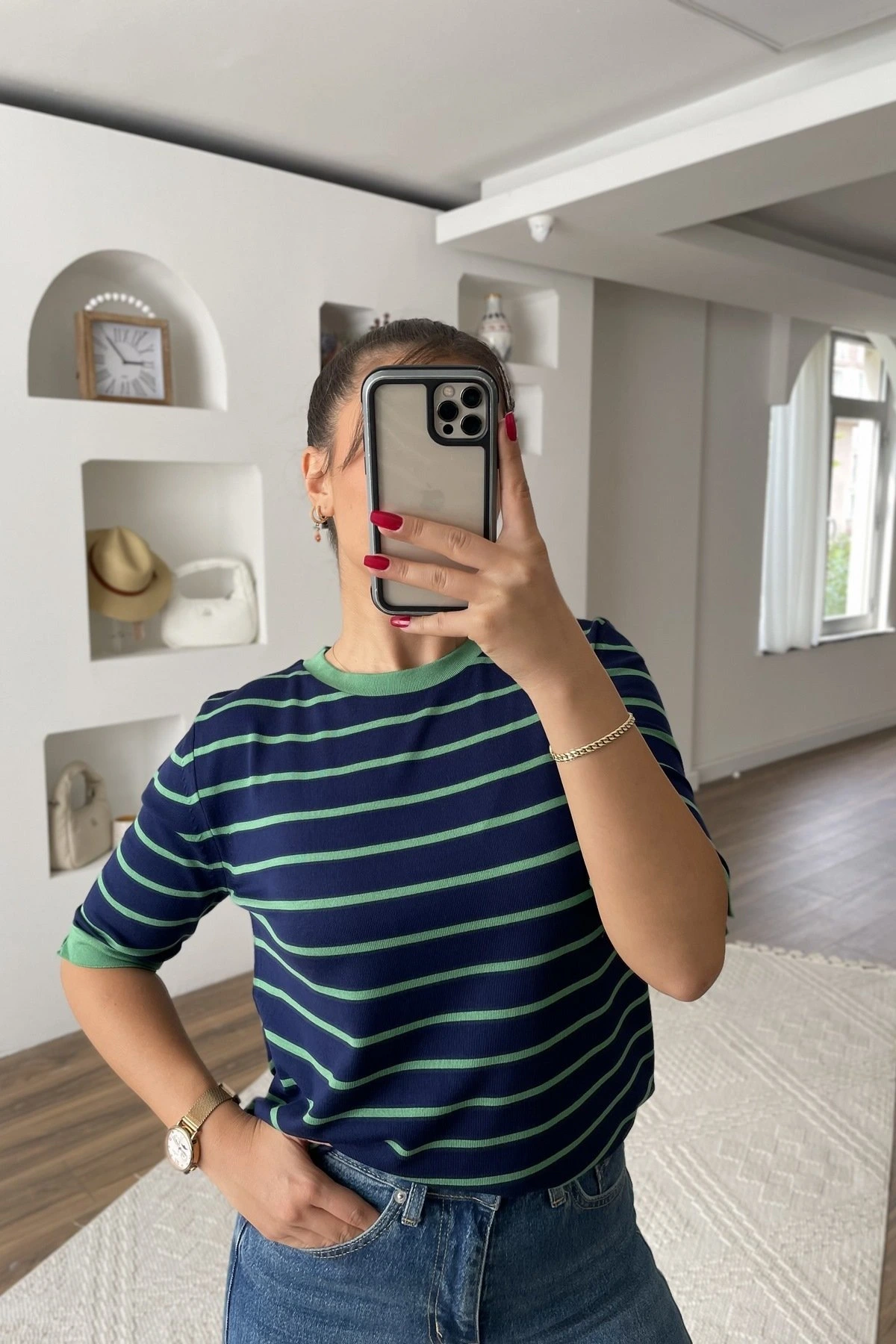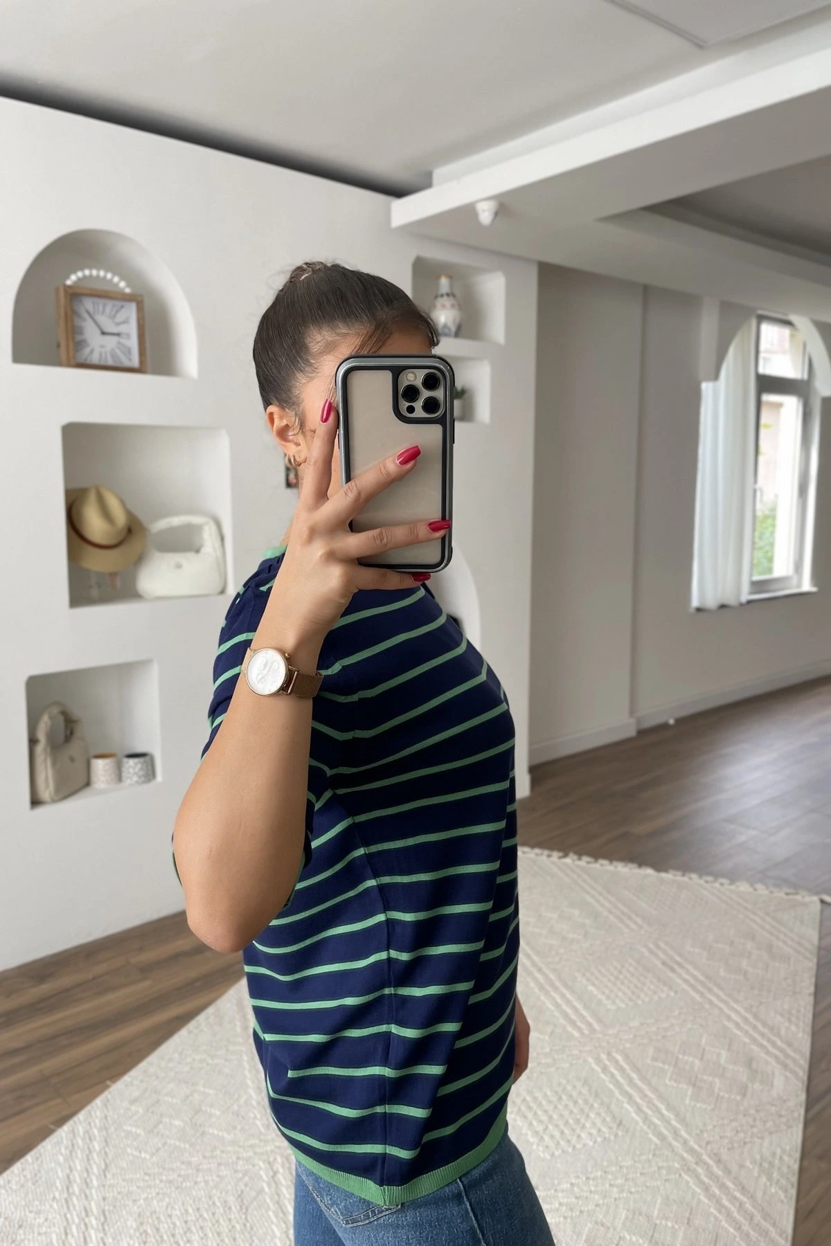 KISA KOL ÇİZGİLİ BASİC VİSKON TRİKO – LACİVERT YEŞİL